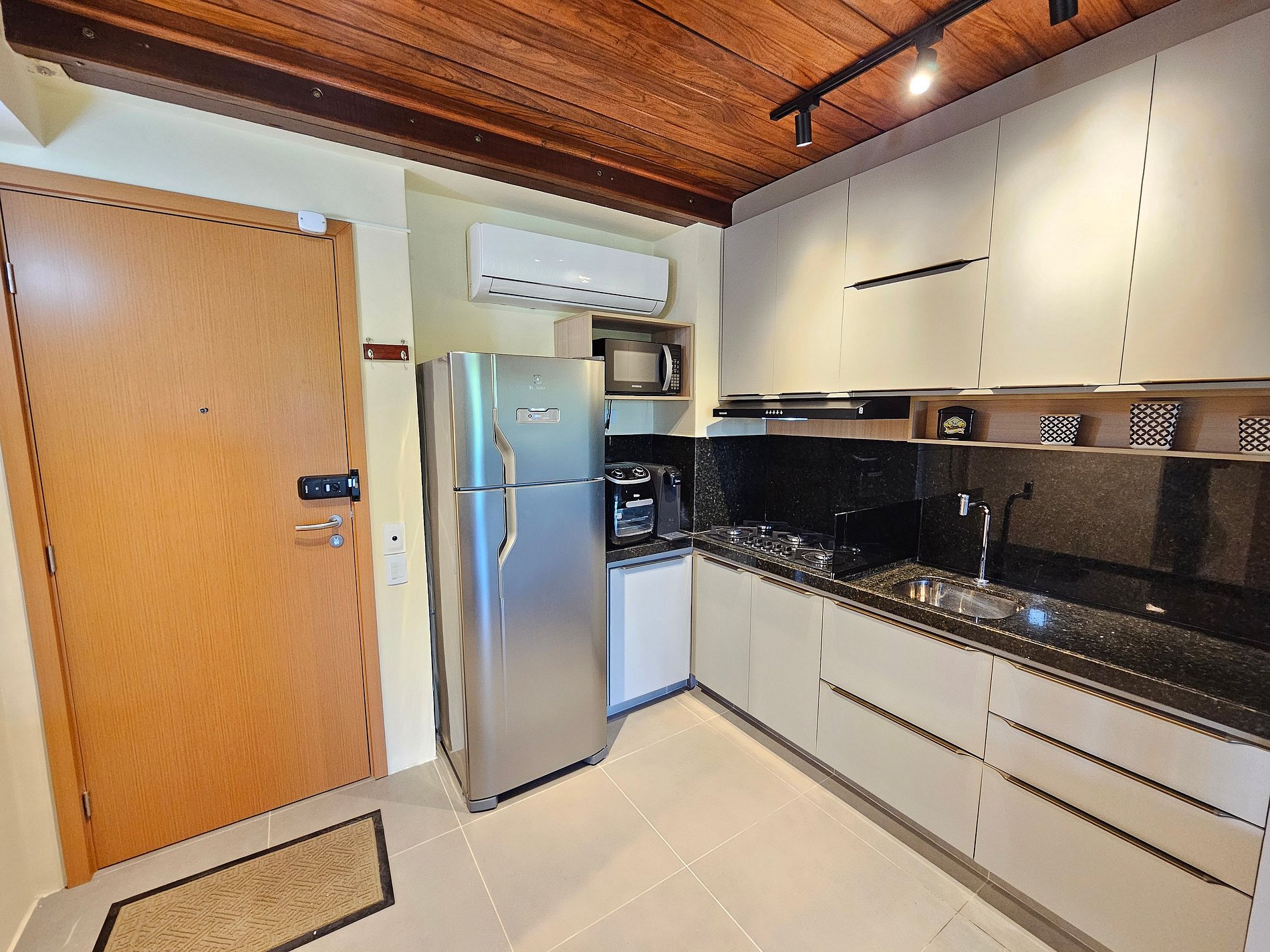 Cozinha - Espaço equipado com geladeira, fogão cooktop, micro-ondas, airfryer, cafeteira elétrica, além de louças, talheres, copos e demais utensílios.