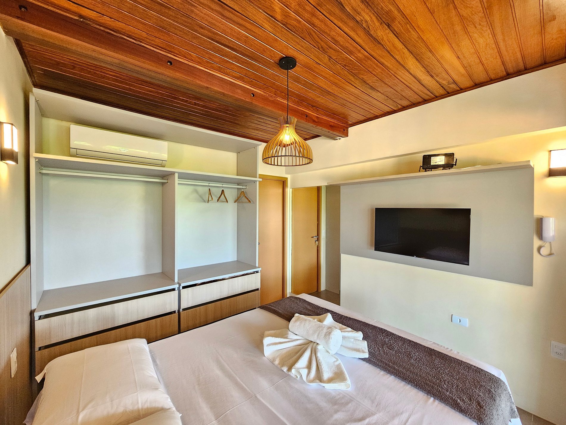 Este apartamento acomoda até 6 hóspedes em ambientes climatizados, dispondo de uma varanda relaxante com vista para o mar e o coqueiral. A unidade conta com cozinha equipada e dois banheiros completos para maior comodidade durante a estadia. O condomínio Carneiros Atlântico oferece estrutura de lazer completa com piscinas, academia, estacionamento, minimercado 24h, elevador e restaurante em localização privilegiada à beira-mar da Praia dos Carneiros.