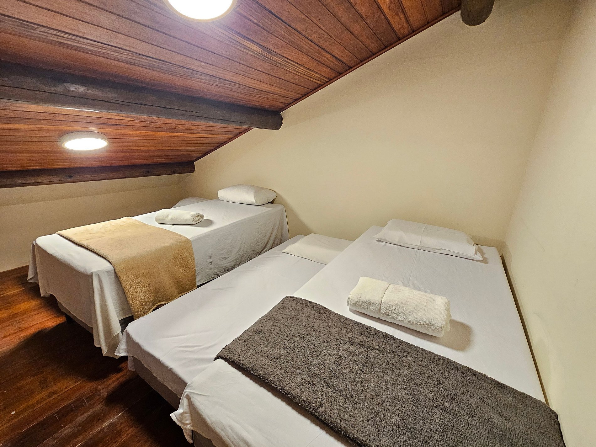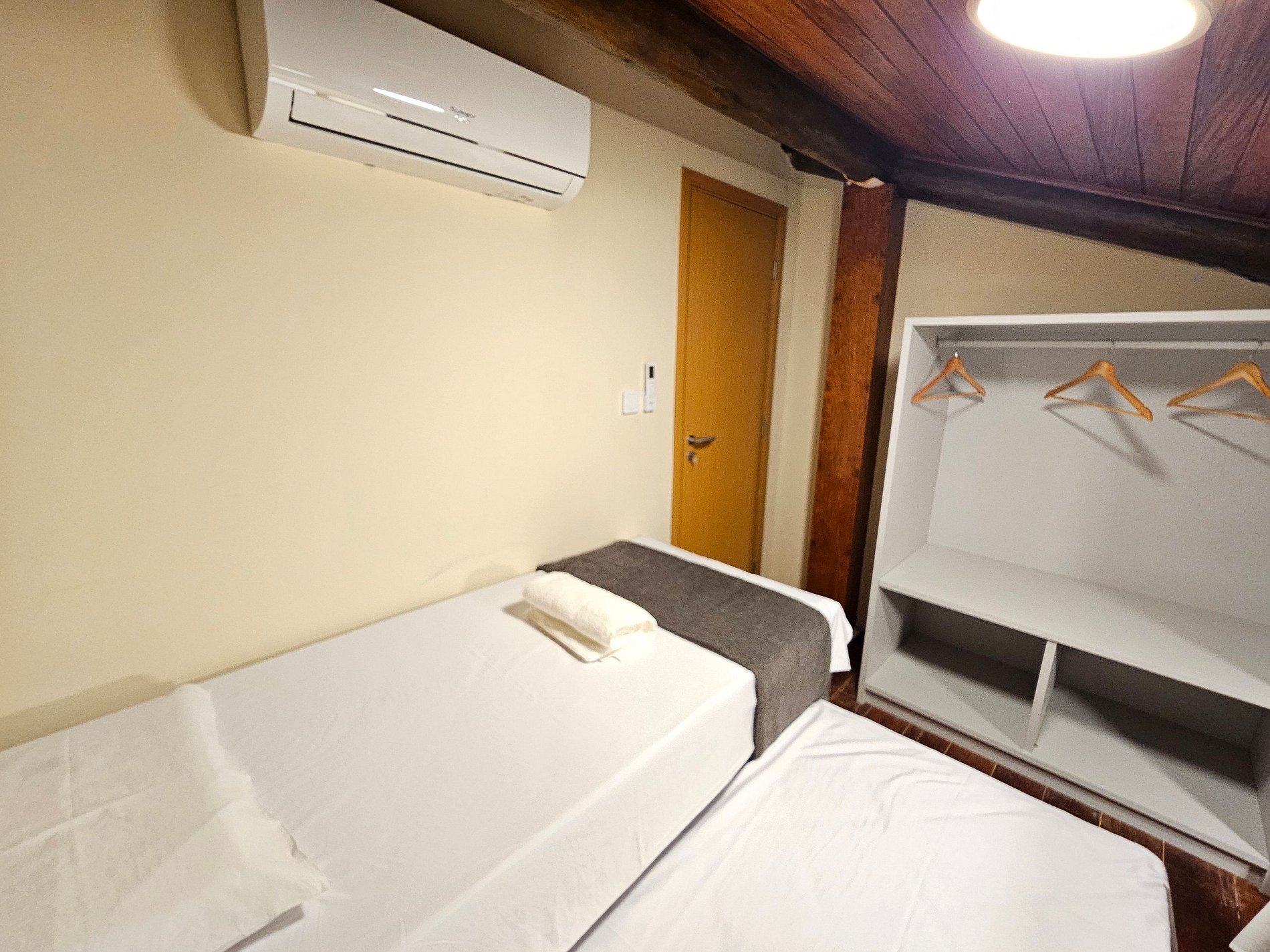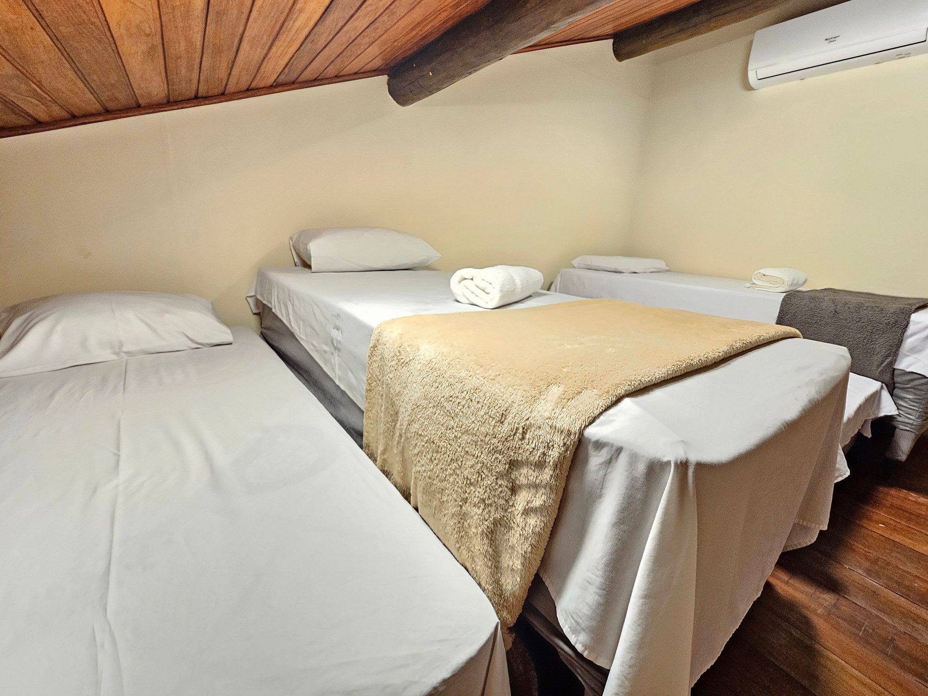 Acomodação para até 06 hóspedes com ar-condicionado, Wi-Fi, TV e lavanderia. O imóvel é distribuído em dois andares e possui armários planejados. No Quarto 1, há uma cama de casal; o Quarto 2 dispõe de 4 camas de solteiro.