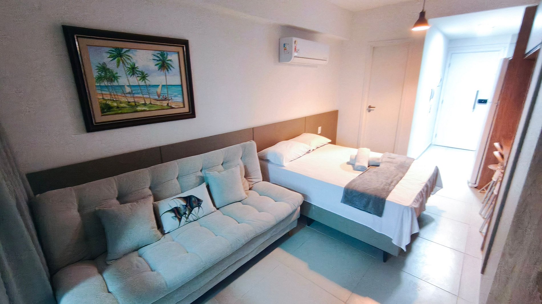 - Studio: 1 Cama Casal + 1 Sofá-cama casal, ar-condicionado, armários e TV;