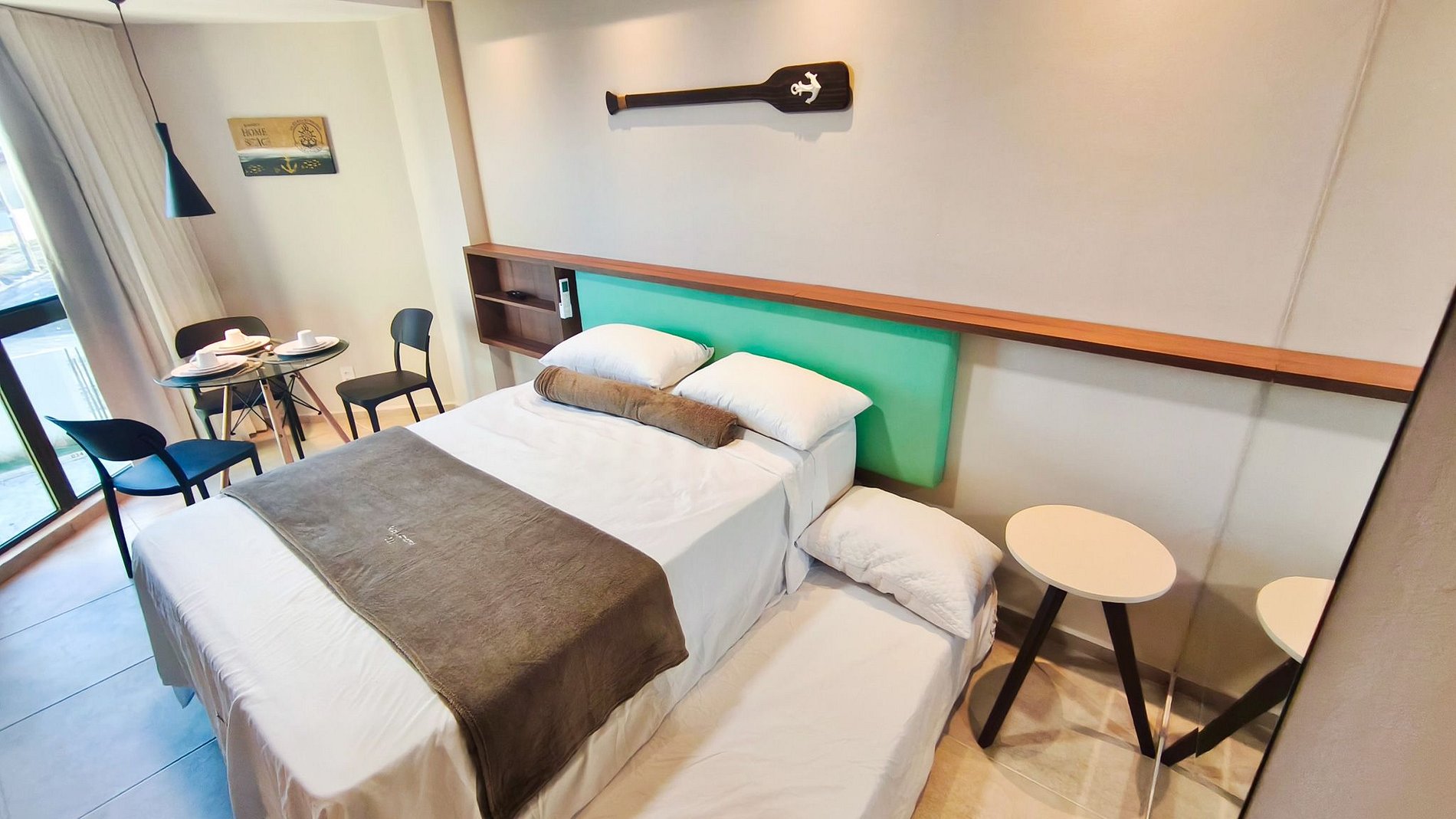 - Studio: 1 cama de casal + 2 bicamas solteiro, armário, TV e ar-condicionado.