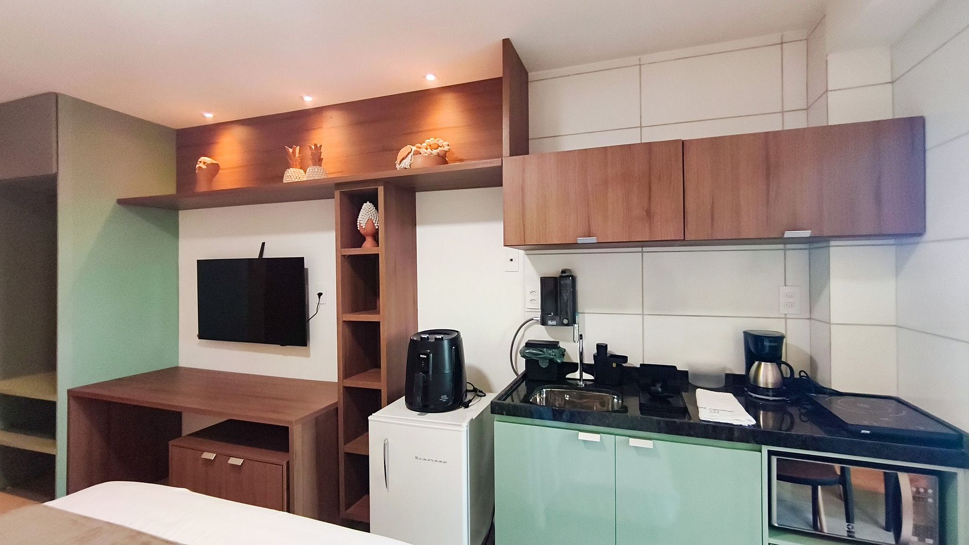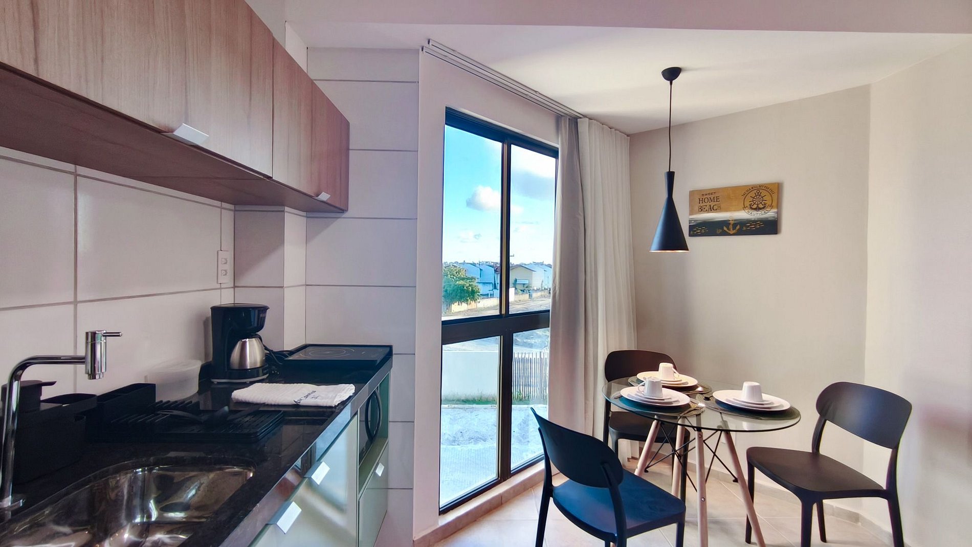 O imóvel oferece decoração moderna e é totalmente climatizado, garantindo conforto em qualquer estação. A cozinha é compacta e completa, equipada com tudo que você precisa: louças, copos, panelas, talheres, airfryer, micro-ondas, fogão elétrico 1 boca, pia, cafeteira elétrica, frigobar e diversos utensílios. Dispõe de mesa de jantar, internet, TV e um banheiro completo.
