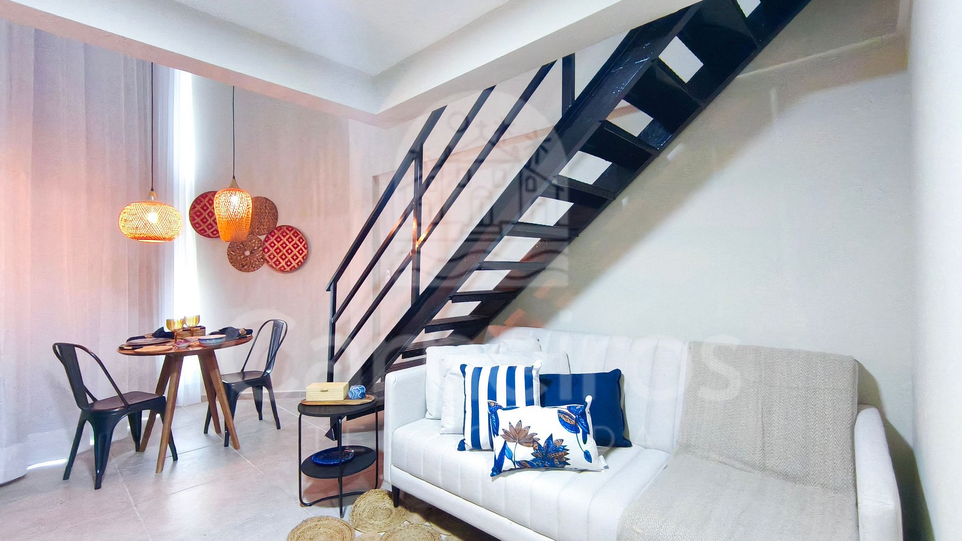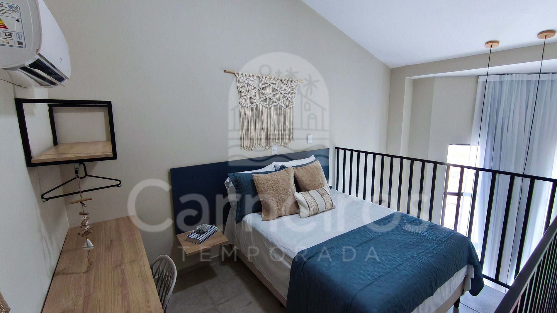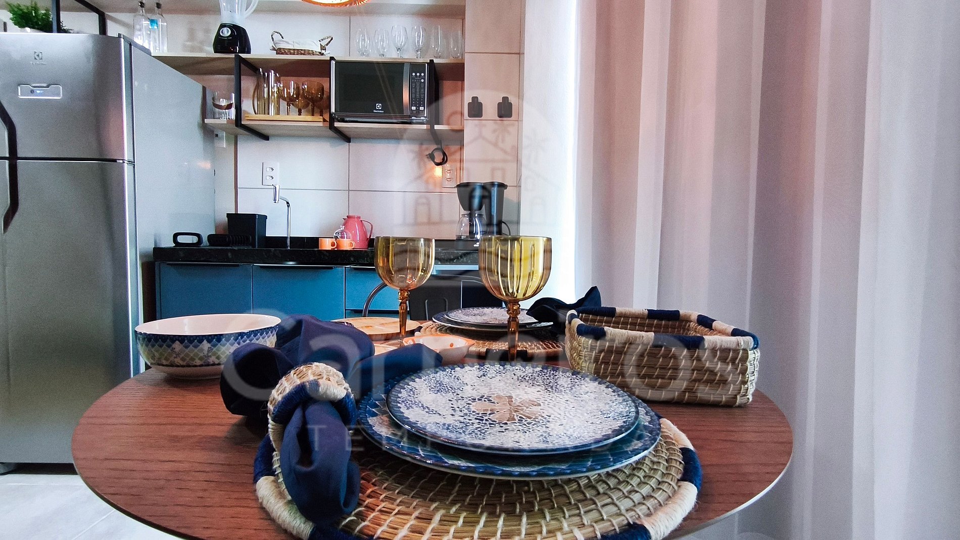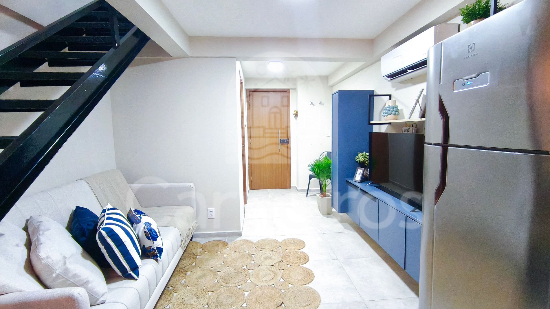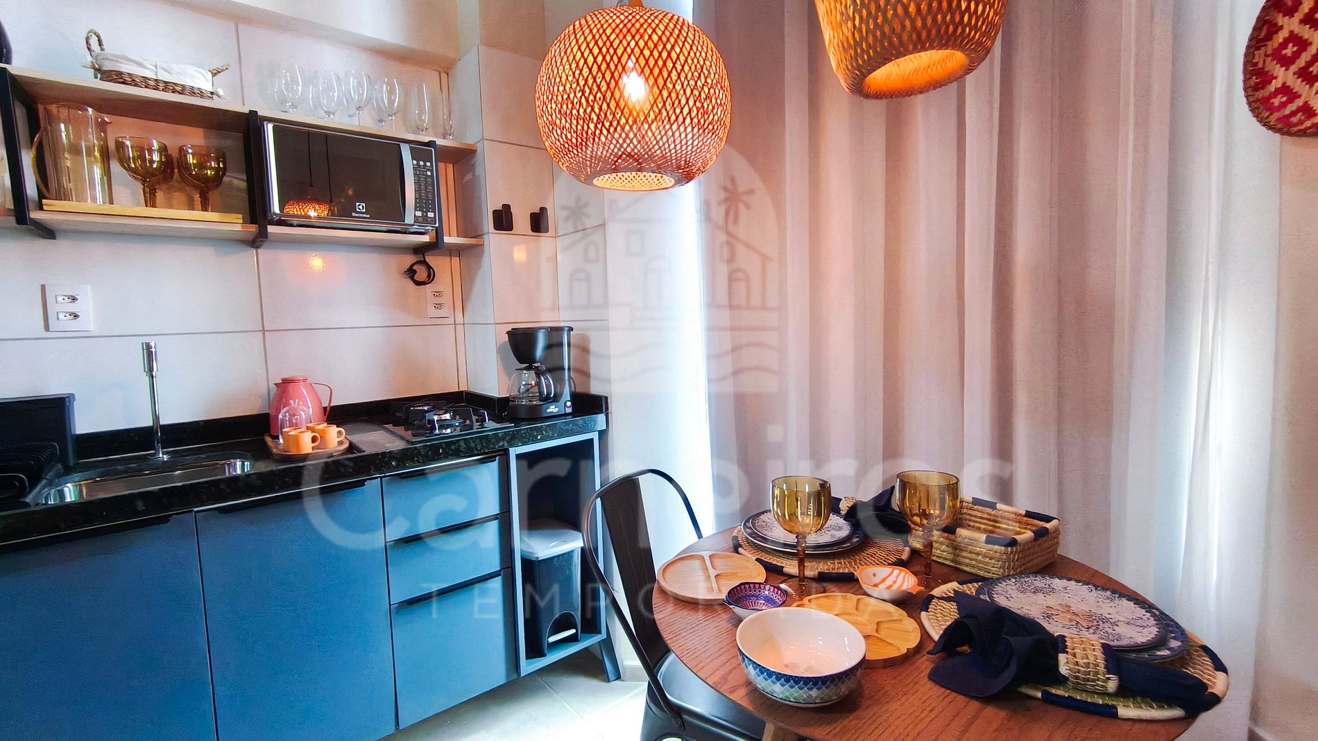 O apartamento possui decoração moderna e ambiente confortável, totalmente climatizado, equipado com TV, sofá e mesa de jantar, ideal para momentos de descanso e praticidade.