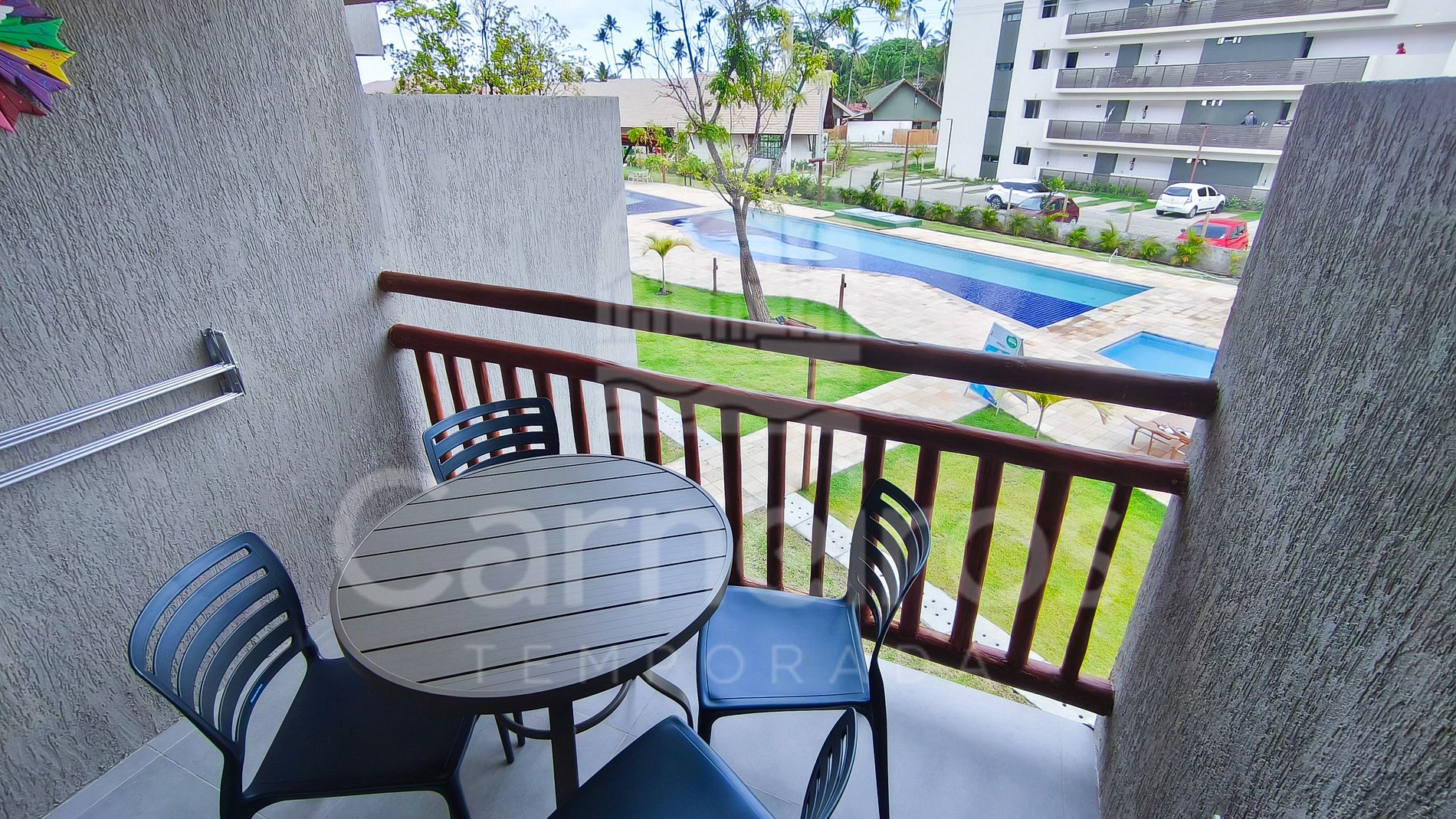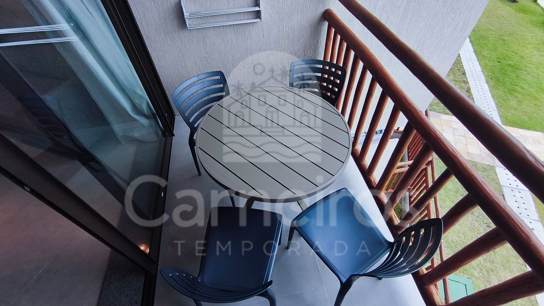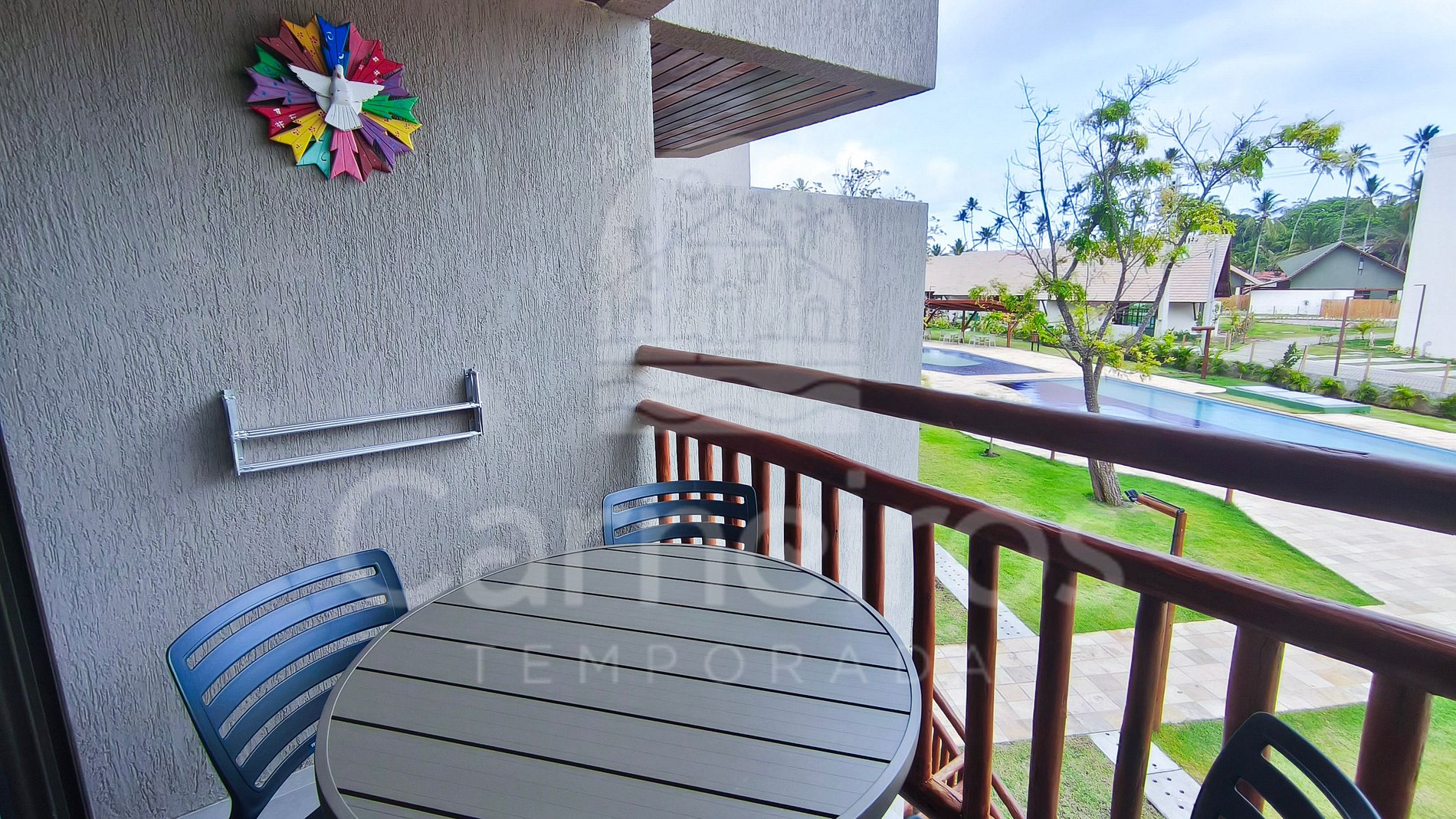 ✹ O imóvel está localizado no primeiro andar e conta com uma agradável varanda, equipada com mesa e cadeiras, com vista para piscina, ideal para momentos de descanso. ✹