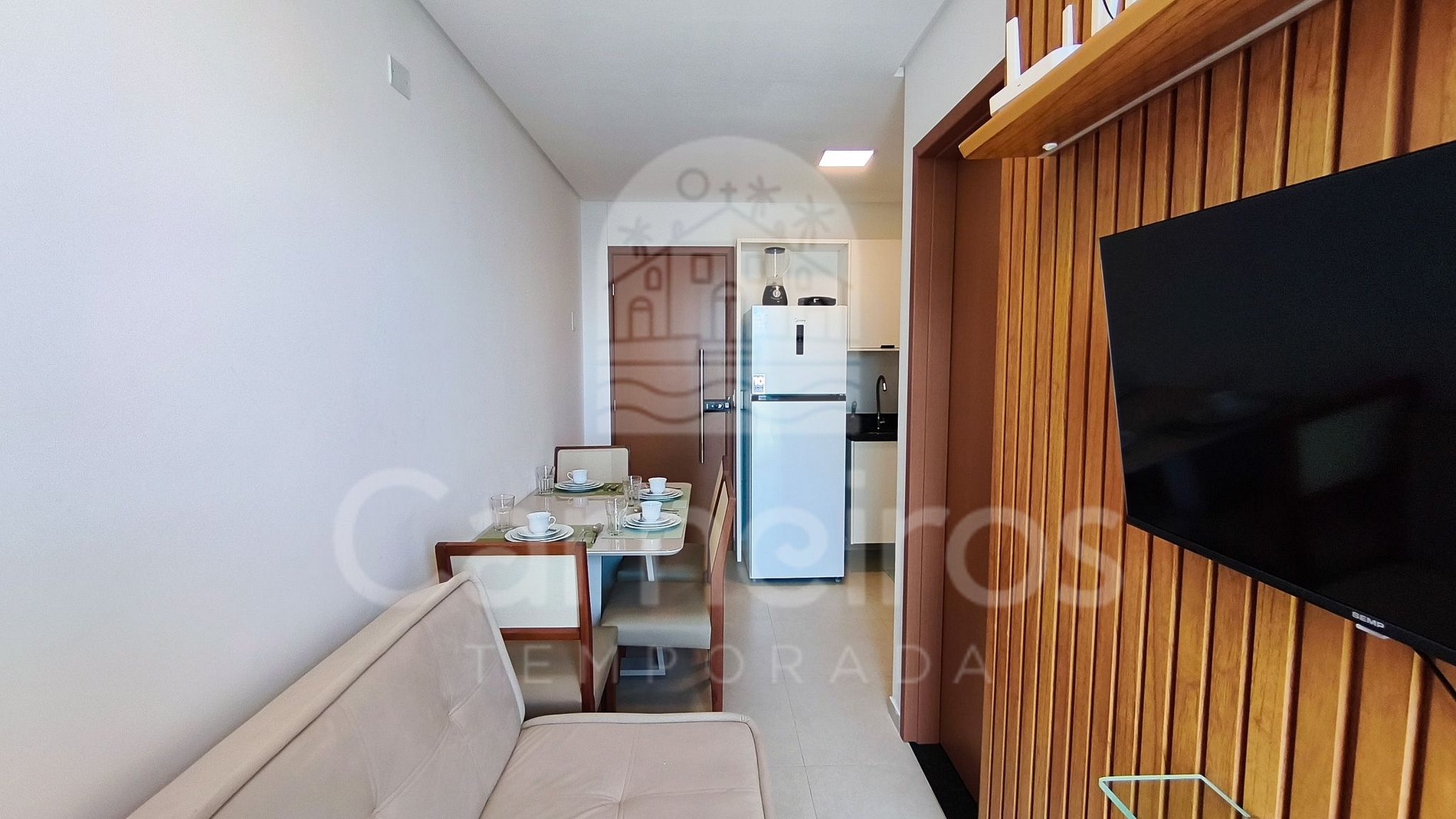 A sala de estar conta com uma decoração aconchegante e moderna, possui sofá-cama casal e TV. A cozinha é completa e equipada com mesa para refeições e os principais utensílios, como talheres, copos, panelas, cooktop 2 bocas, geladeira, sanduicheira, micro-ondas, airfryer, liquidificador e outros. Possui também 1 banheiro completo.