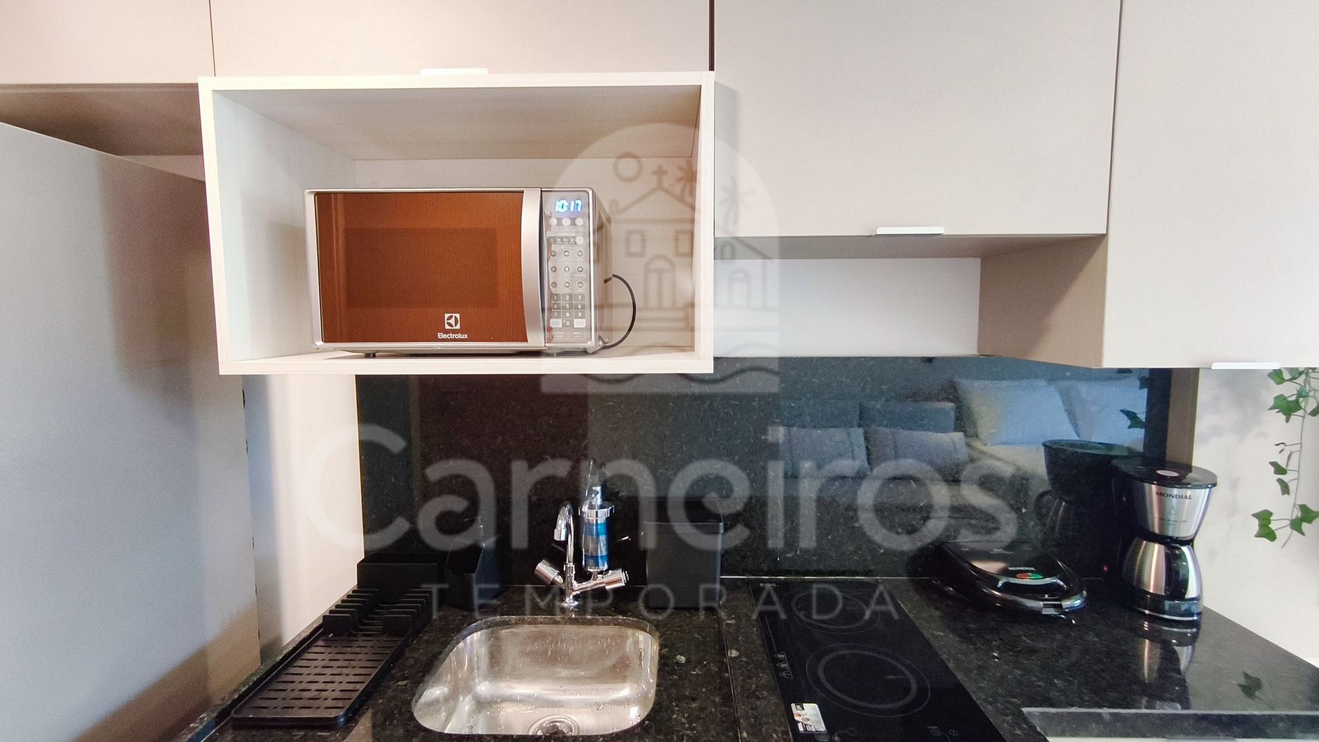 O ambiente integrado apresenta uma decoração aconchegante e moderna, proporcionando conforto e praticidade. A cozinha é totalmente equipada, com geladeira, cooktop 2 bocas, micro-ondas, sanduicheira, cafeteira e diversos utensílios para o preparo de refeições. Possui 1 banheiro completo.