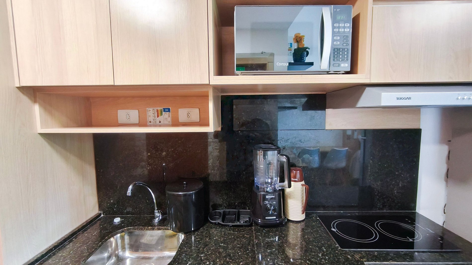 O ambiente integrado possui decoração moderna contando com contando com TV, ar-condicionado e um banheiro completo. A cozinha é completa com geladeira, cooktop, micro-ondas, airfryer, sanduicheira, liquidificador, entre outros utensílios. Possui 1 banheiro completo.