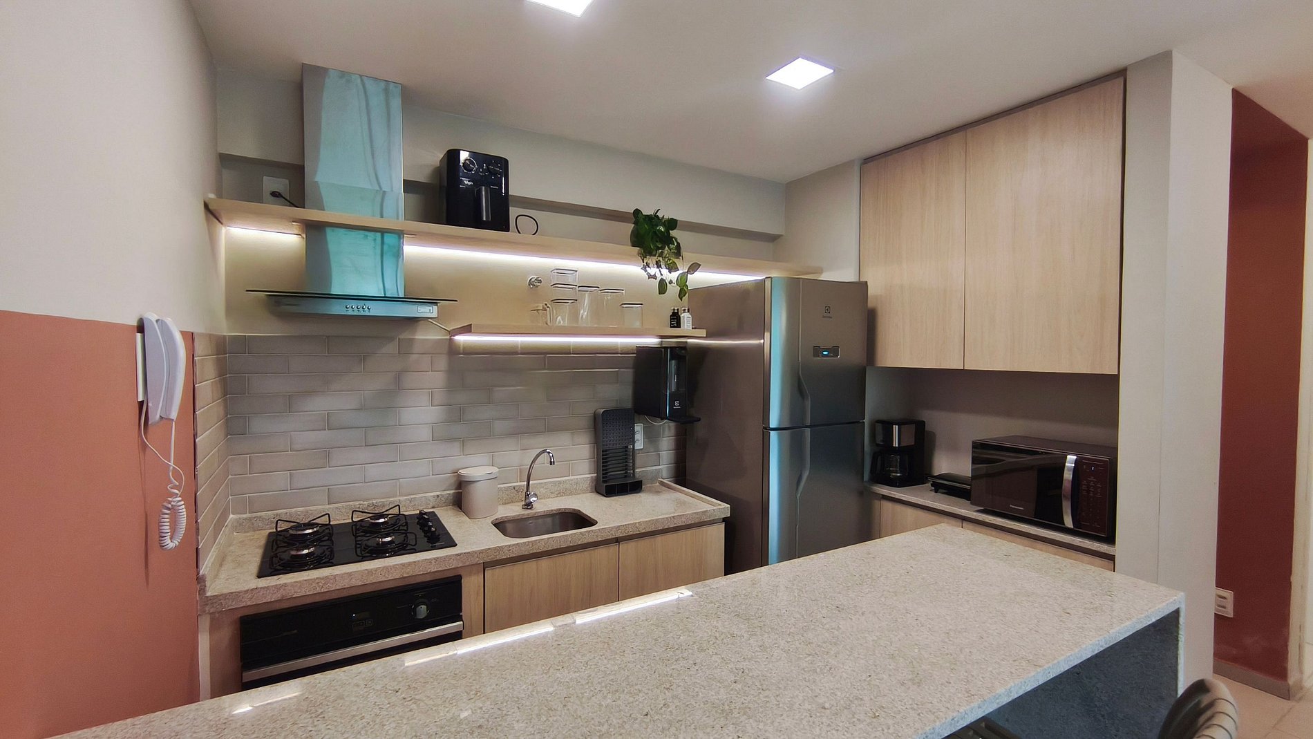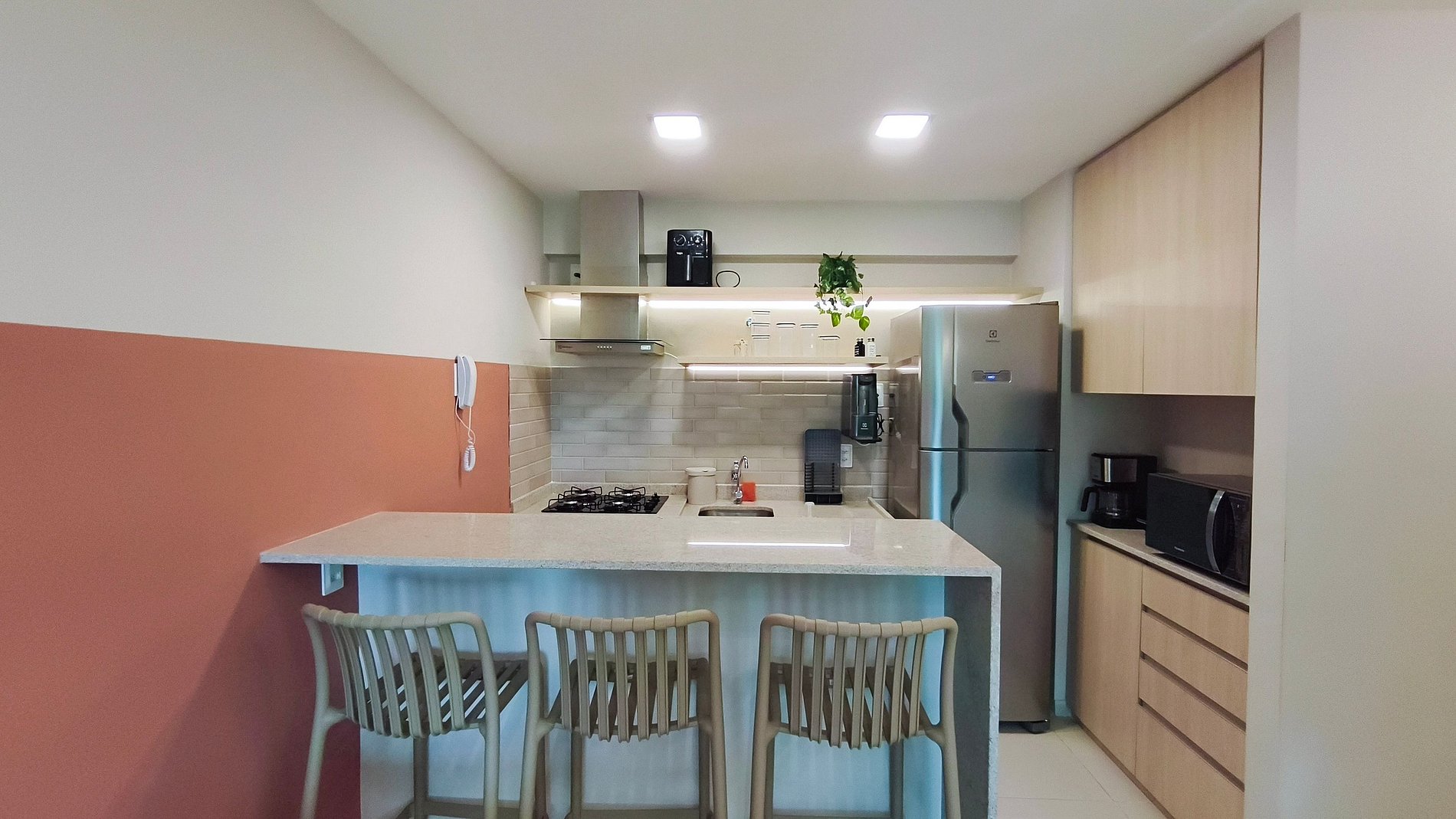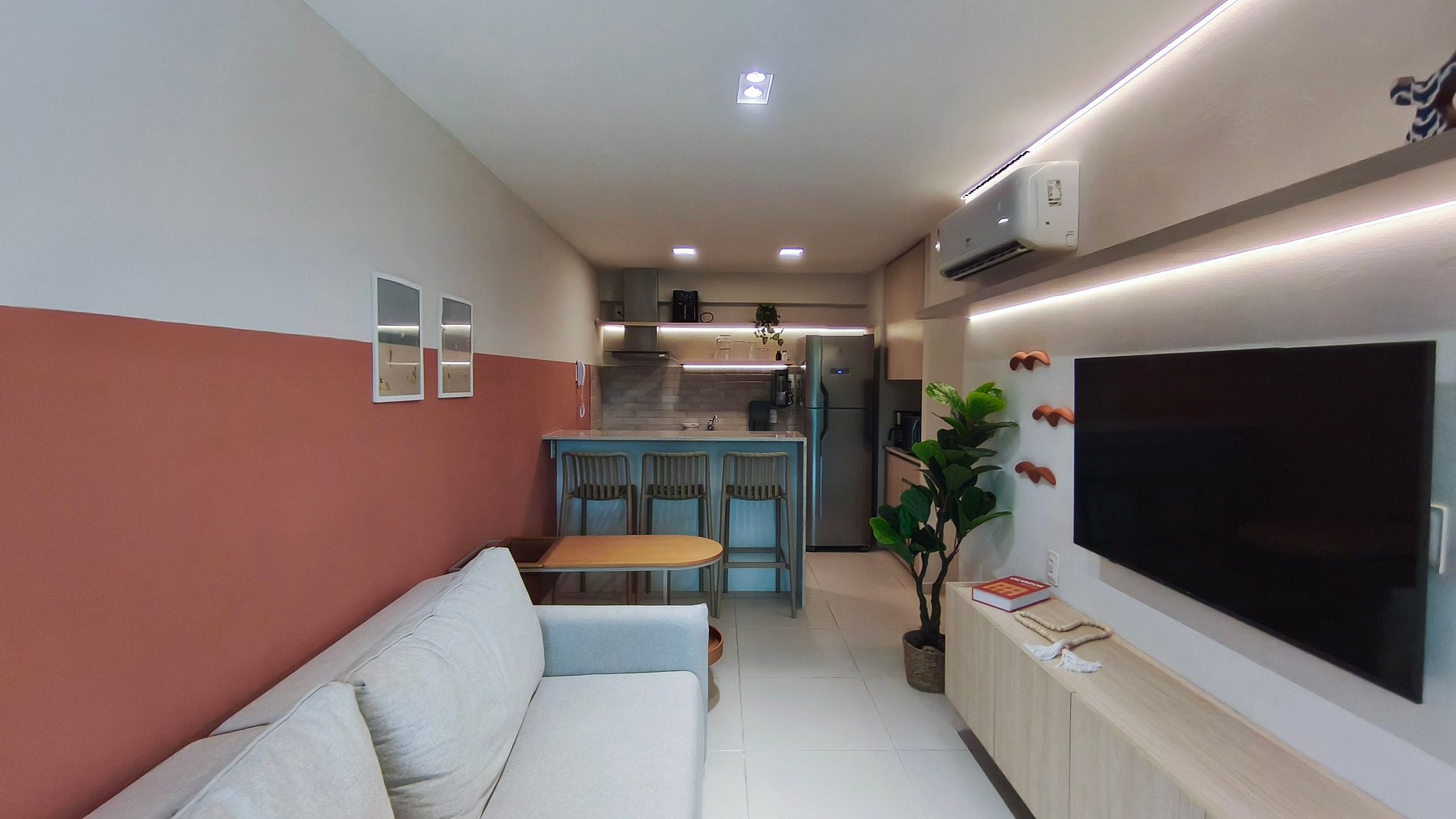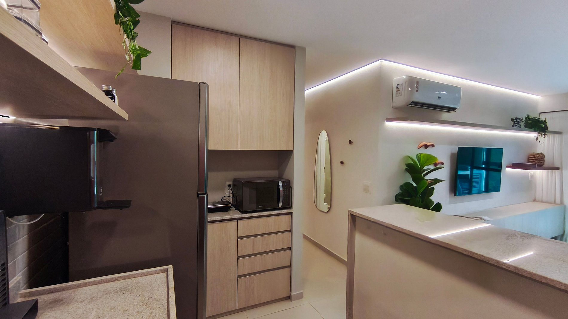 O apartamento conta com decoração moderna e aconchegante, oferecendo sala com TV, sofá e ar-condicionado, ideal para momentos de descanso e lazer. A cozinha é completa e funcional, equipada com louças, copos, panelas, talheres, cafeteira, bebedouro, airfryer, micro-ondas, cooktop, forno, geladeira e diversos utensílios — perfeita para preparar refeições durante a estadia. Dispõe ainda de 02 banheiros completos, garantindo mais conforto e praticidade para todos os hóspedes.