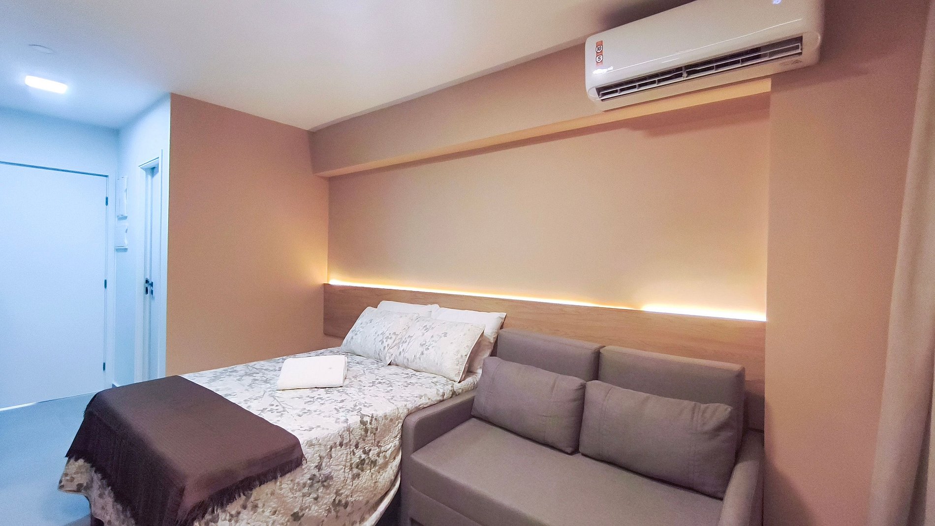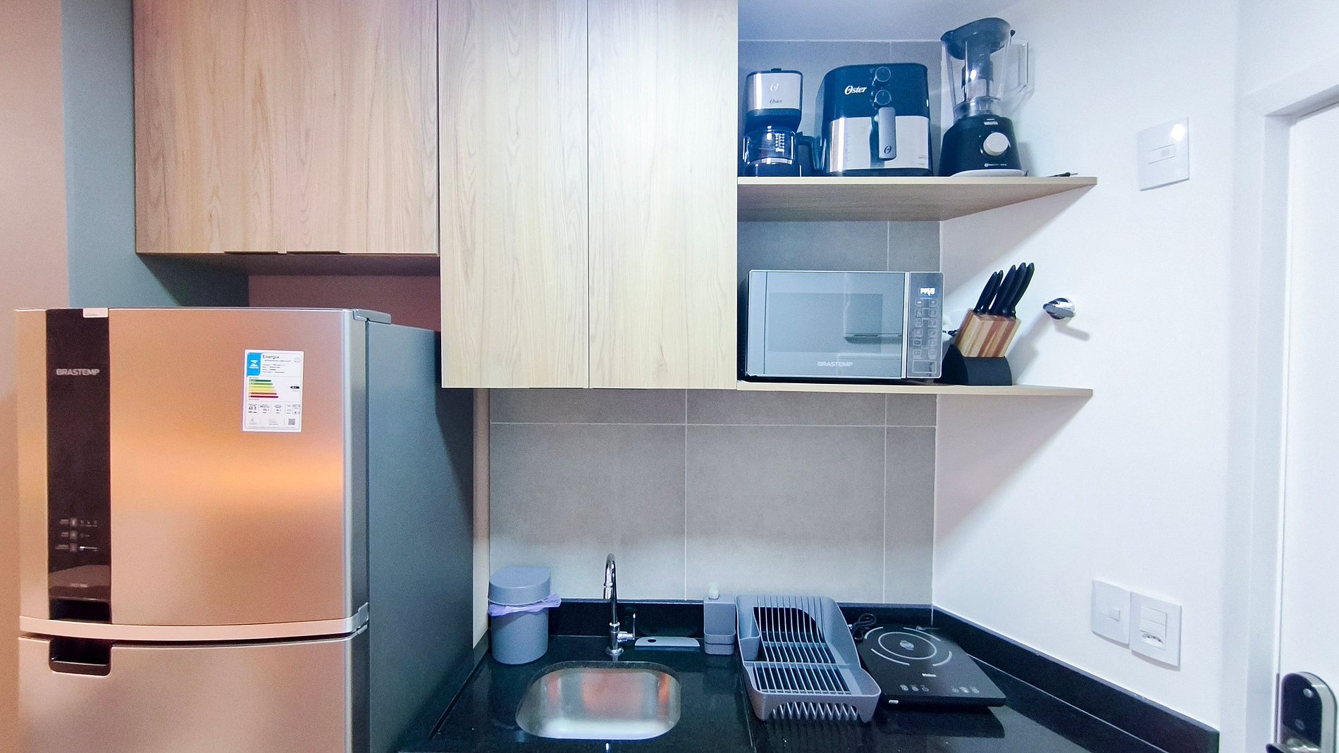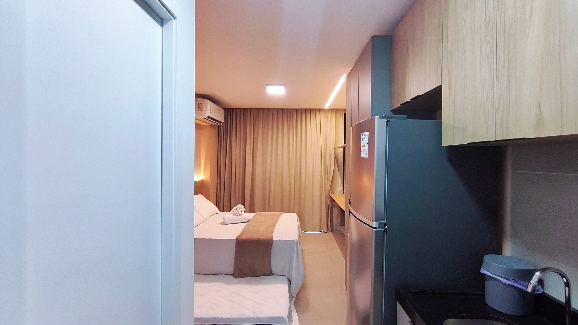 O ambiente é integrado, bem distribuído e possui decoração acolhedora. O studio dispõe de quarto, cozinha, banheiro e varanda. A cozinha é completa e equipada com geladeira, cooktop, airfryer, micro-ondas, cafeteira, liquidificador e diversos utensílios, proporcionando praticidade durante a estadia.