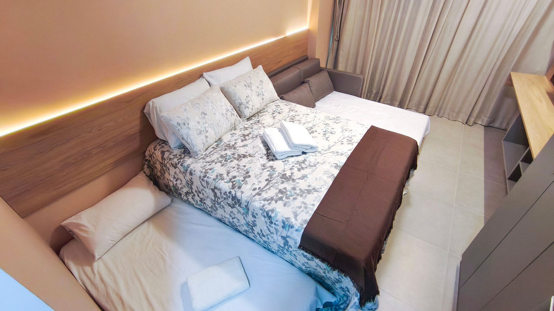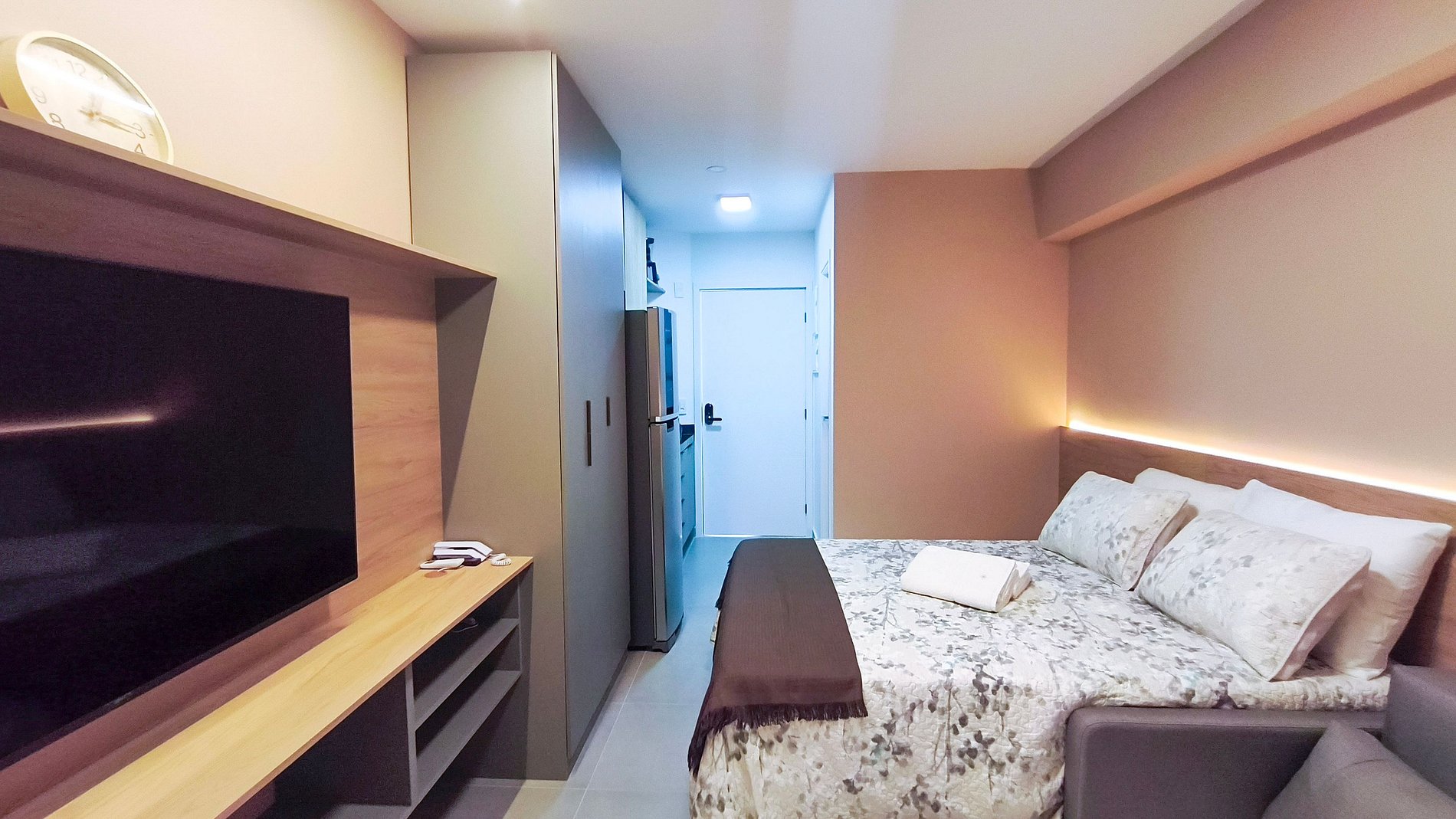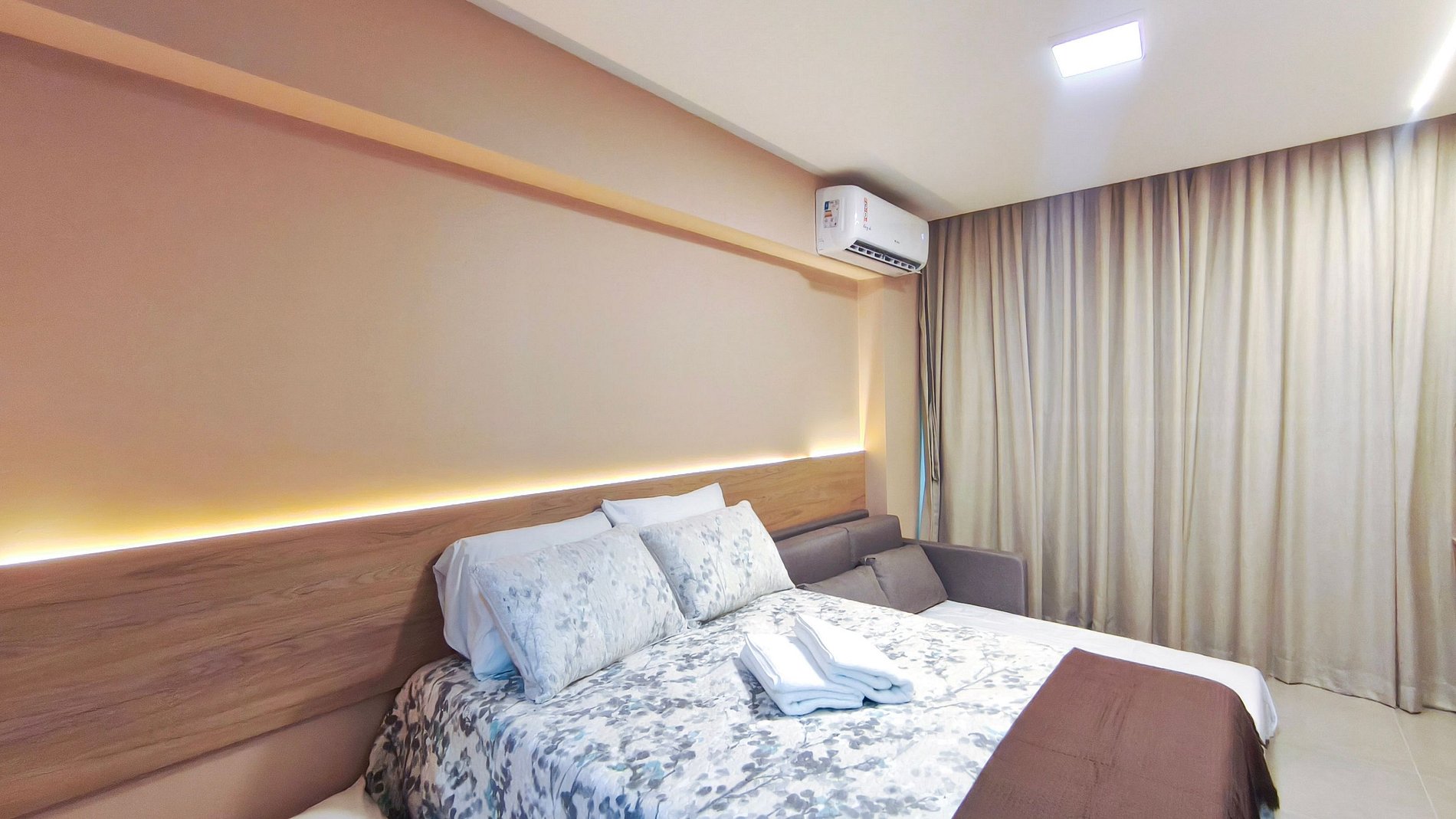 O ambiente é integrado, bem distribuído e possui decoração acolhedora. O studio dispõe de quarto, cozinha, banheiro e varanda. A cozinha é completa e equipada com geladeira, cooktop, airfryer, micro-ondas, cafeteira, liquidificador e diversos utensílios, proporcionando praticidade durante a estadia.