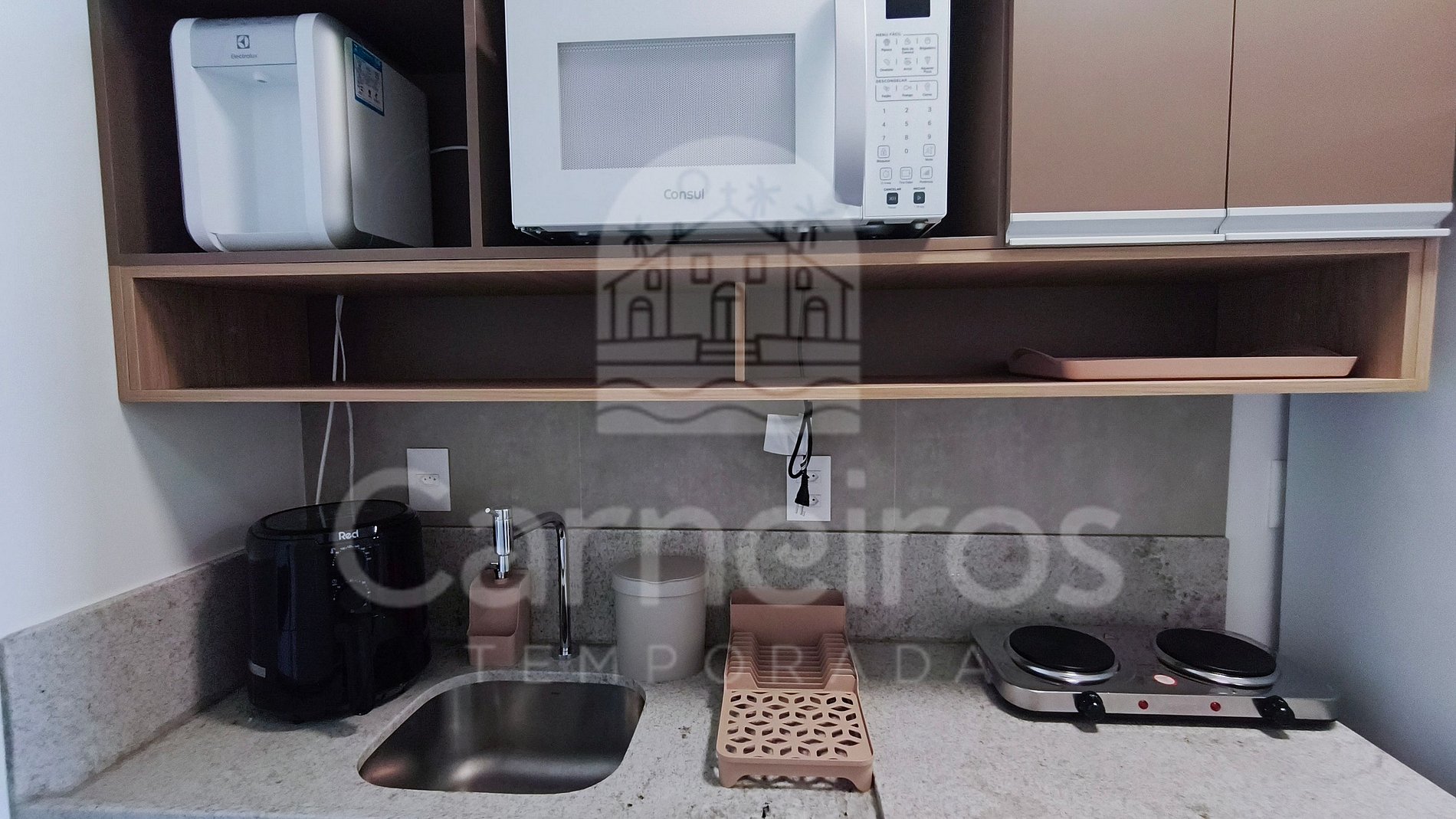 A cozinha é completa e funcional, equipada com louças, copos, panelas, talheres, cooktop, micro-ondas, airfryer, gelágua, geladeira e diversos utensílios essenciais. O imóvel conta ainda com 1 banheiro completo.
