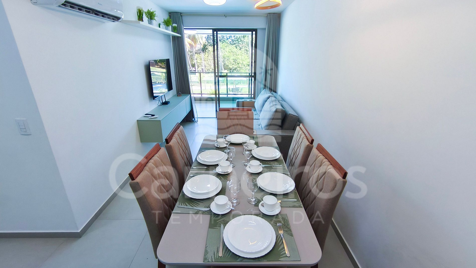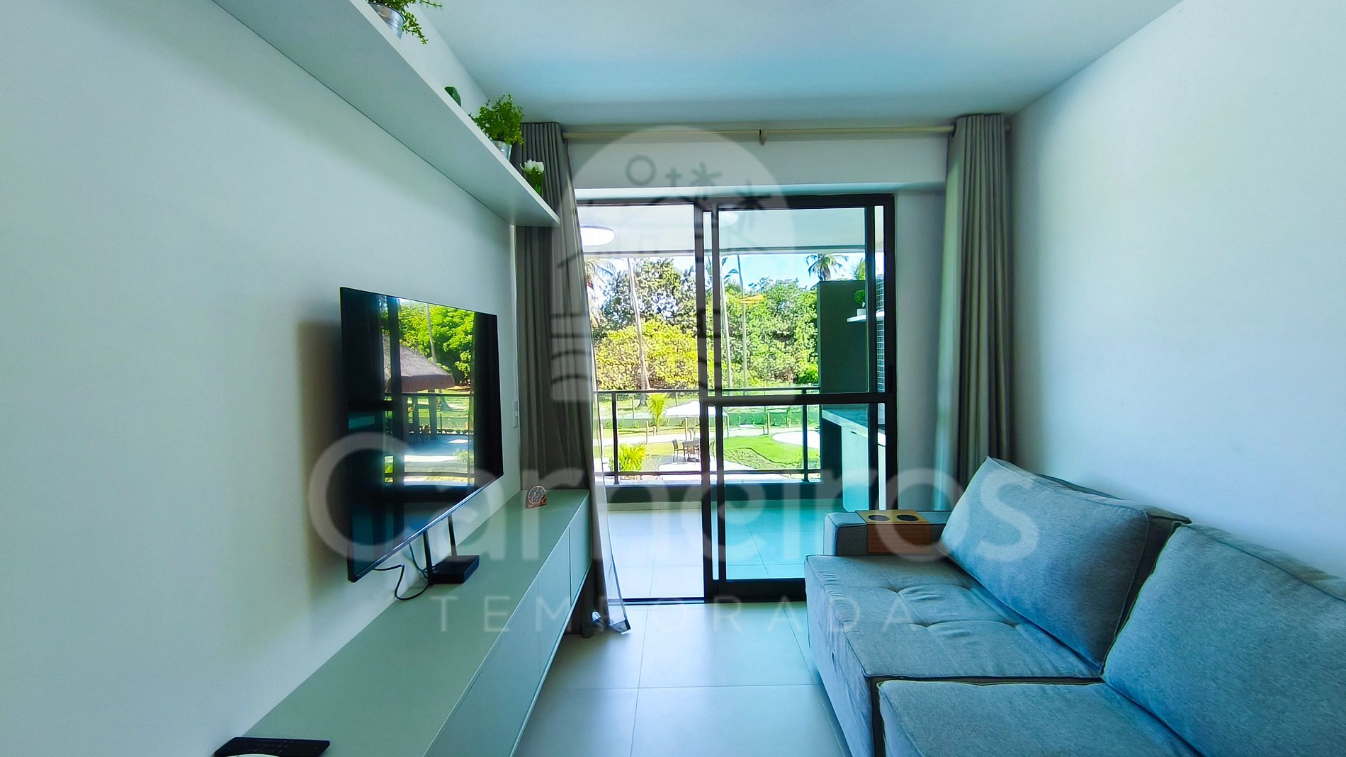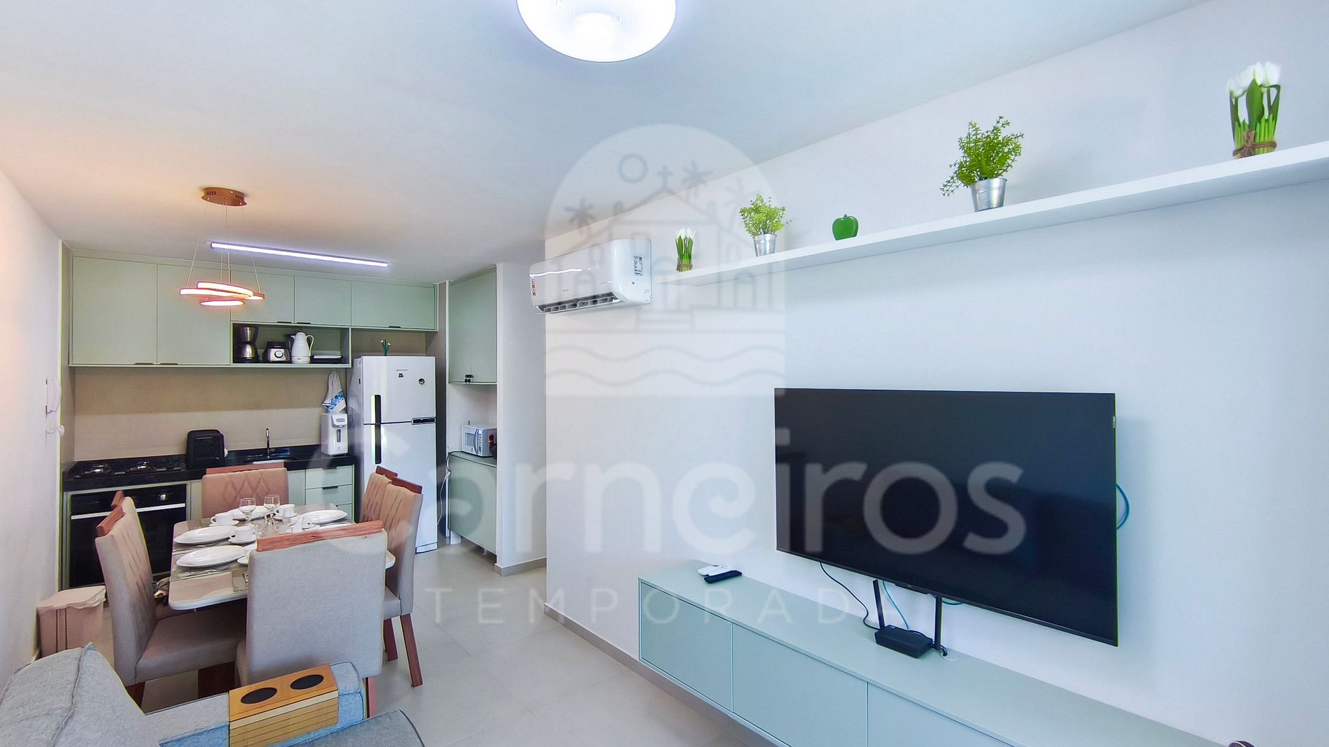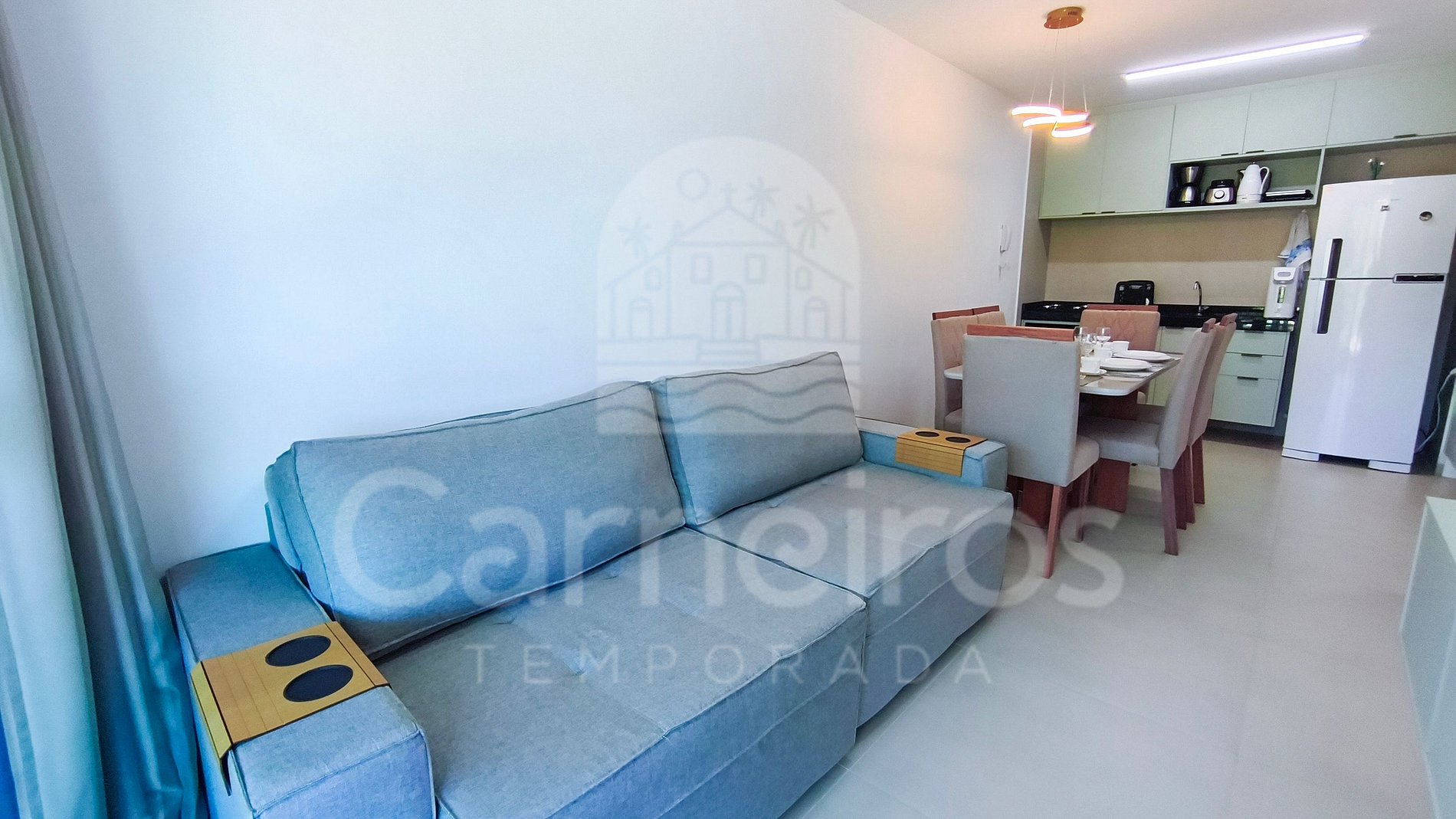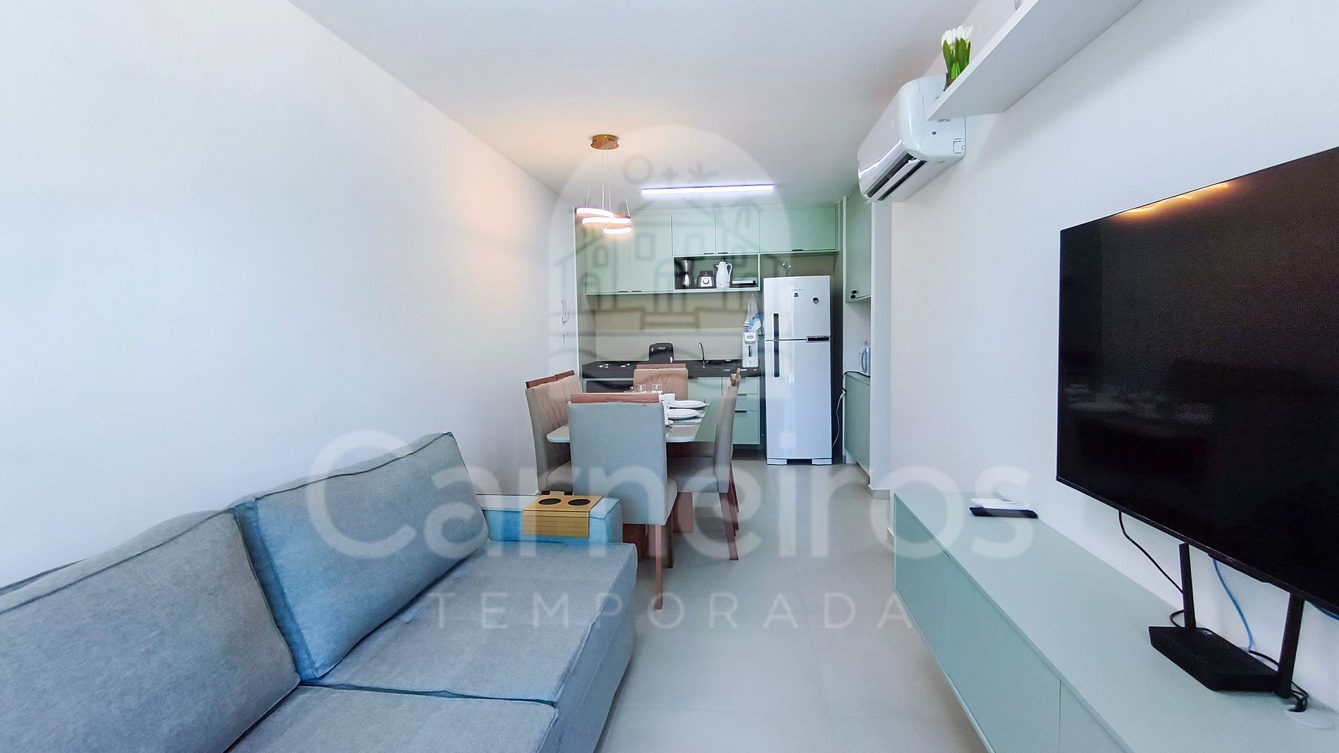 Com decoração moderna e aconchegante, o apartamento dispõe de sala equipada com TV (com 175 canais liberados via aplicativo Claro), sofá e ar-condicionado, oferecendo conforto e praticidade durante a estadia. A cozinha é completa e funcional, equipada com louças, copos, panelas, talheres, cafeteira, liquidificador, sanduicheira, bebedouro elétrico, micro-ondas, cooktop, forno, geladeira e diversos utensílios para uso diário.