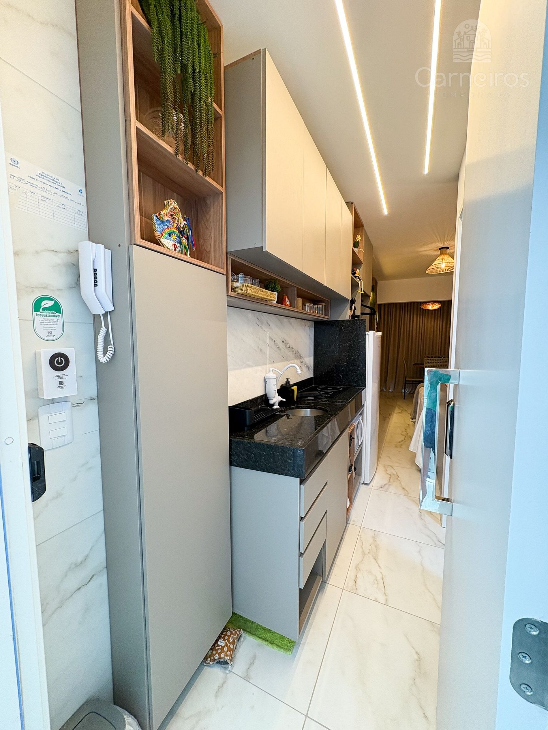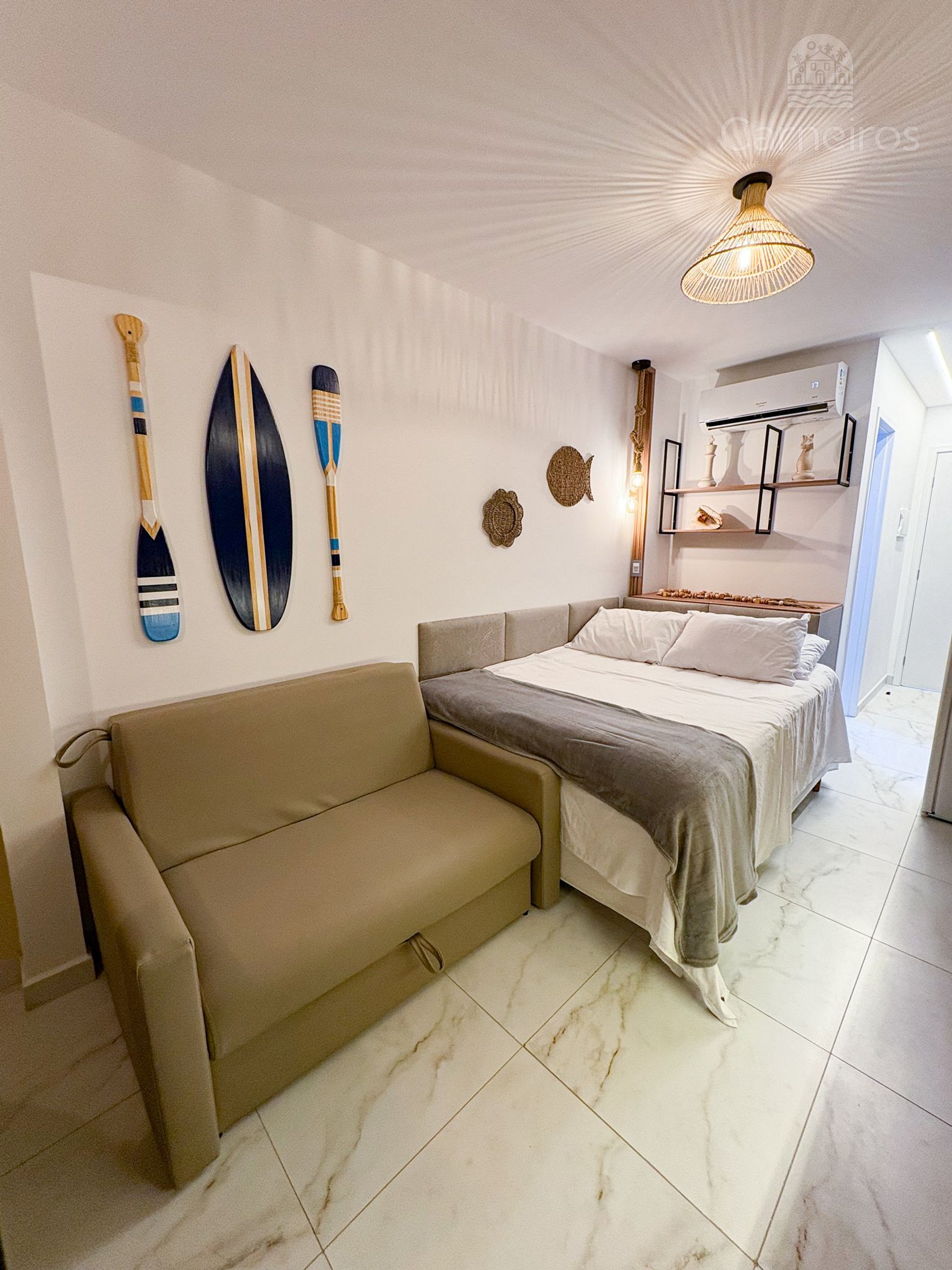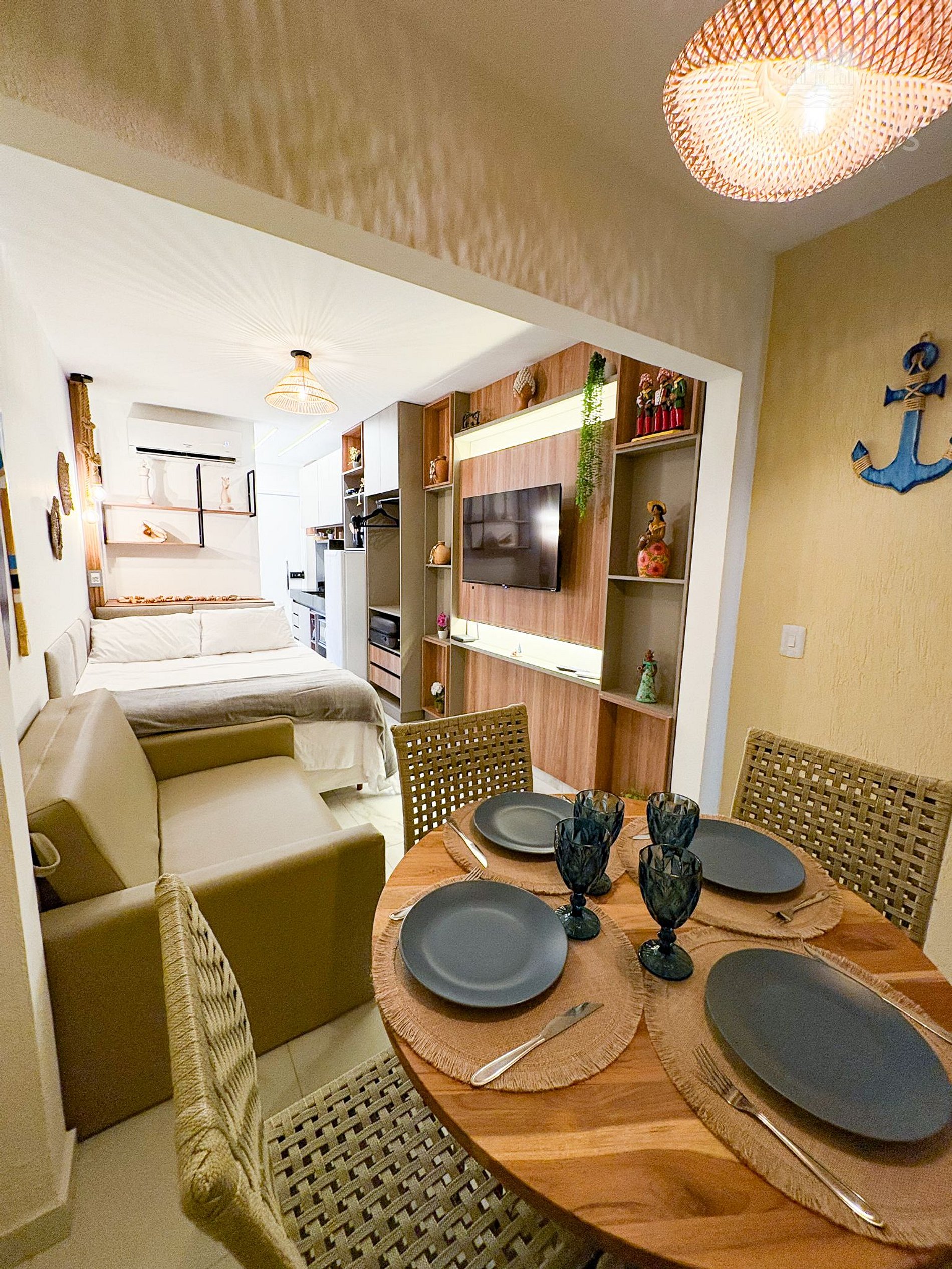 O flat conta com uma suíte que possui cama casal Queen, sofá cama, ar-condicionado e TV. A parte da cozinha é compacta e equipada com os principais itens como louça, copos, panelas, talheres, geladeira, microondas, liquidificador, cooktop portátil 1 boca e sanduicheira. O flat possui 01 banheiro completo e dispõe de secador de cabelo.