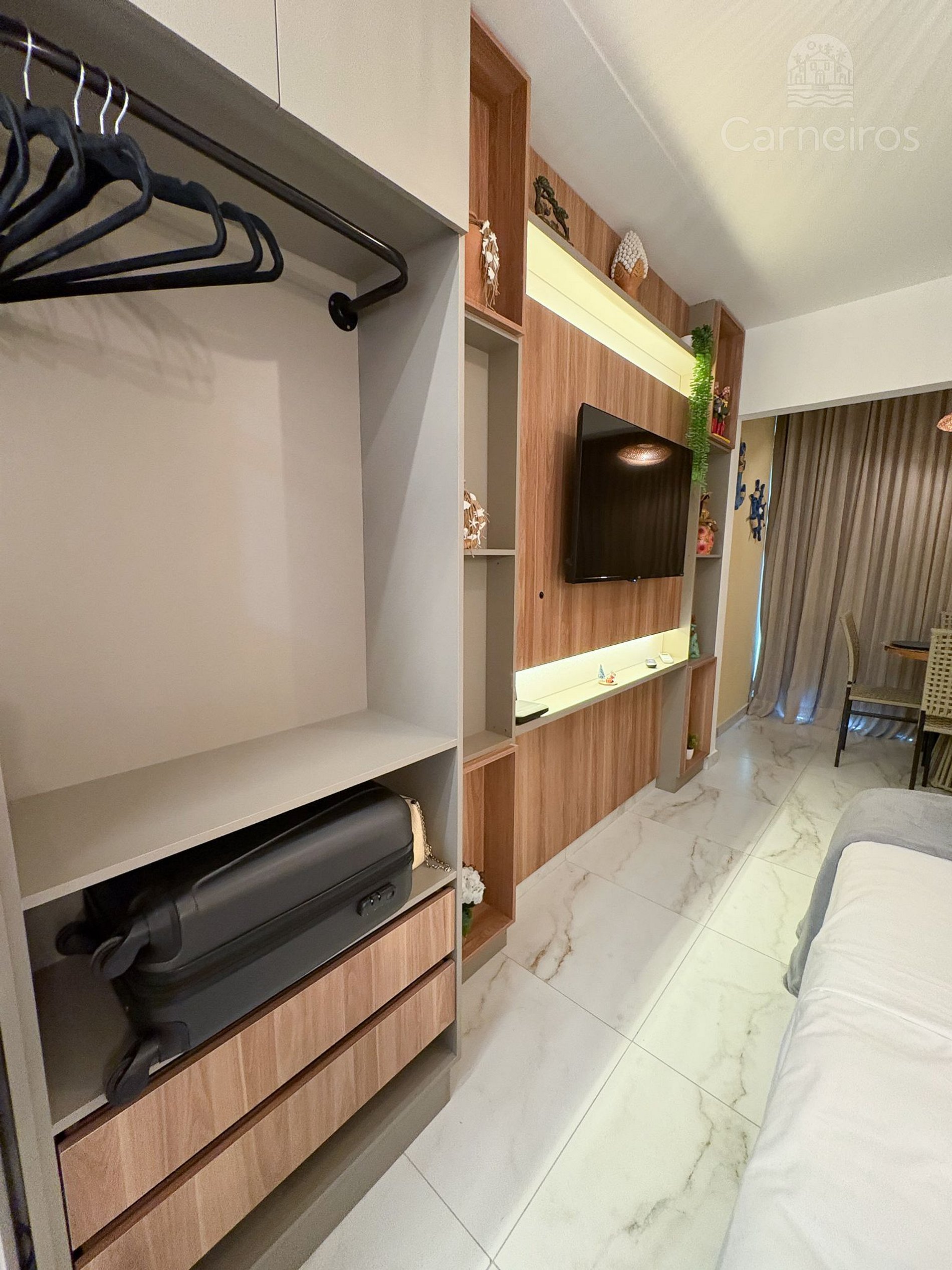 - Suíte: 01 cama de casal Queen + 01 sofá cama, TV, mesa com 4 cadeiras e armário.