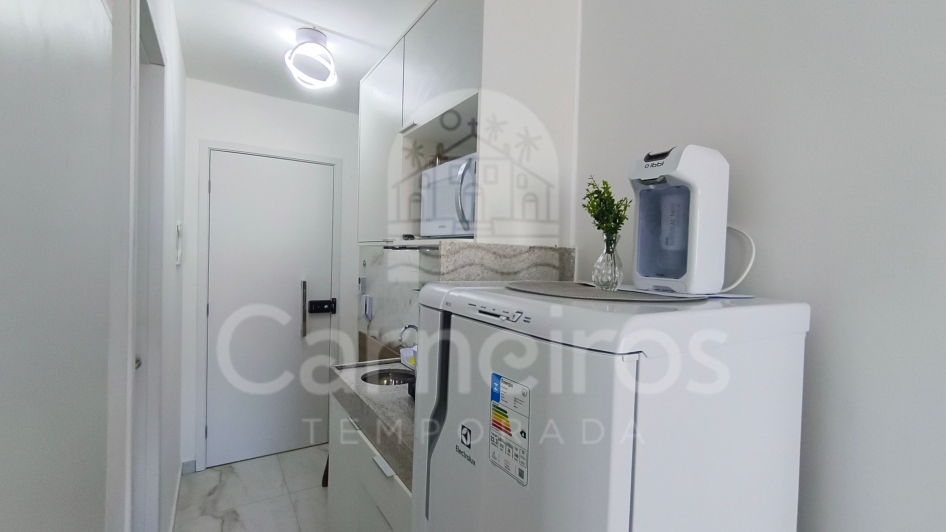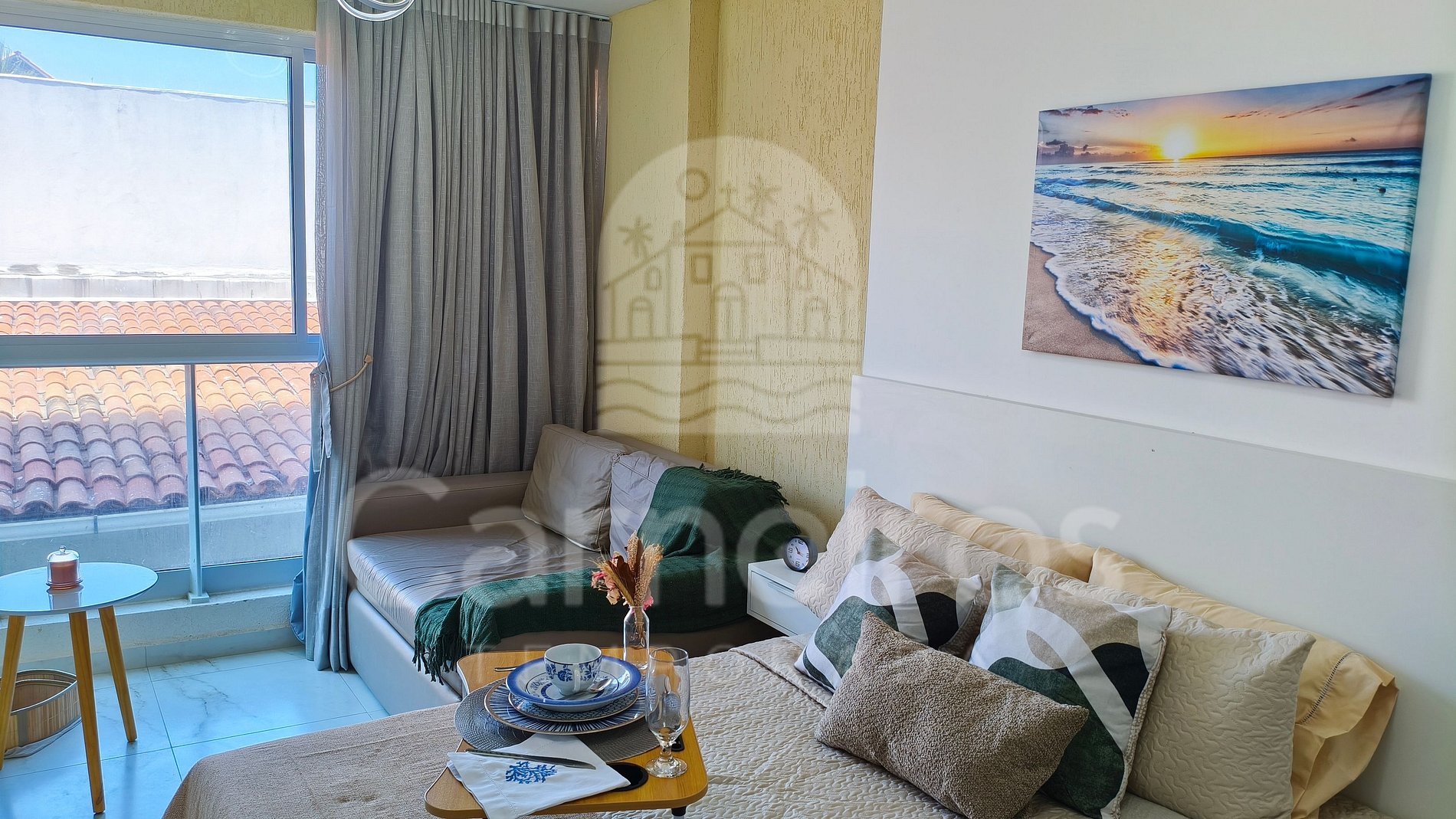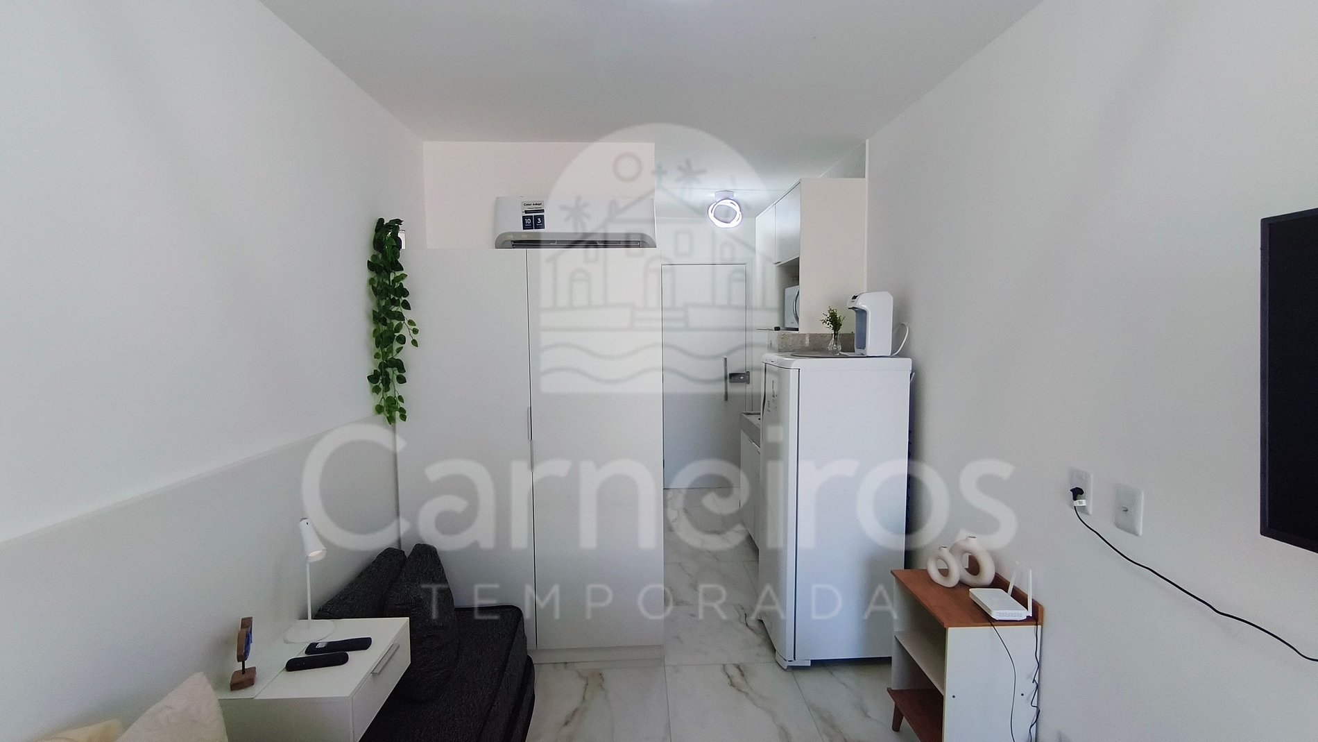 O flat conta com uma suíte que possui cama casal Queen, sofá cama, ar-condicionado e TV. A parte da cozinha é compacta e equipada com os principais itens como louça, copos, panelas, talheres, geladeira, microondas, liquidificador, cooktop portátil 1 boca e sanduicheira. O flat possui 01 banheiro completo e dispõe de secador de cabelo.