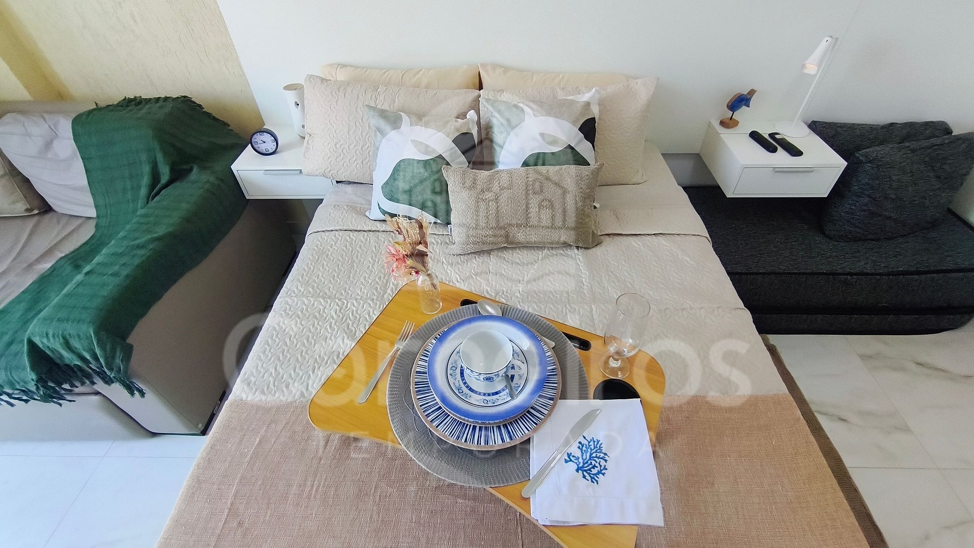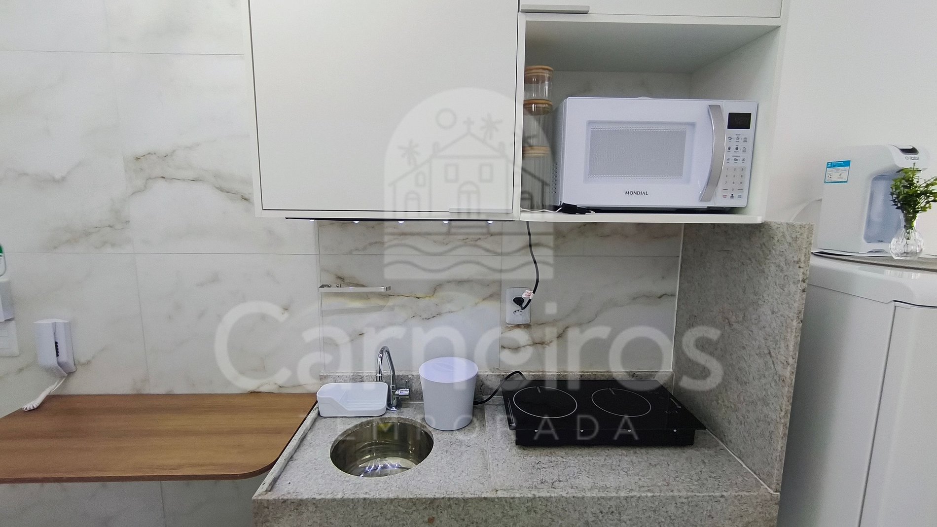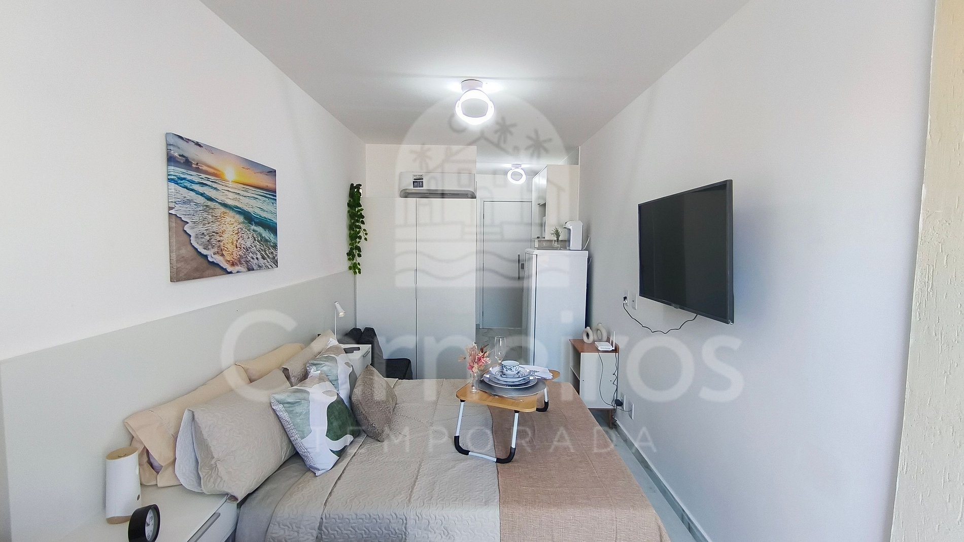 O flat conta com uma suíte que possui cama casal Queen, sofá cama, ar-condicionado e TV. A parte da cozinha é compacta e equipada com os principais itens como louça, copos, panelas, talheres, geladeira, microondas, liquidificador, cooktop portátil 1 boca e sanduicheira. O flat possui 01 banheiro completo e dispõe de secador de cabelo.