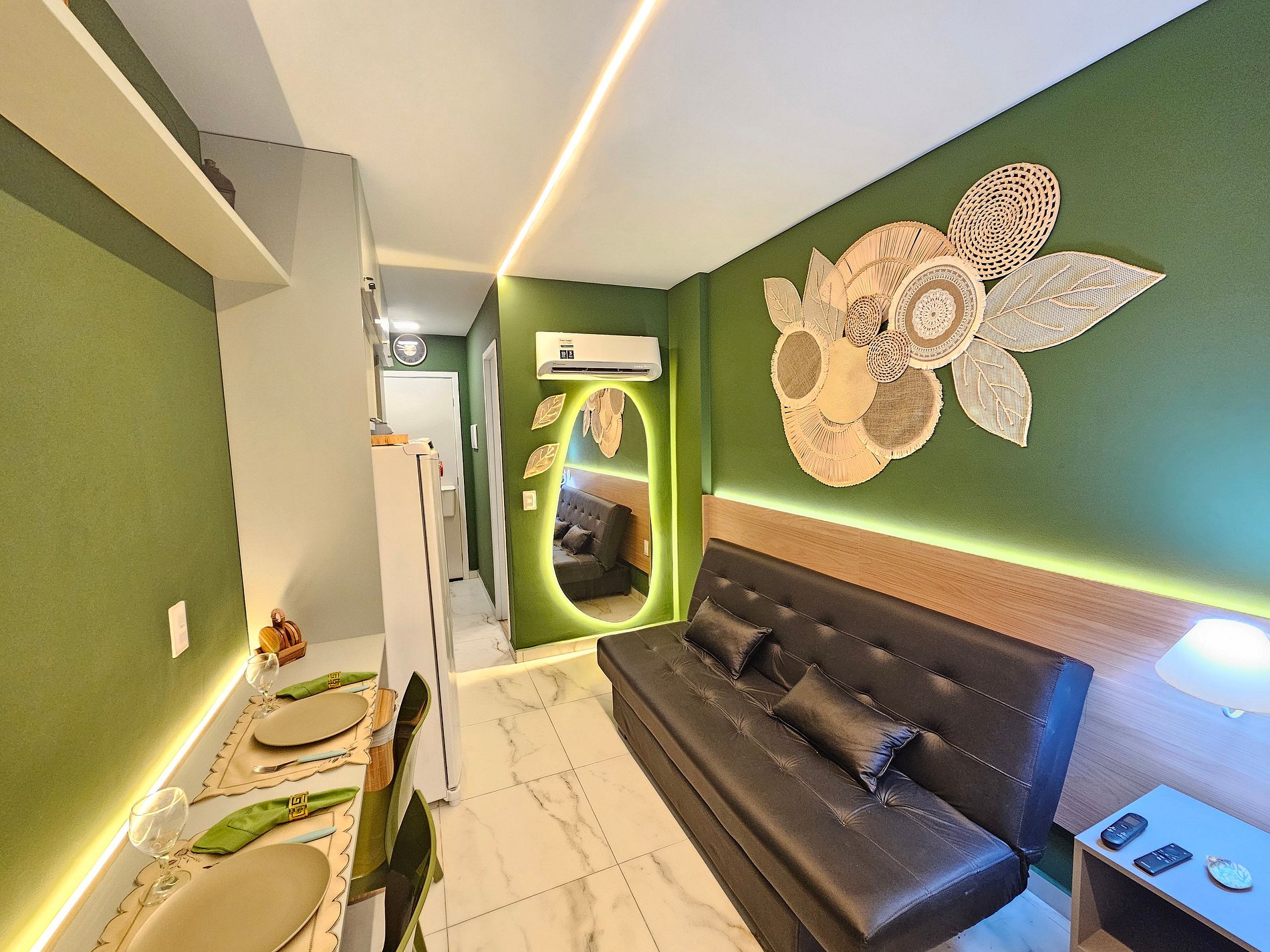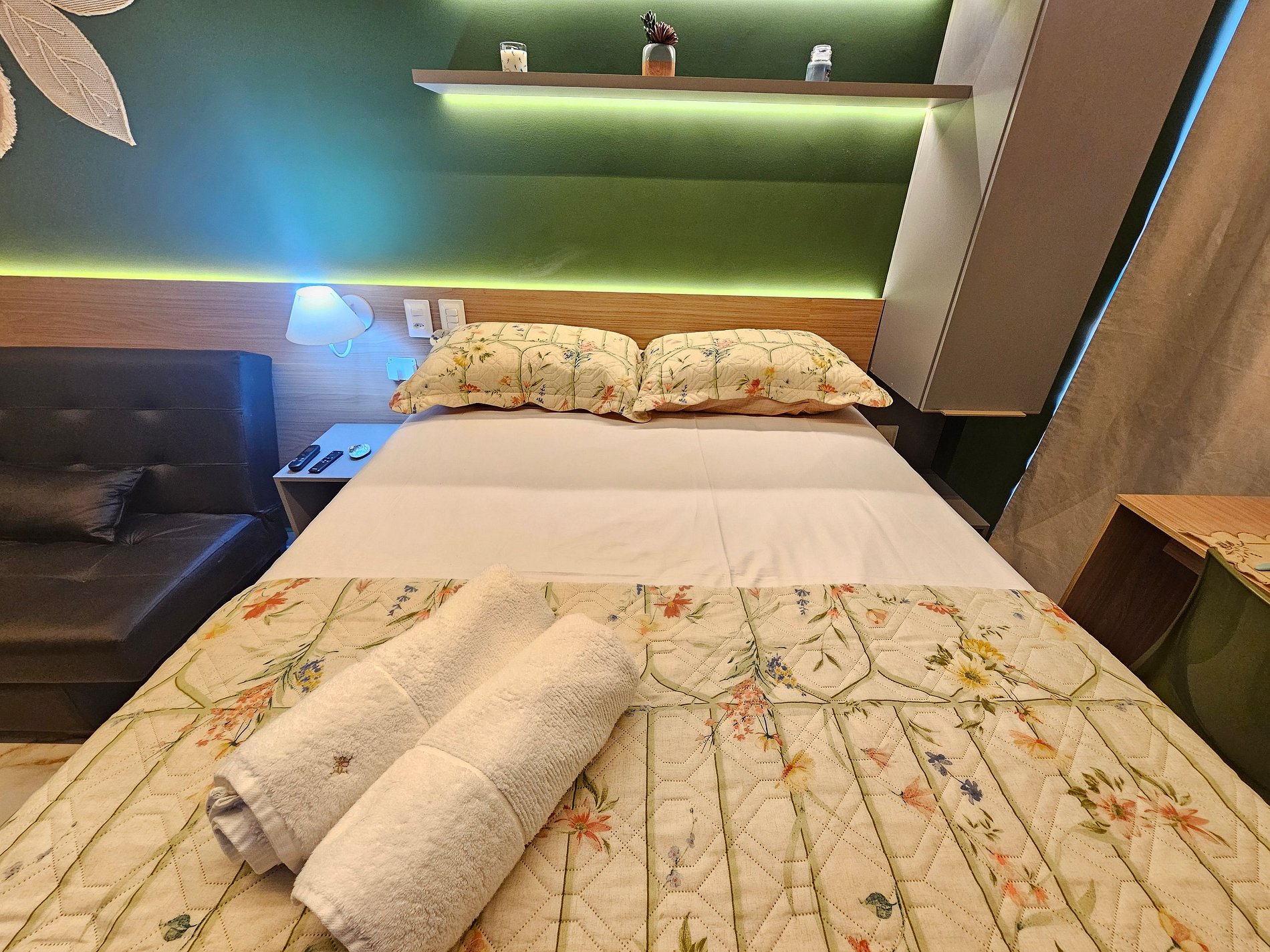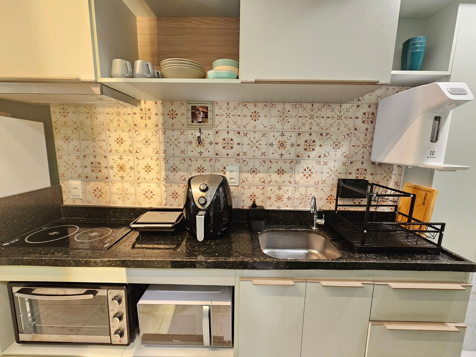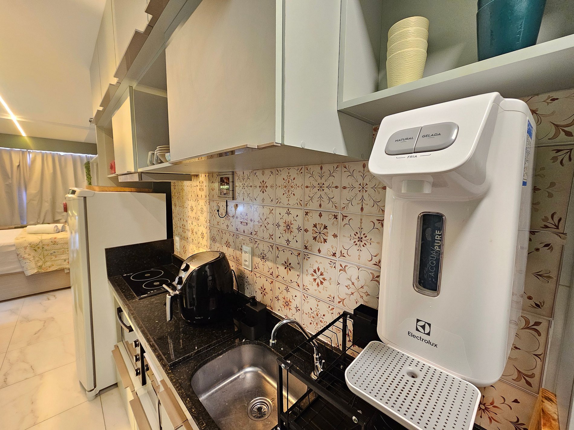 O Studio possui cama casal Queen, sofá cama, ar-condicionado e TV. A cozinha é compacta e equipada com os principais itens como louça, copos, panelas, talheres, geladeira, airfryer, micro-ondas, liquidificador, cooktop 2 bocas, liquidificador e sanduicheira. O flat possui 01 banheiro completo e dispõe de secador de cabelo.