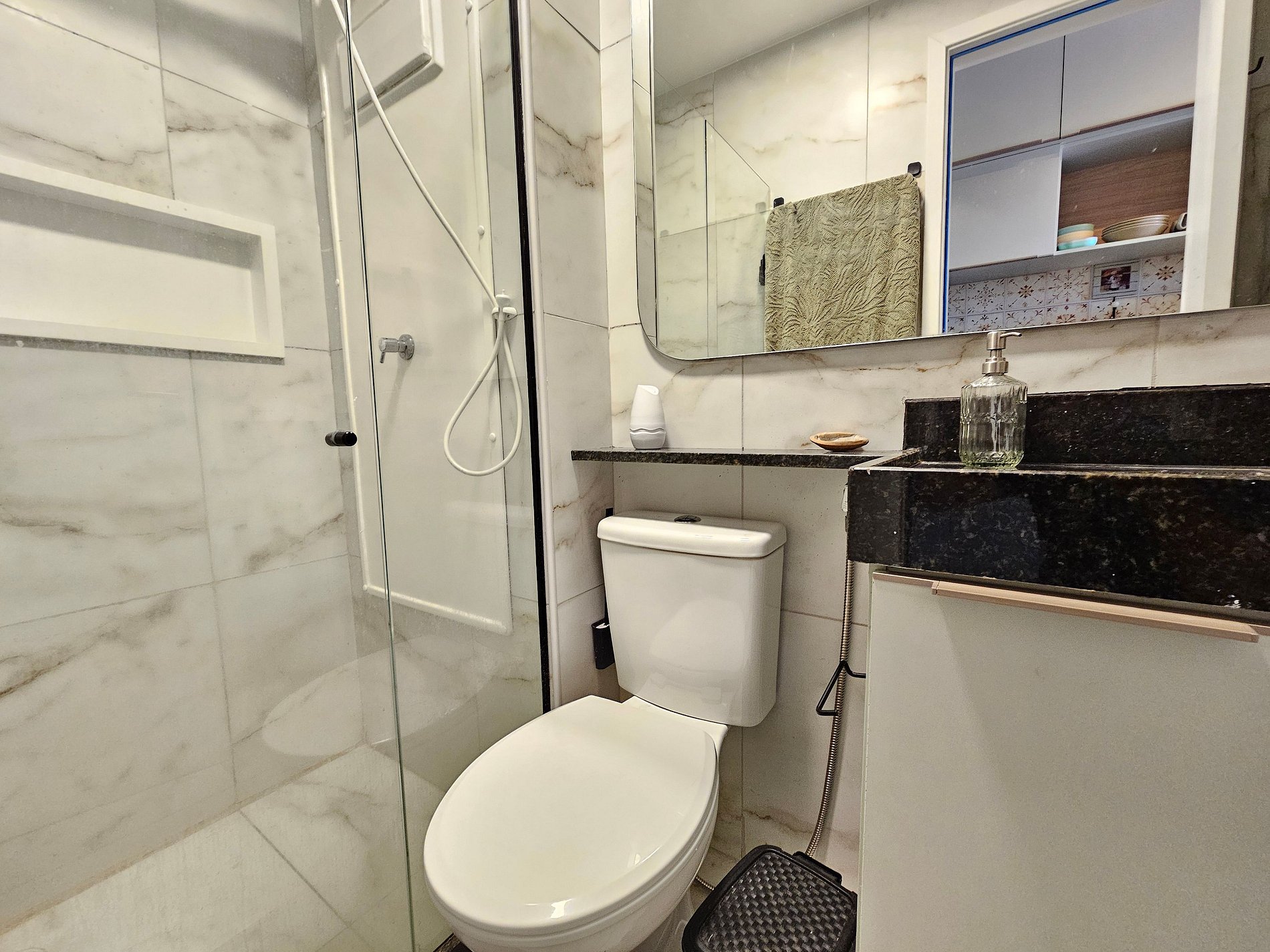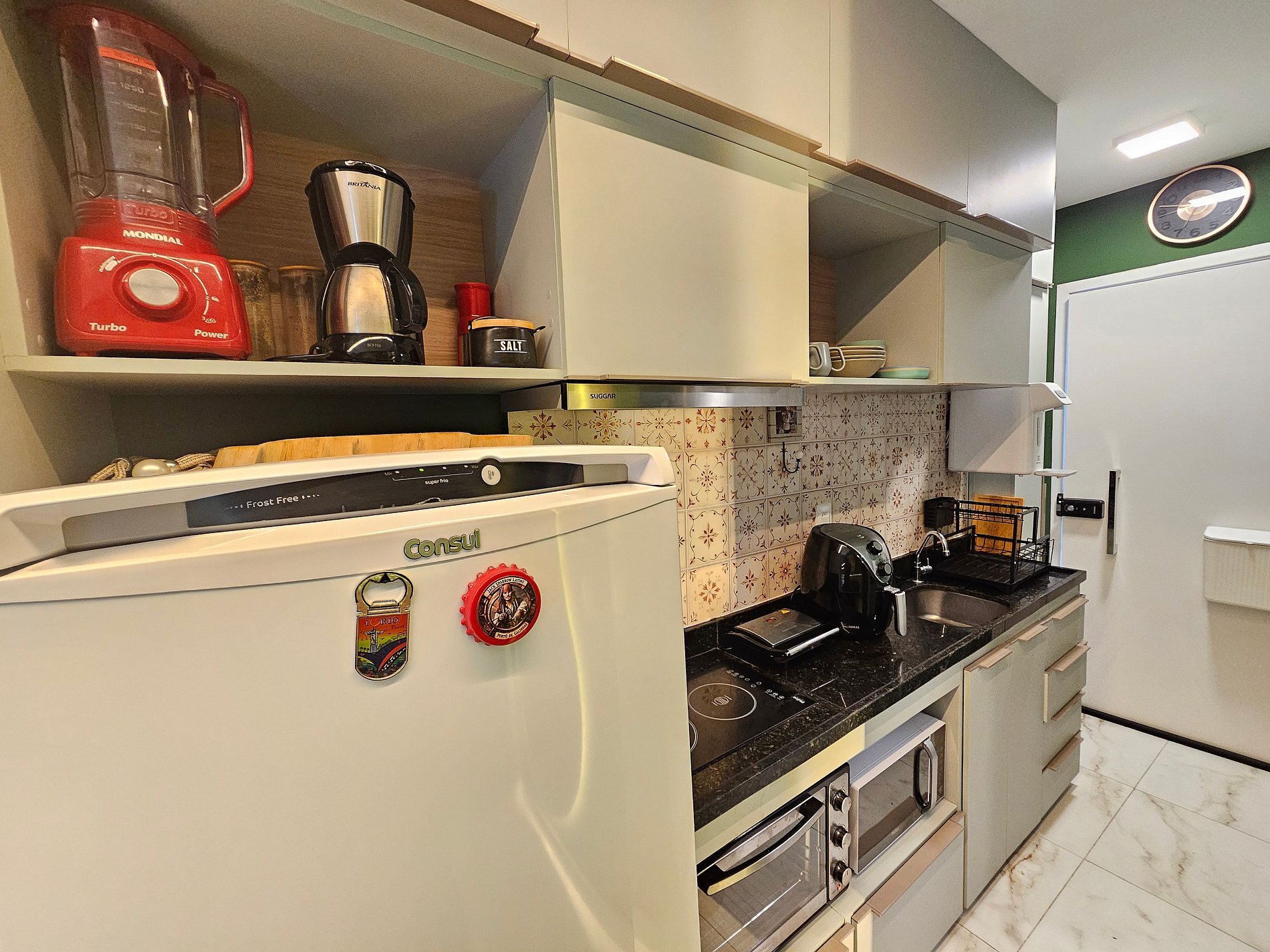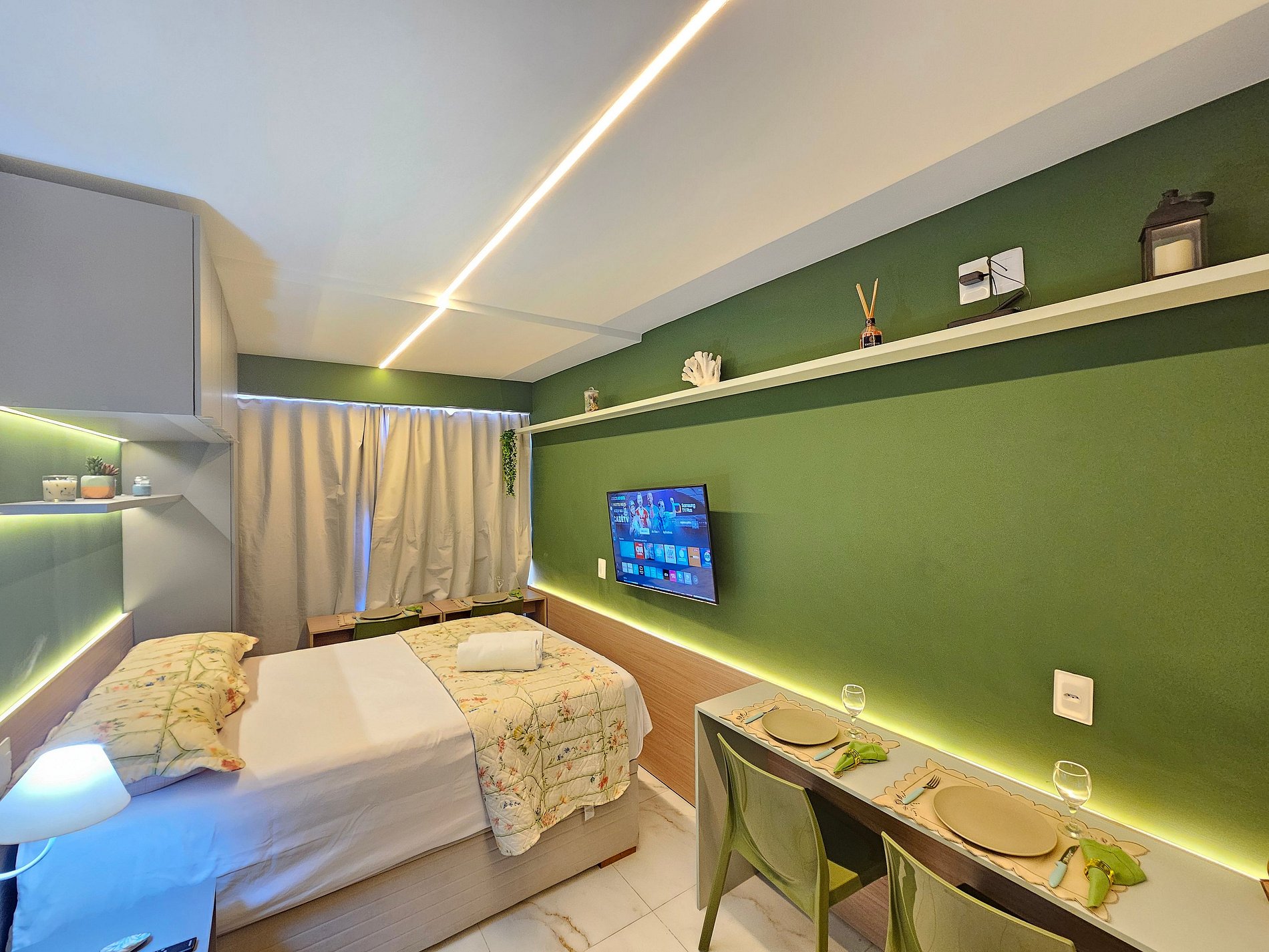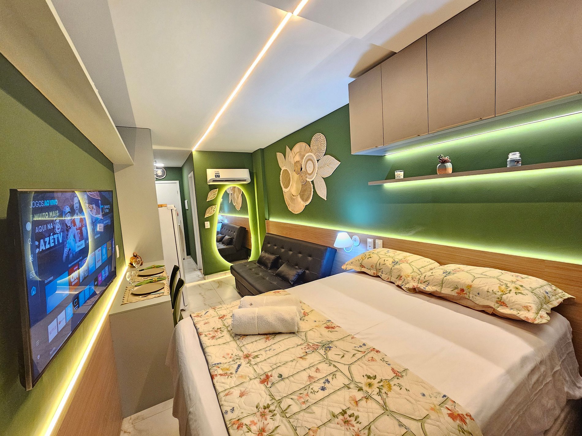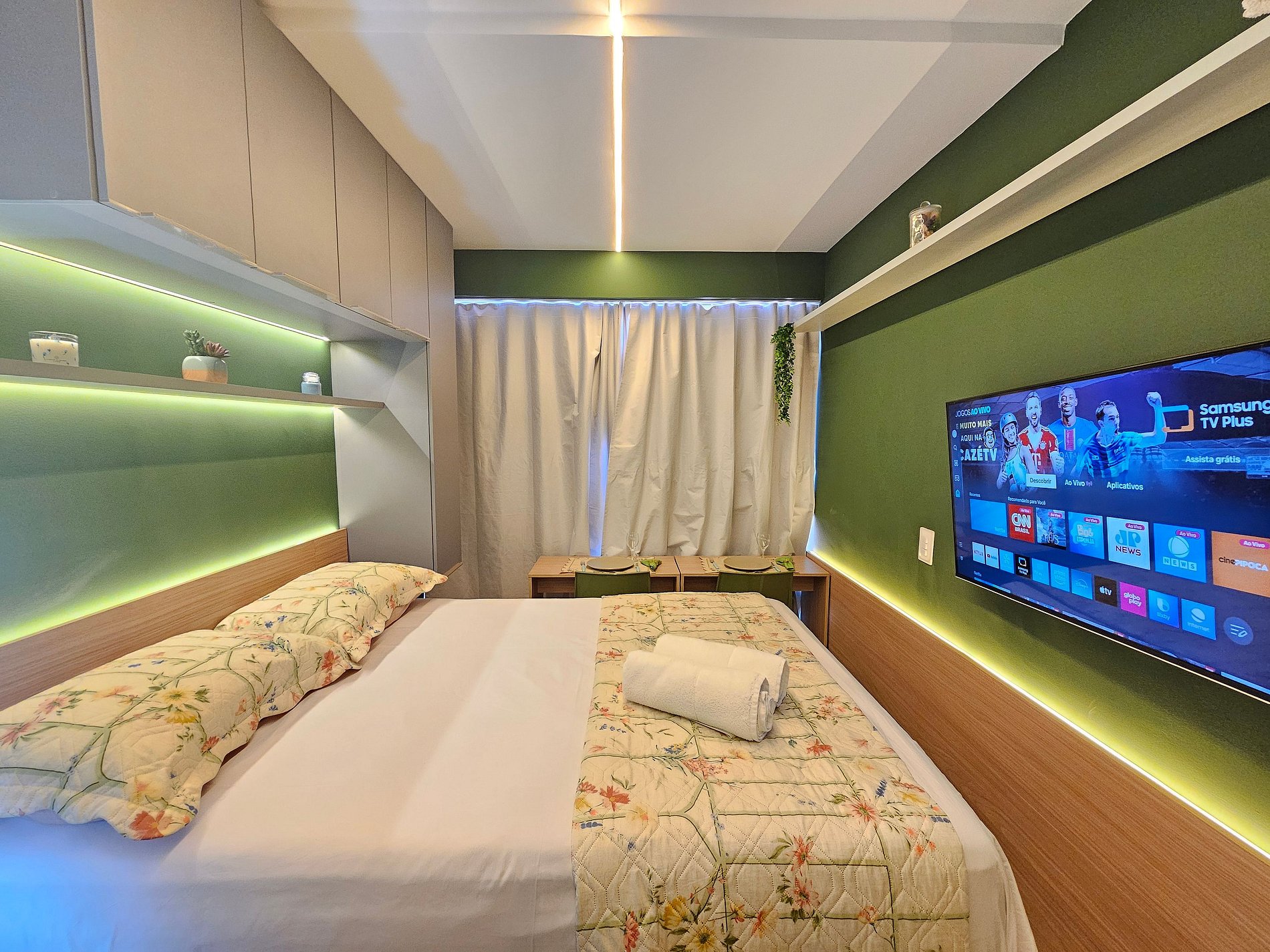 O Studio possui cama casal Queen, sofá cama, ar-condicionado e TV. A cozinha é compacta e equipada com os principais itens como louça, copos, panelas, talheres, geladeira, airfryer, micro-ondas, liquidificador, cooktop 2 bocas, liquidificador e sanduicheira. O flat possui 01 banheiro completo e dispõe de secador de cabelo.