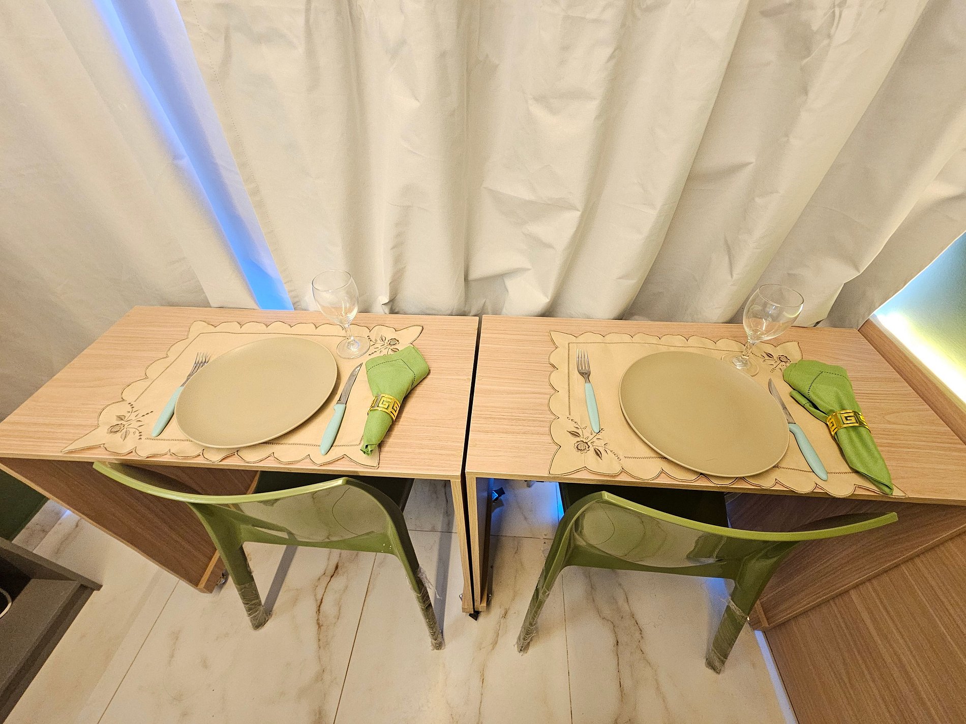 - Suíte: 01 cama de casal Queen + 01 sofá cama, TV, mesas com 4 cadeiras e armário.
