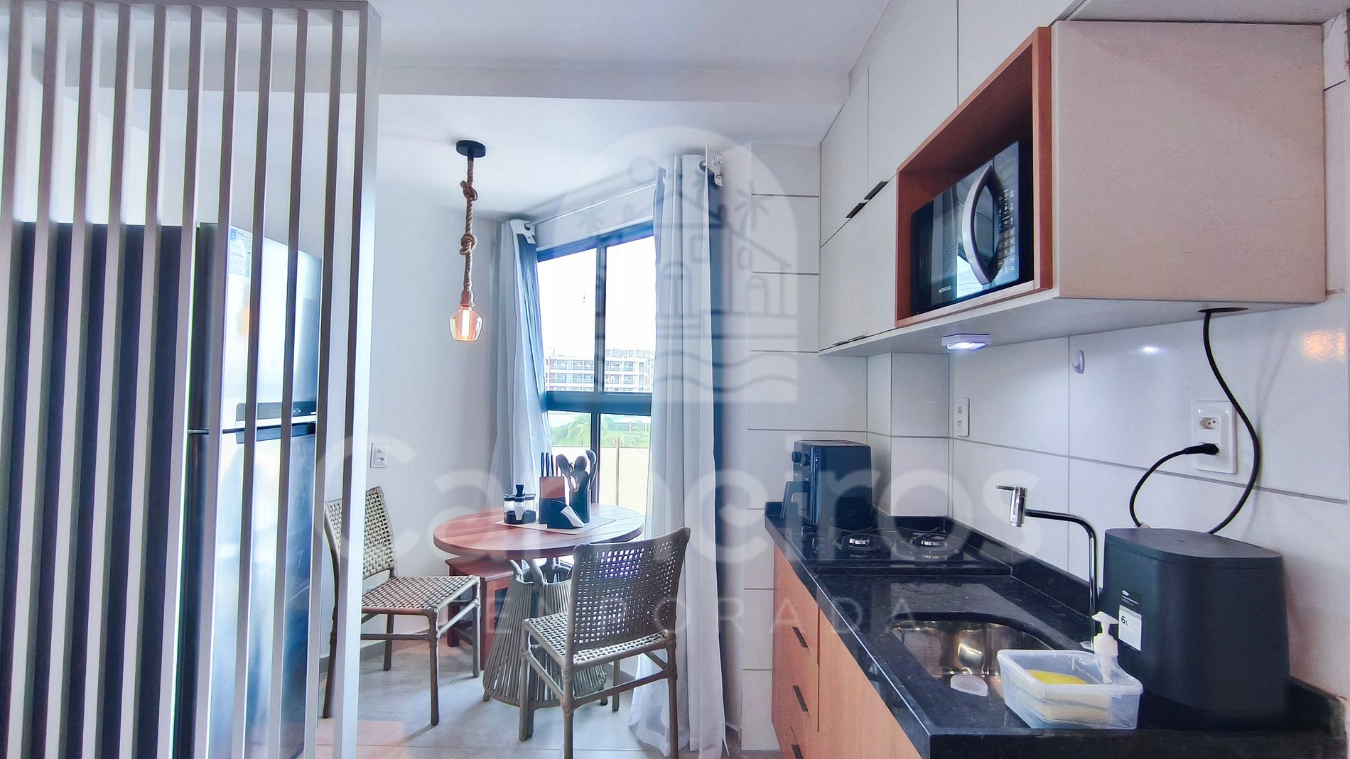 O studio conta com banheiro privativo e cozinha completa, equipada com louças, copos, panelas, talheres, cooktop, micro-ondas, airfryer, cafeteira, geladeira e diversos utensílios, oferecendo total comodidade para o preparo das refeições.