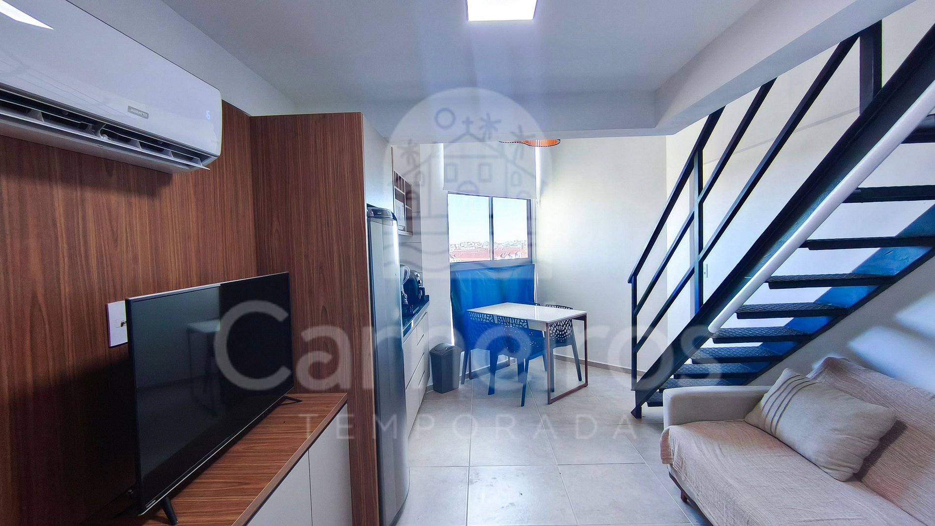 O estúdio conta com decoração moderna e é totalmente climatizado, oferecendo TV e ar-condicionado para maior conforto durante a estadia. A cozinha é equipada com os principais utensílios para o dia a dia, como: louças, copos, panelas, talheres, cooktop, geladeira, liquidificador, airfryer , micro-ondas e diversos utensílios.