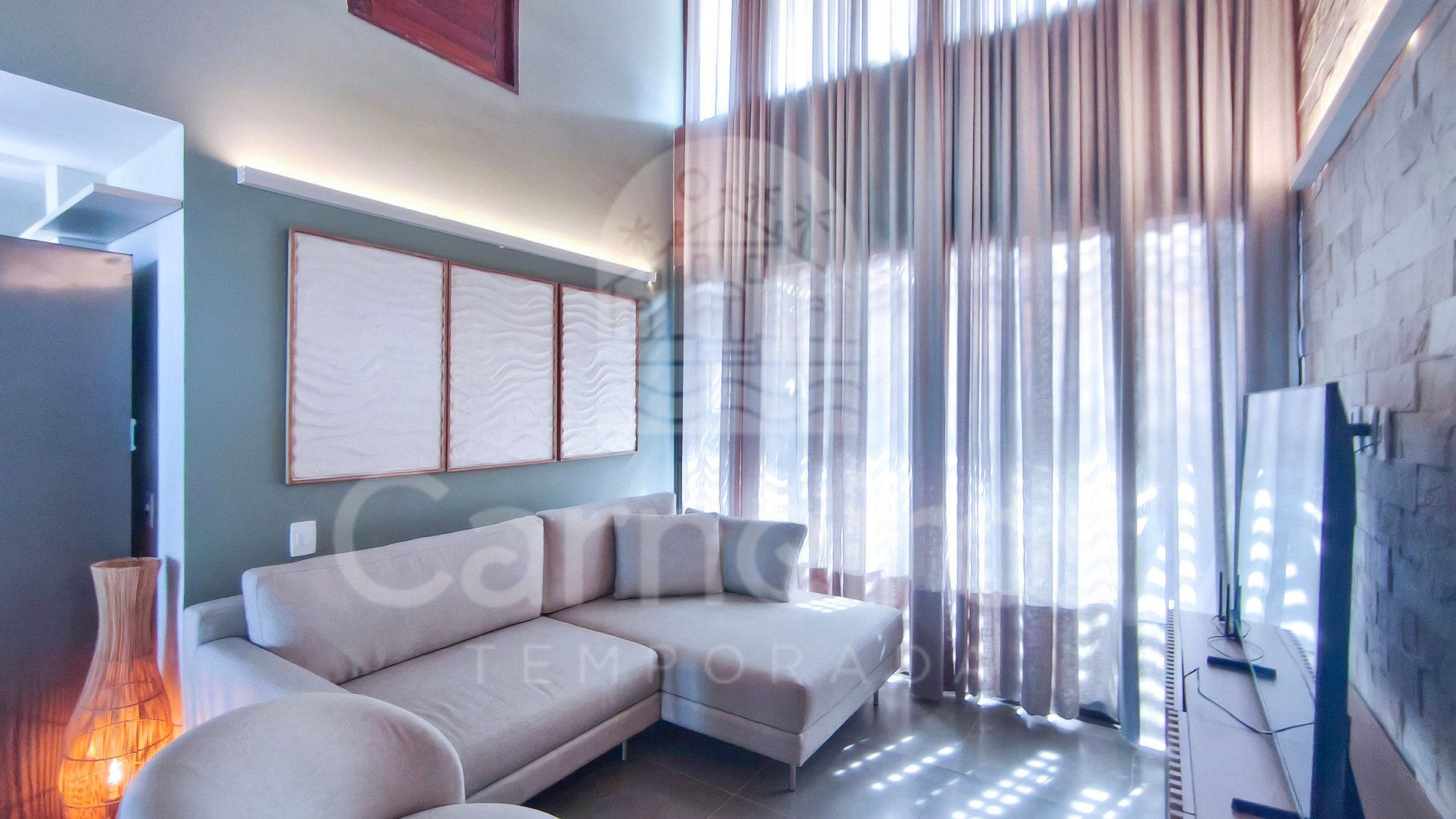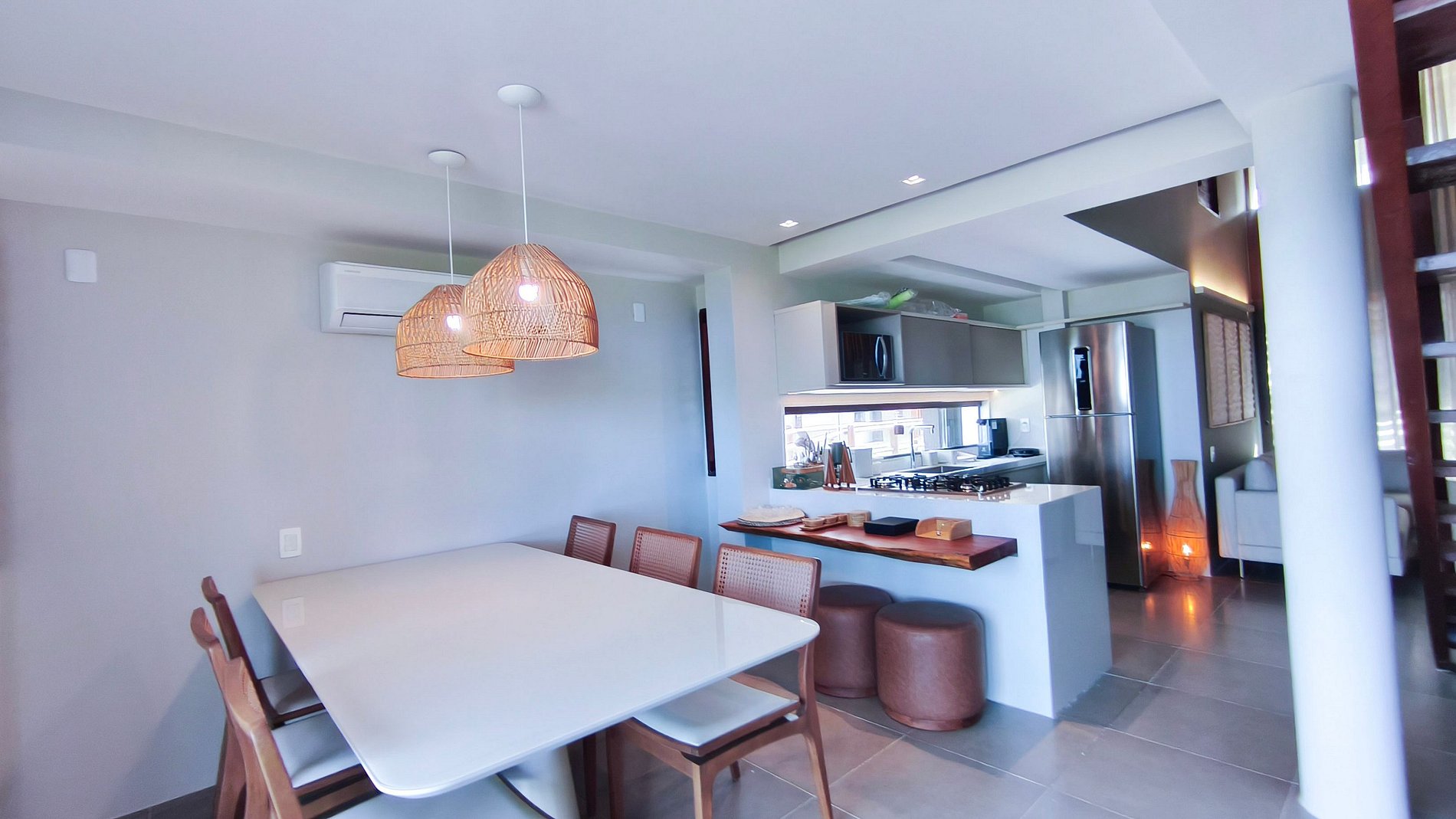 Área externa: Varanda privativa com vista para a praia, mesa com cadeiras, 02 espreguiçadeiras, área gourmet e chuveiro externo.