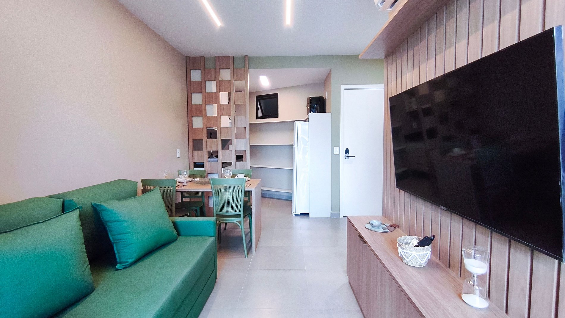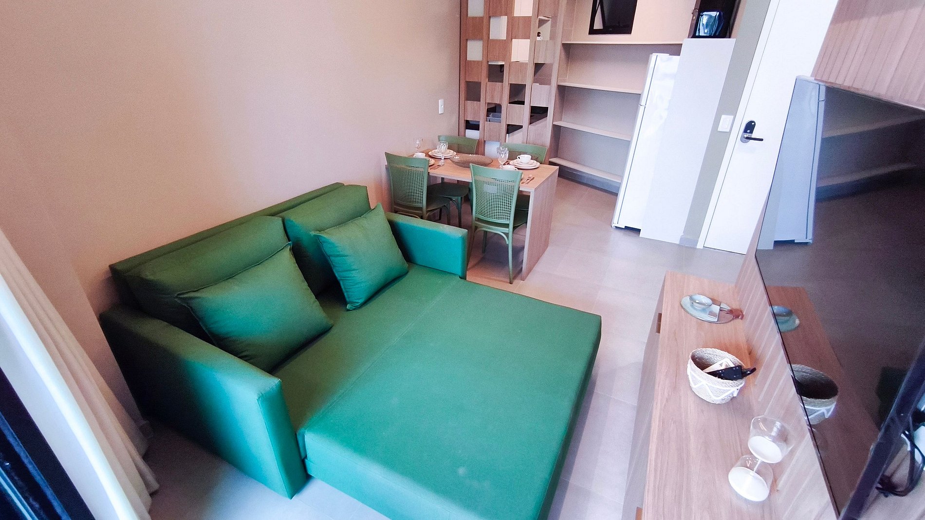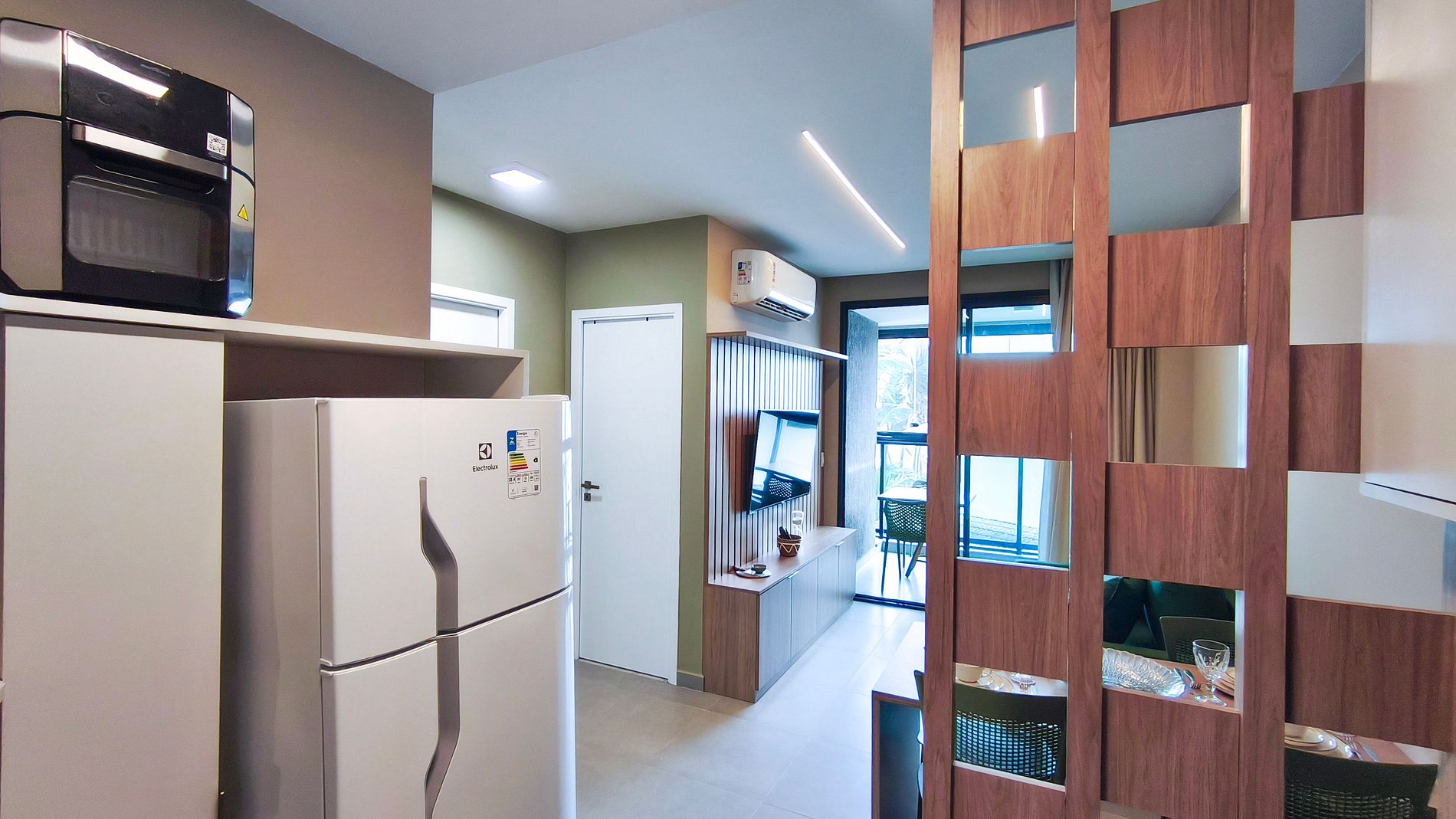 O ambiente é integrado e conta com decoração acolhedora. Dispõe de varanda, quarto, cozinha e banheiro. A cozinha é completa, equipada com geladeira, cooktop, airfryer, cafeteira, liquidificador, sanduicheira, microondas e diversos utensílios. O imóvel oferece TV, ar-condicionado e banheiro completo.