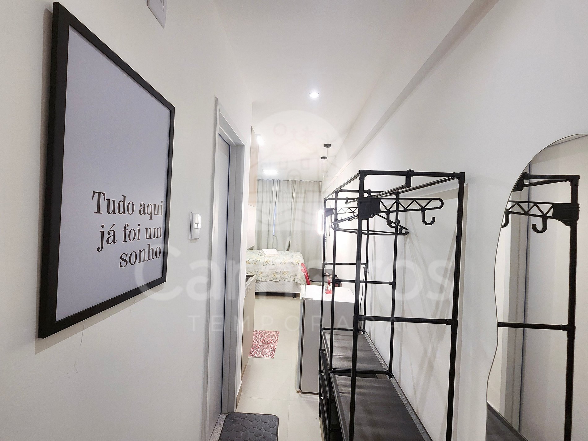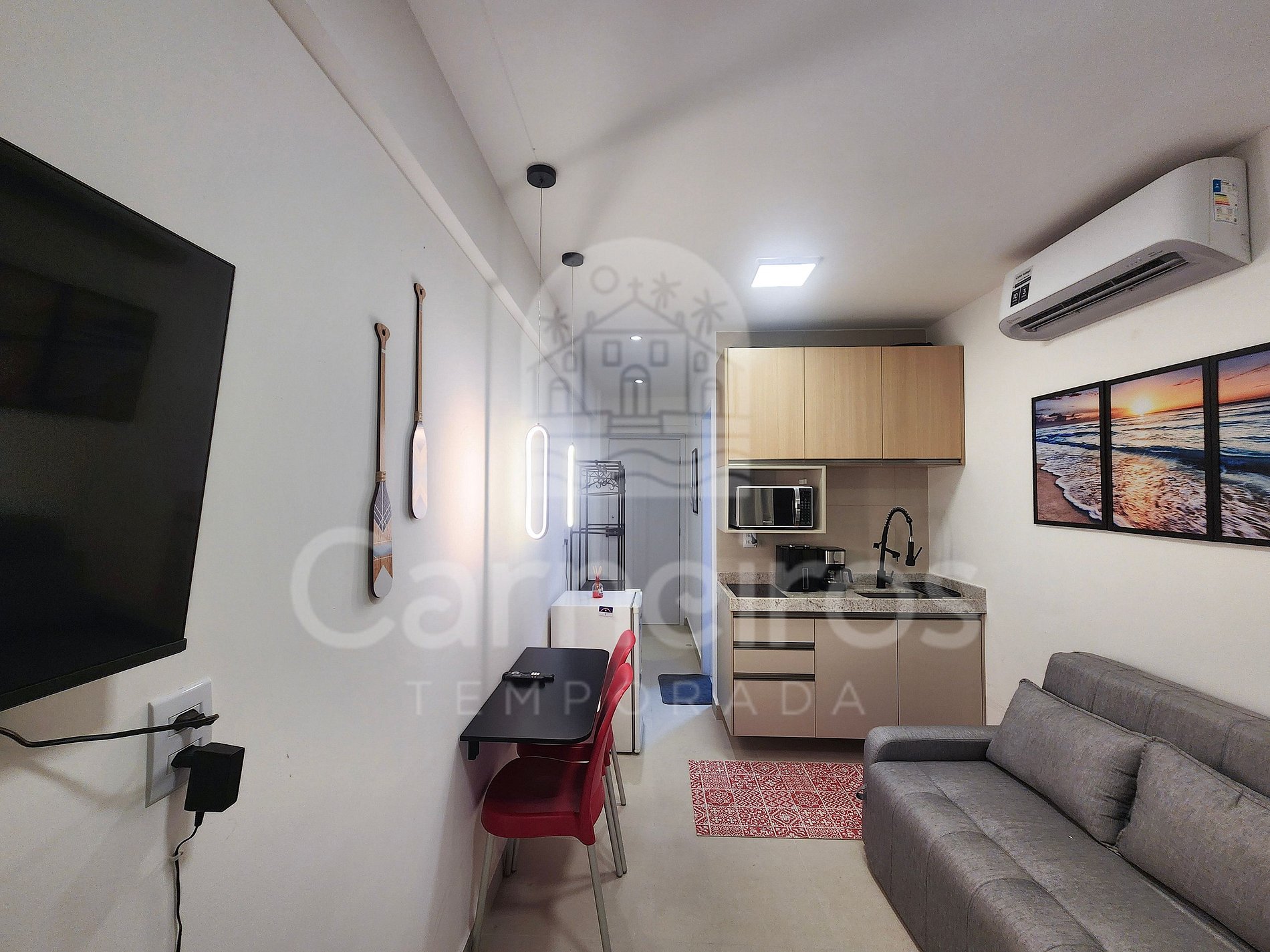 Possui ambiente integrado, com decoração moderna e aconchegante. Pensando na sua comodidade, o espaço dispõe de ar-condicionado, TV, Wi-Fi, armários, secador de cabelo e varal. A cozinha é completa e funcional, equipada com frigobar, fogão, micro-ondas, liquidificador, sanduicheira, cafeteira, airfryer e utensílios diversos, permitindo preparar refeições com praticidade durante a estadia. Há ainda uma mesa interna de parede dobrável com duas cadeiras e uma mesa na varanda com cadeiras, proporcionando um espaço agradável tanto para refeições quanto para momentos de descanso.