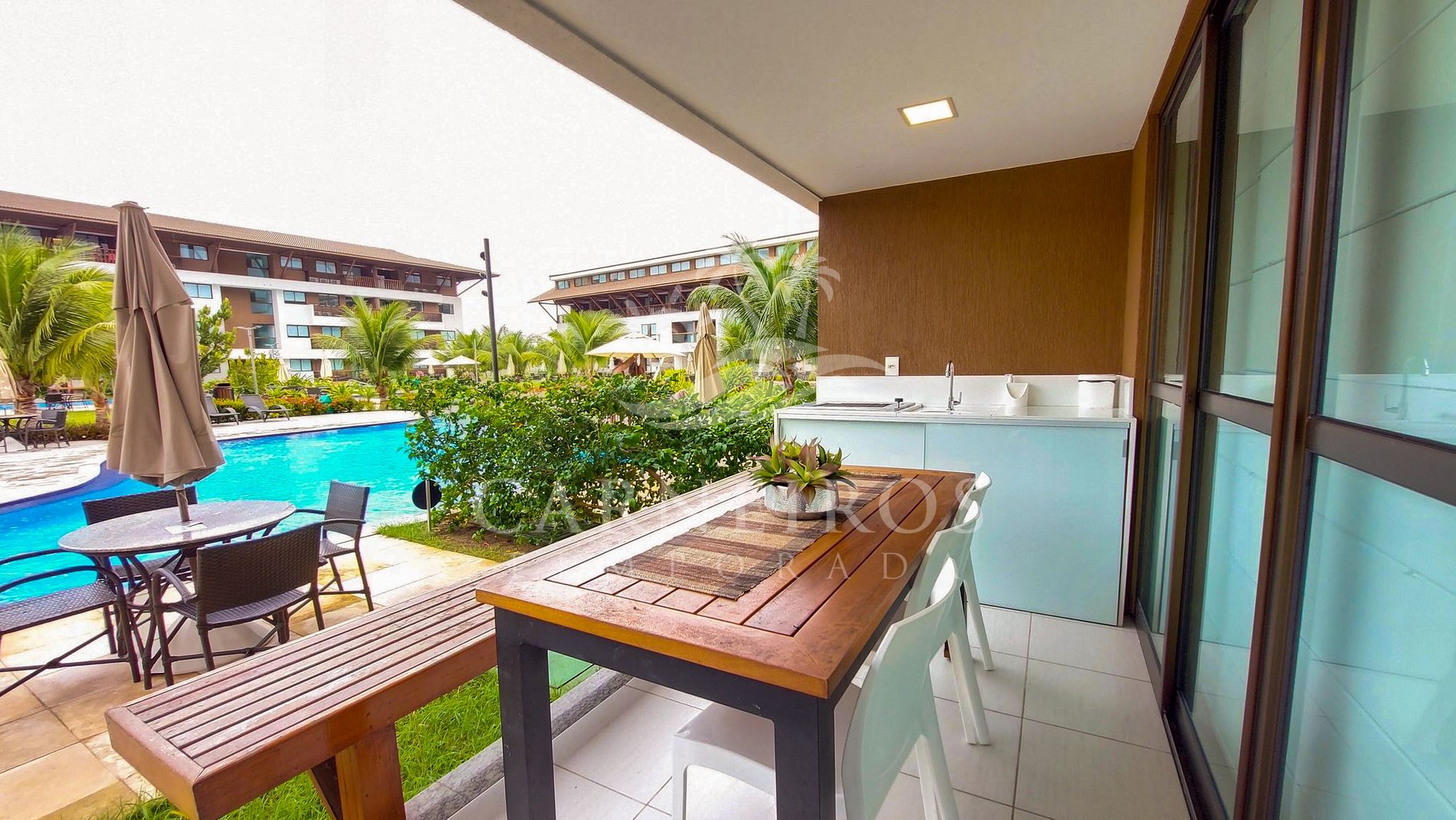 ✹ O flat se encontra no andar térreo do prédio com vista para a piscina e possui uma varanda com churrasqueira, cervejeira, mesa, bancos e cadeiras✹