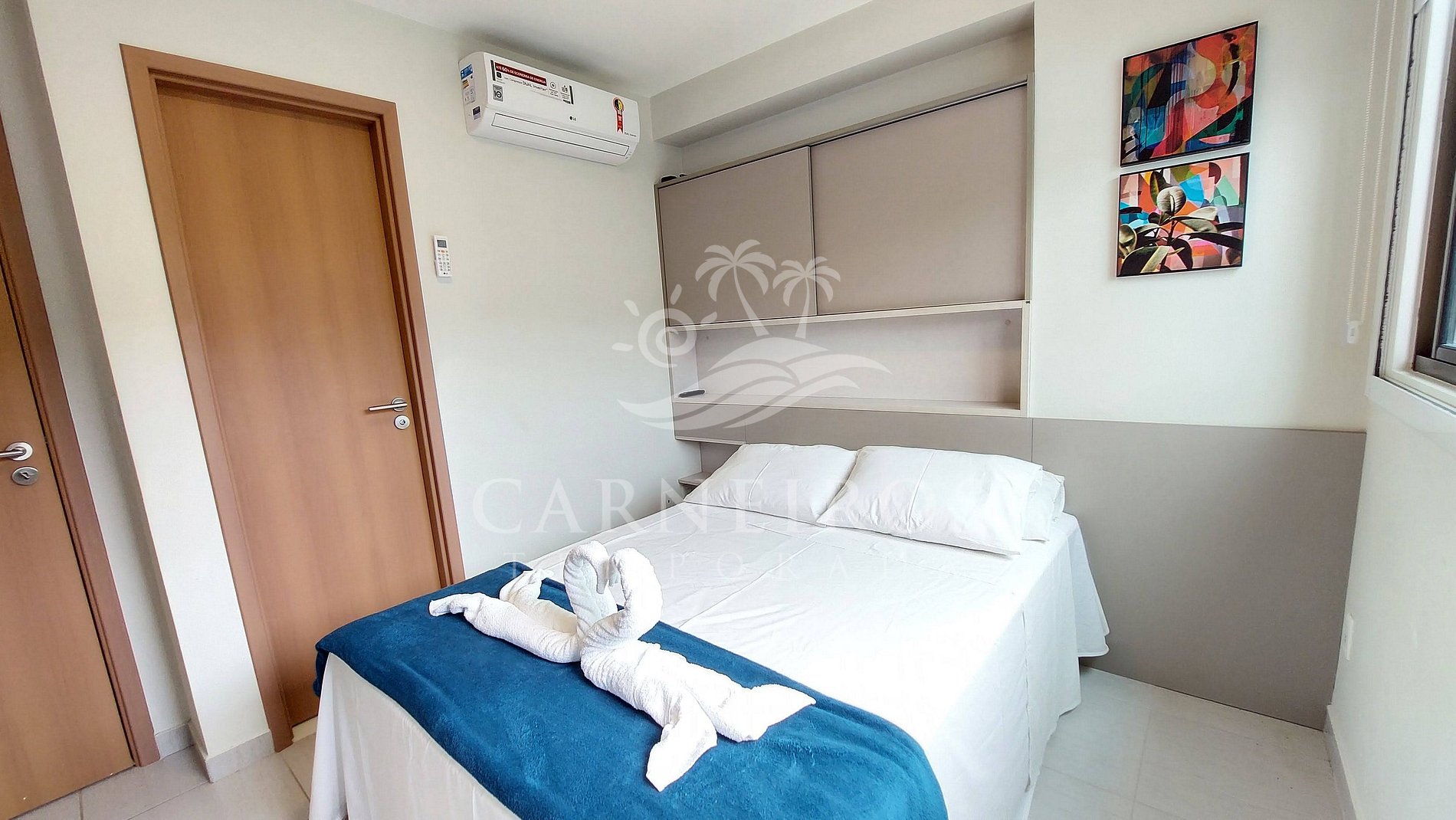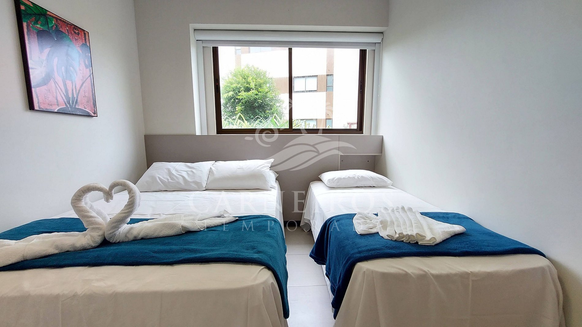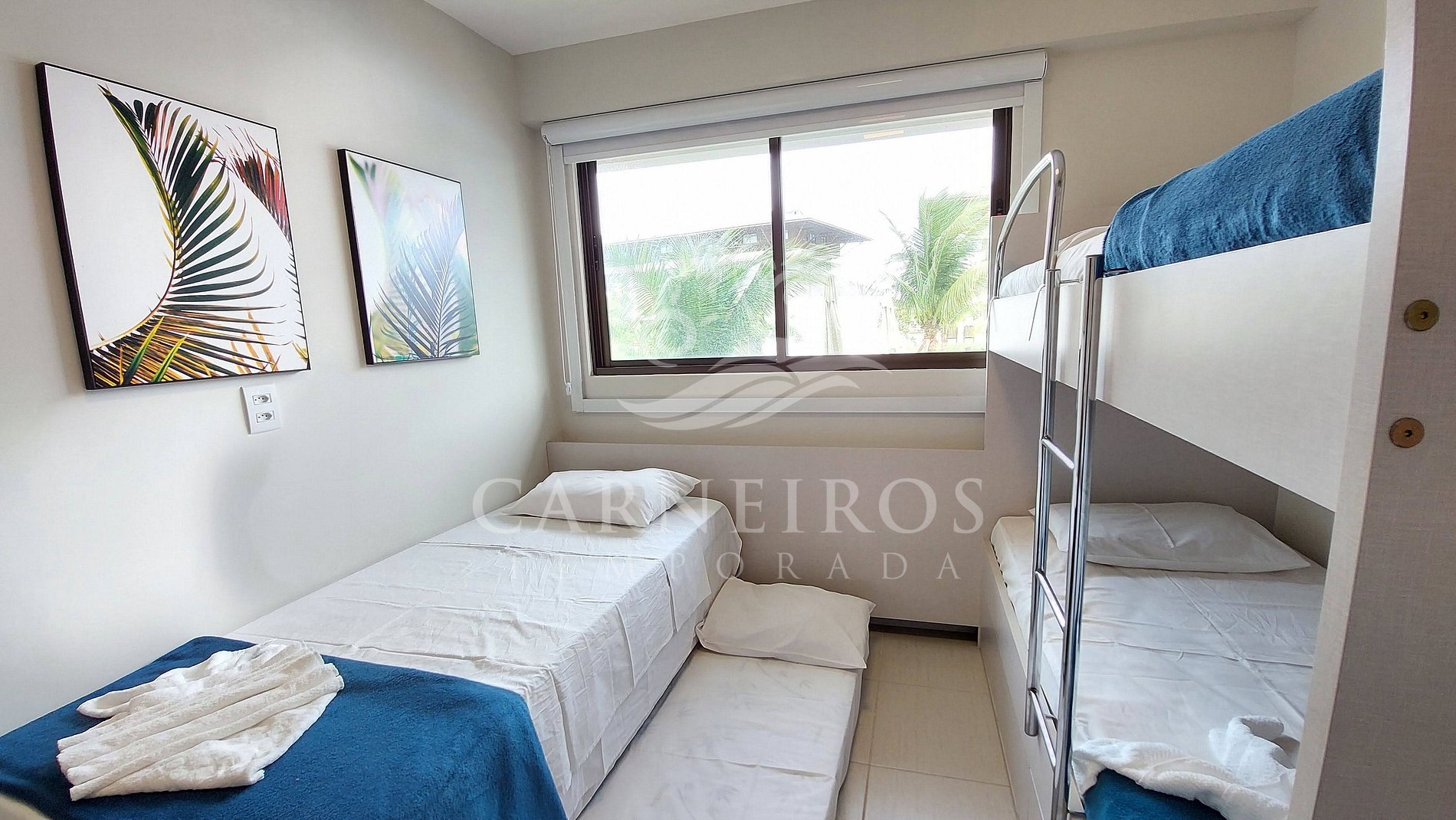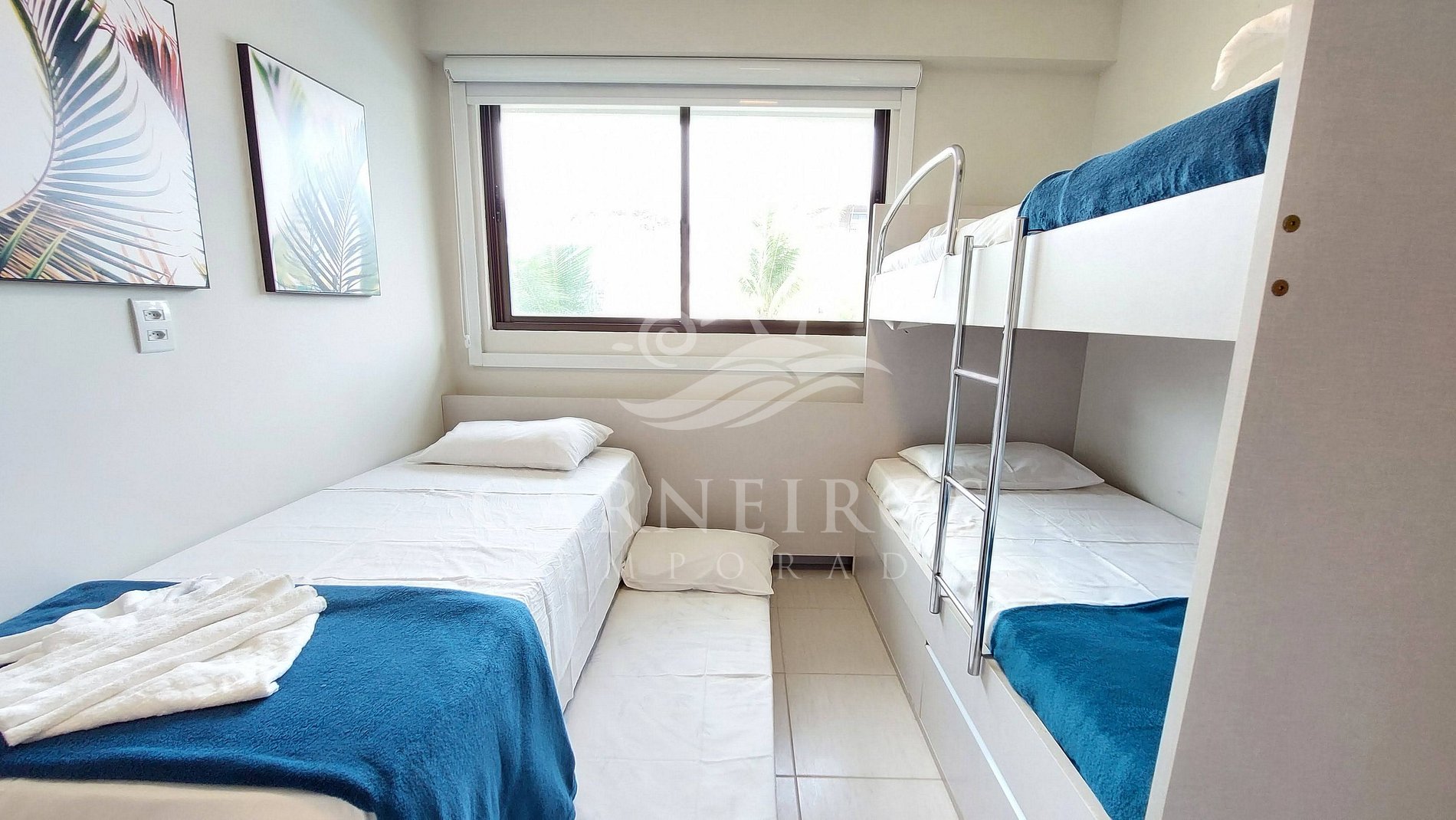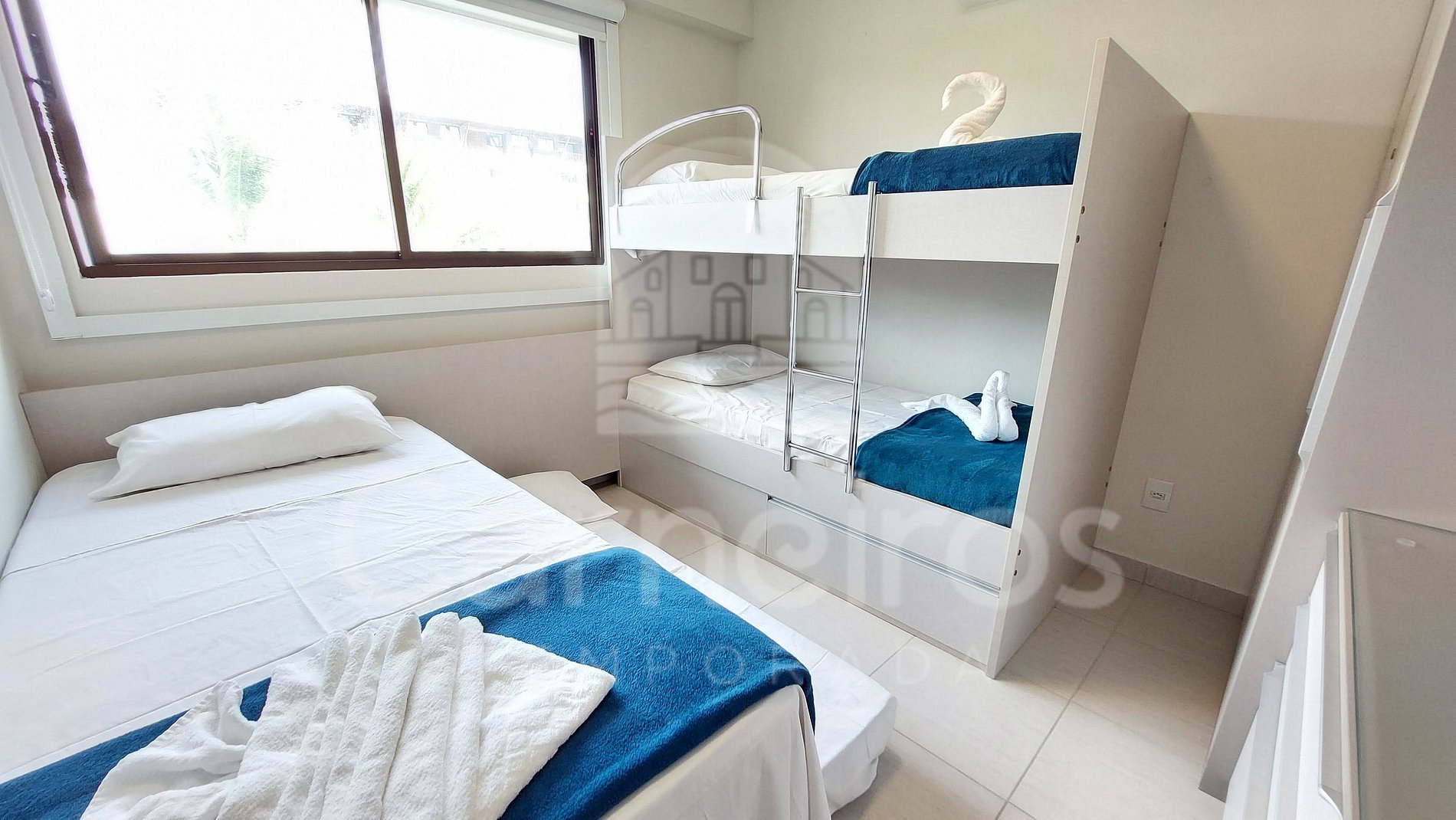 - Quarto 02 (triplo): 01 cama box de casal + 01 bicama de solteiro, TV, armário para bagagens e ar-condicionado;