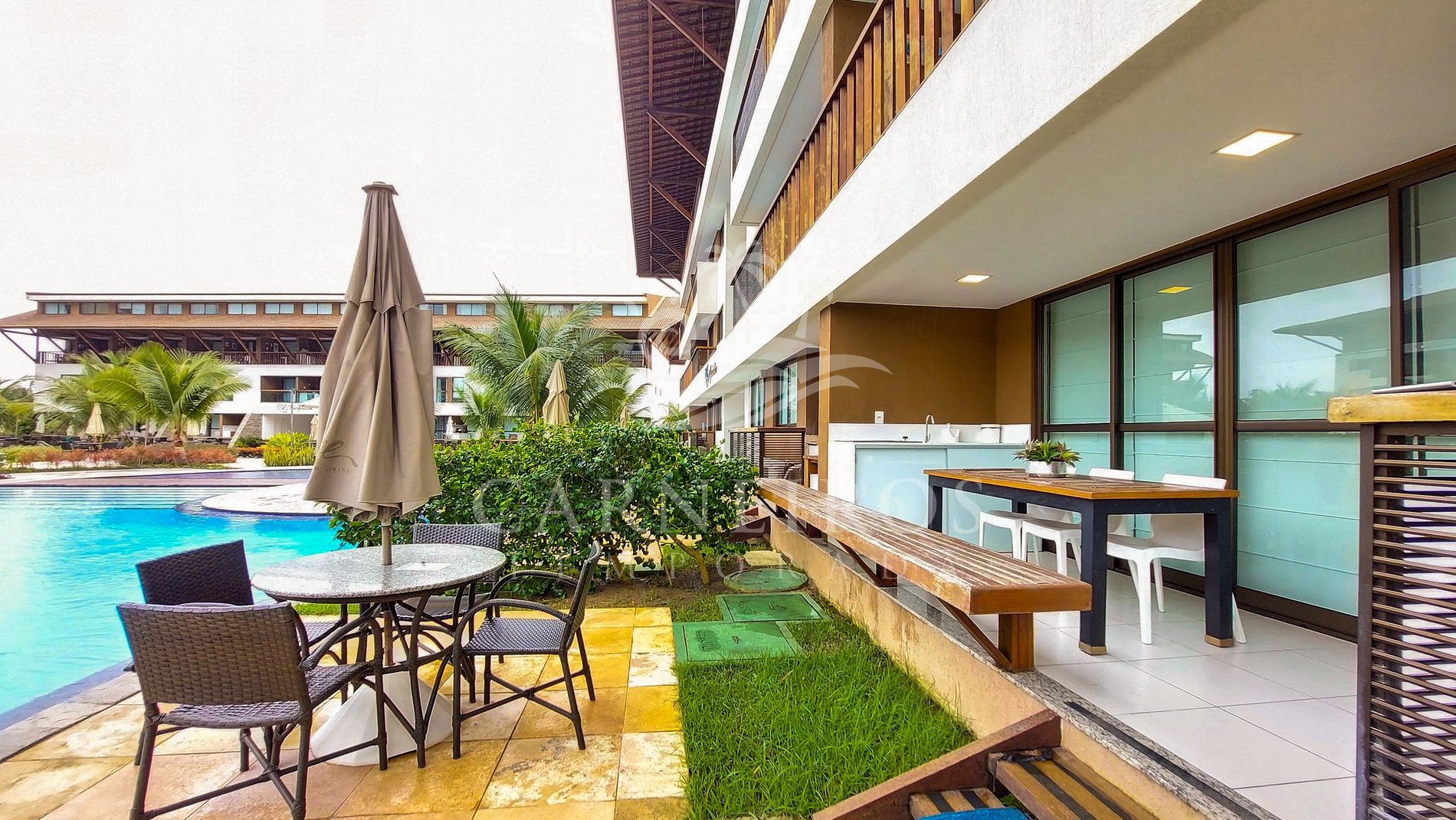 ✹ O flat se encontra no andar térreo do prédio com vista para a piscina e possui uma varanda com churrasqueira, cervejeira, mesa, bancos e cadeiras✹