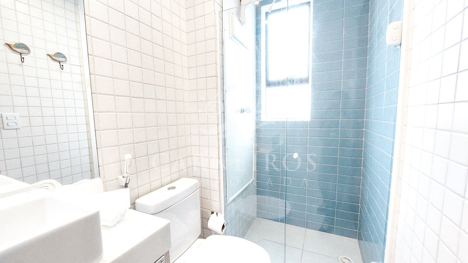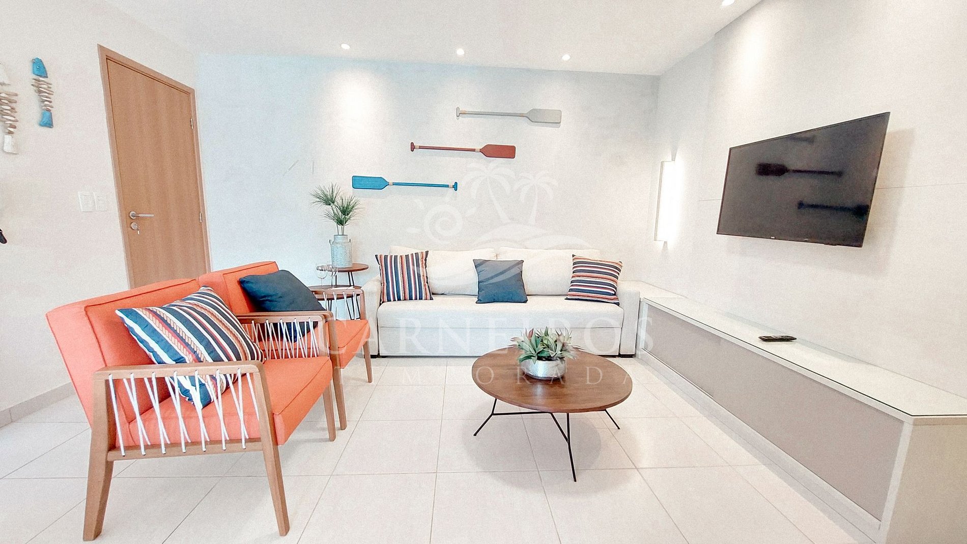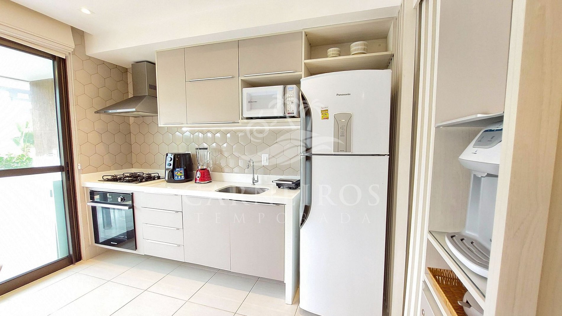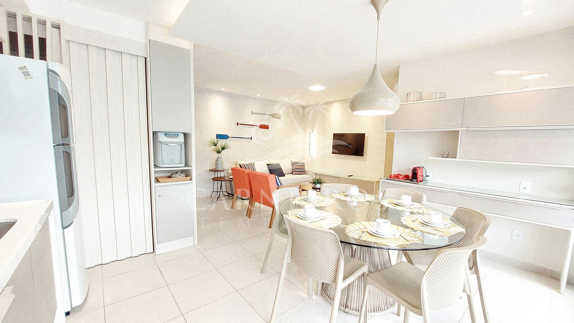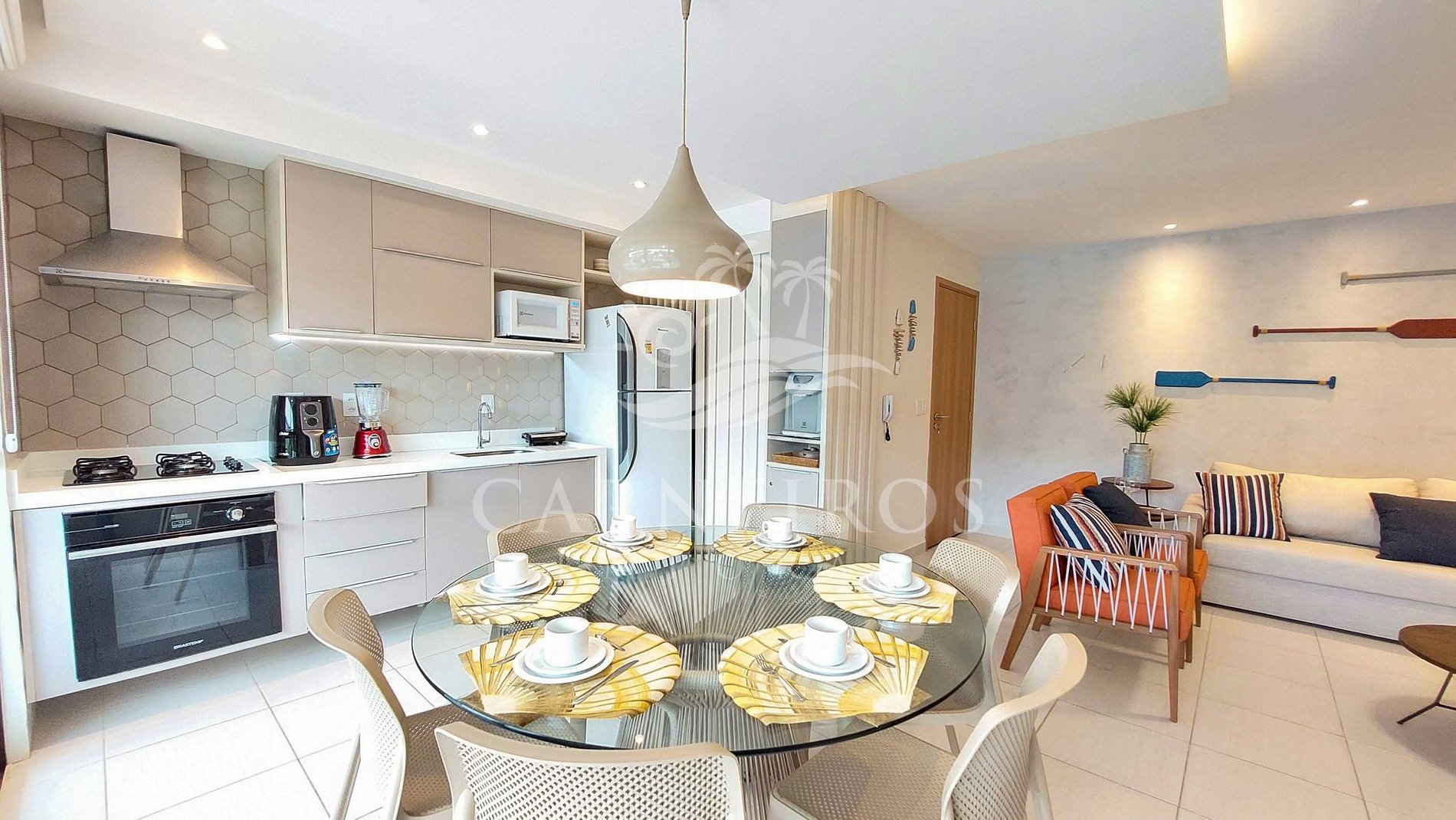 A sala tem uma agradável decoração minimalista com TV, sofá-cama de casal, duas poltronas, mesa de centro e ar-condicionado. A cozinha é completa e equipada com os principais utensílios como geladeira, micro-ondas, fogão, forno, liquidificador, bebedouro, sanduicheira, cafeteira, air fryer, maquina de café (capsulas) e outros, contando também com uma mesa e 06 cadeiras. Possui também 1 banheiro social com box, armário e chuveiro quente, além do banheiro da suíte.