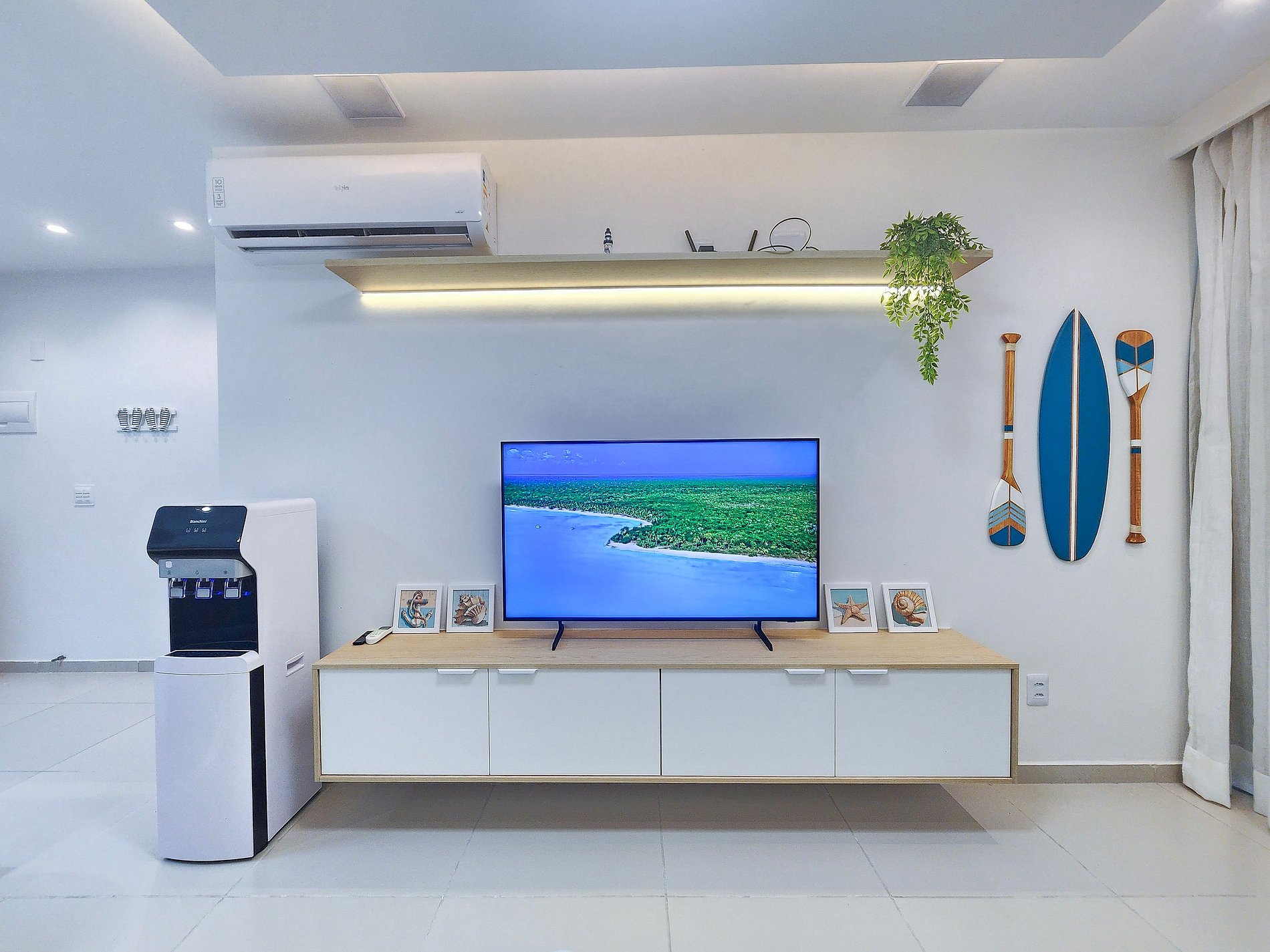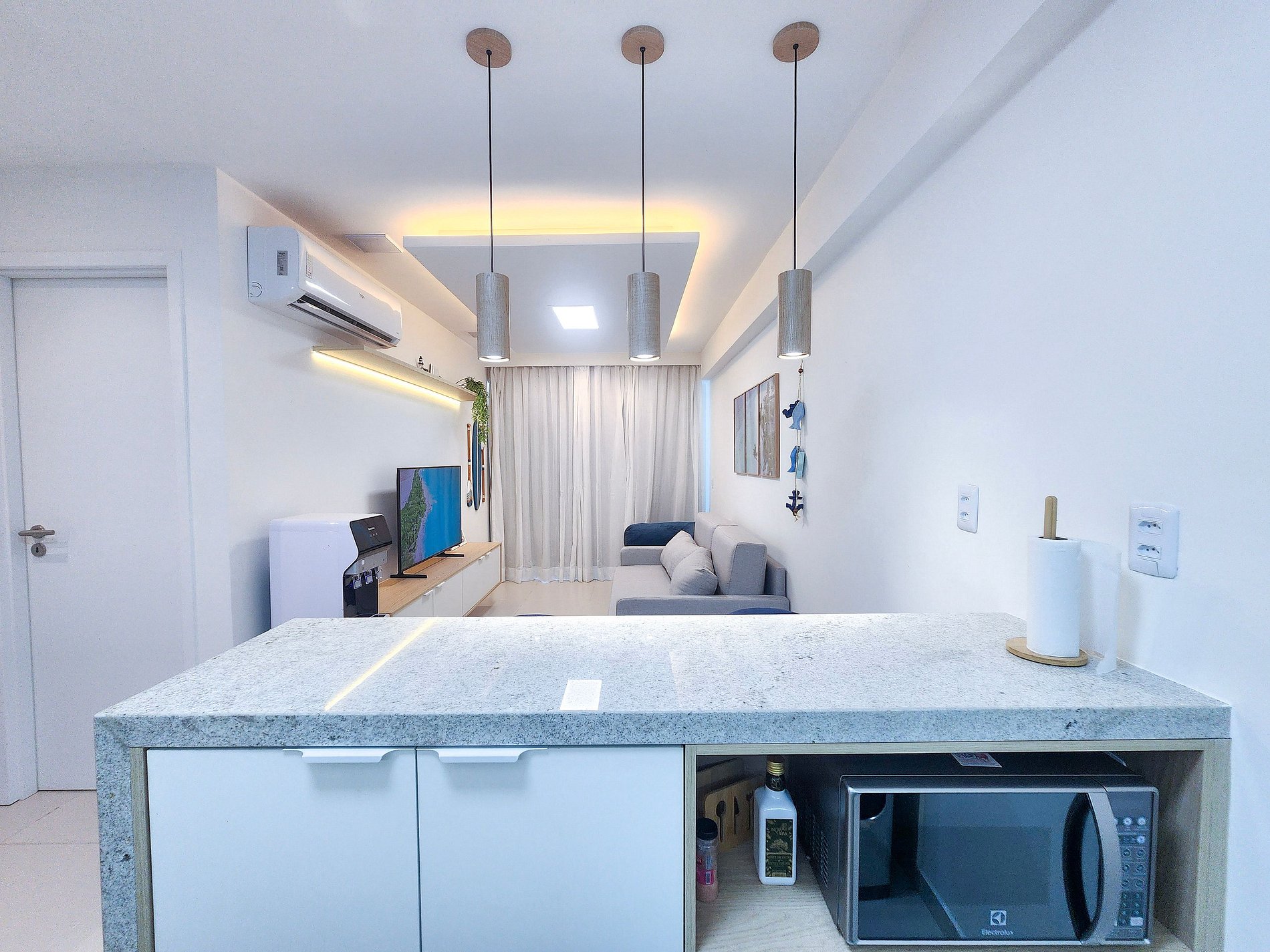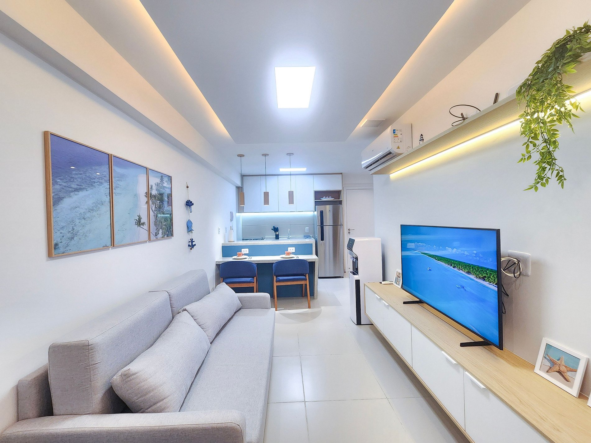 O ambiente possui decoração moderna e aconchegante, com TV, sofá confortável e ar-condicionado, garantindo conforto durante toda a estadia. A cozinha é completa e totalmente equipada, oferecendo louças, copos, panelas, talheres, liquidificador, sanduicheira, cafeteira, bebedouro, airfryer, micro-ondas, fogão, geladeira e diversos utensílios para que você se sinta em casa. O imóvel dispõe de 01 banheiro completo.