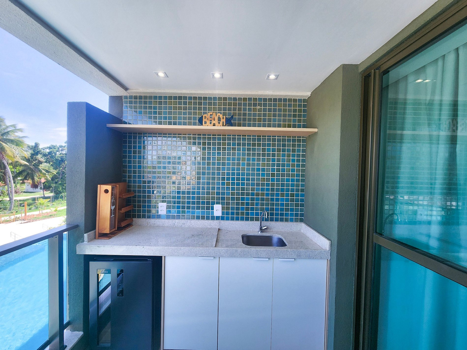 ✹ O imóvel está localizado no 2º andar e conta com varanda privativa com vista para a piscina, equipada com mesa, cadeiras, churrasqueira elétrica e cervejeira — perfeito para momentos de lazer e descanso. ✹