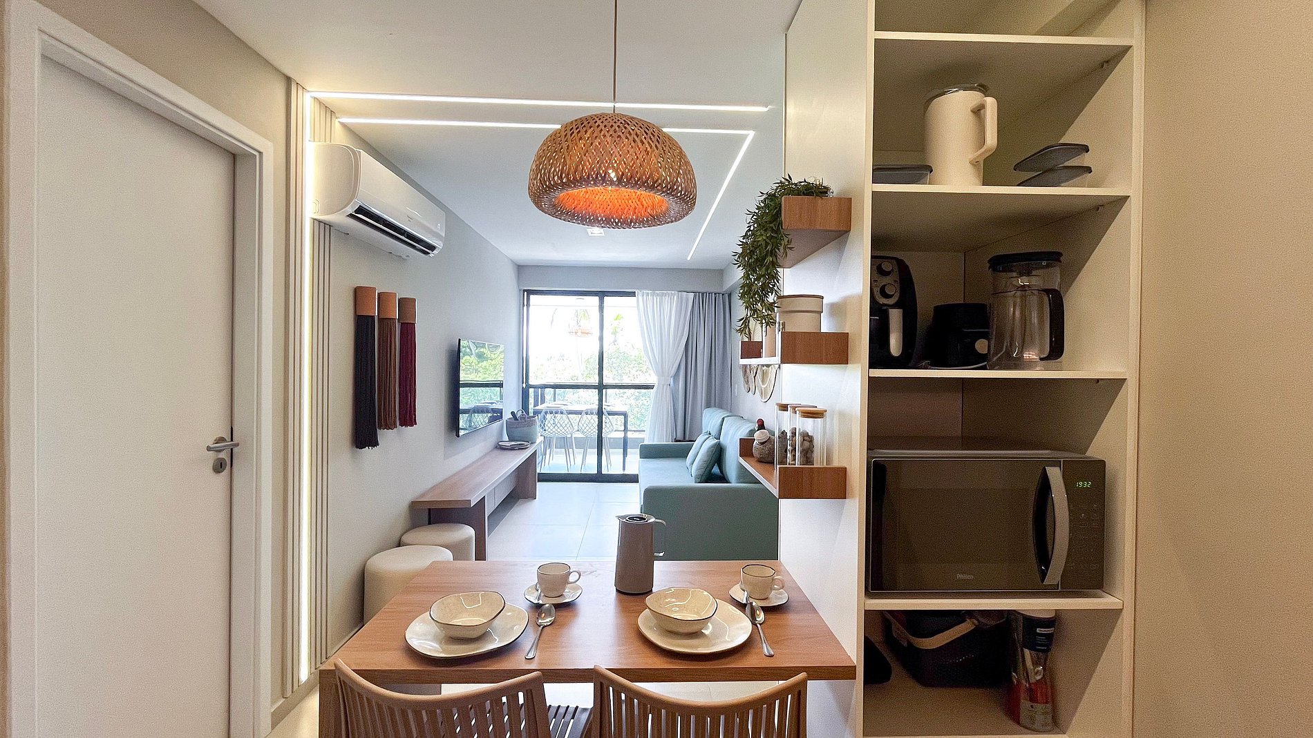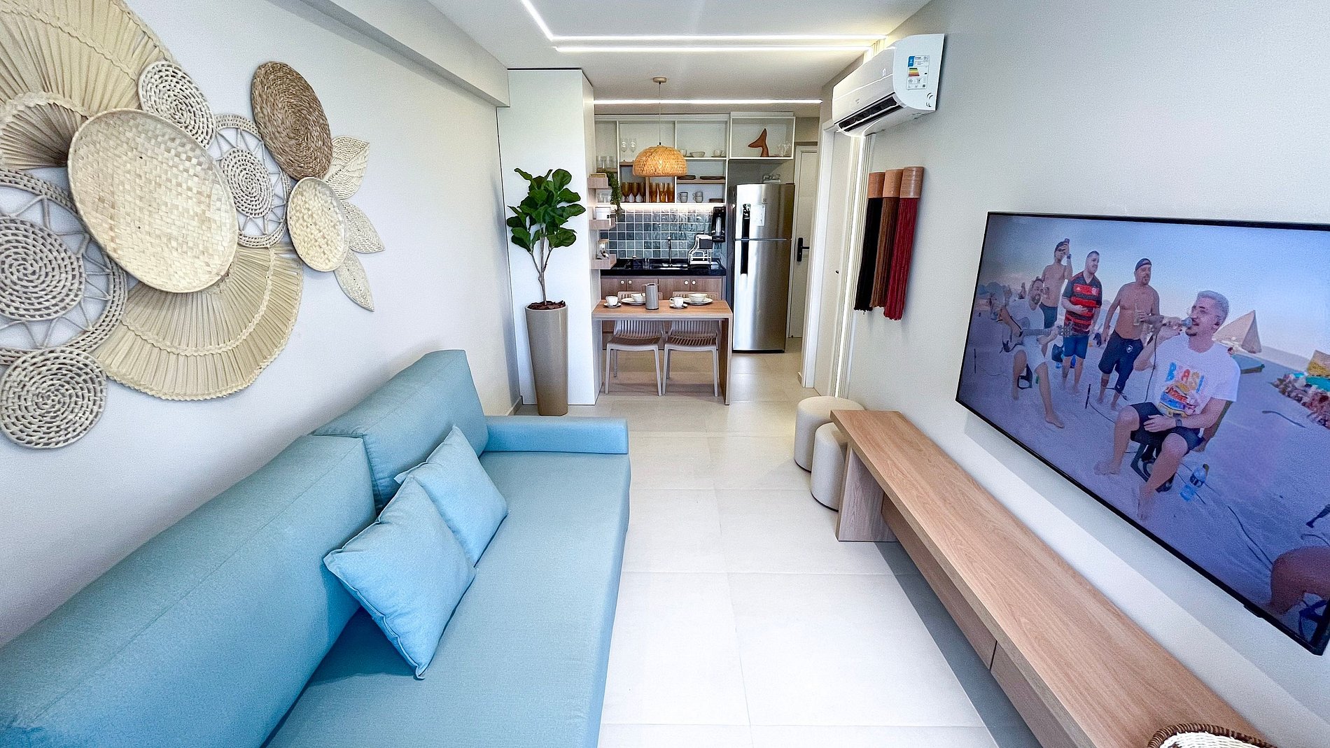Este apartamento de um quarto acomoda até cinco hóspedes com praticidade, dispondo de cama de casal, sofá-cama e camas de solteiro em ambiente climatizado. O espaço conta com cozinha equipada e uma varanda gourmet privativa com vista para a piscina. Localizado em empreendimento à beira-mar próximo à Igrejinha dos Carneiros, o condomínio oferece estrutura composta por restaurante, diversas quadras esportivas, academia e áreas de convivência.