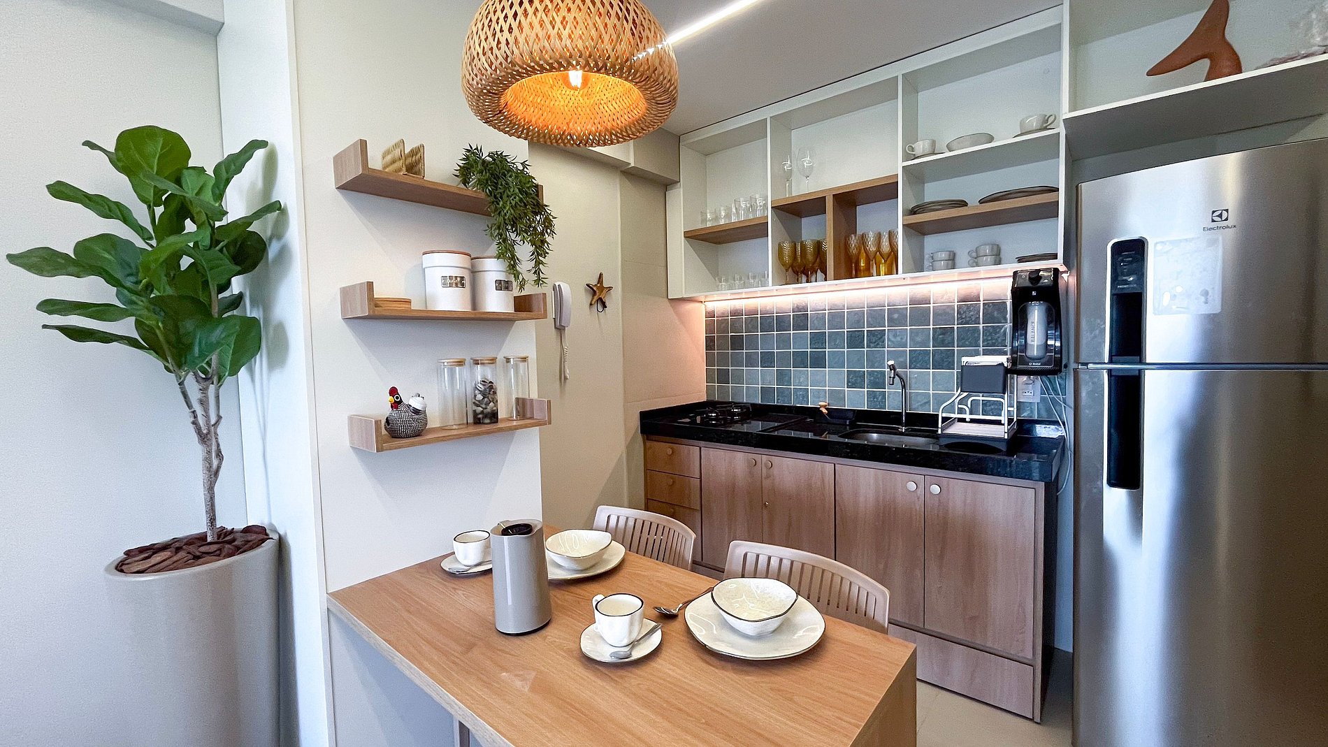 Cozinha - Equipada com geladeira, cooktop, micro-ondas, airfryer, cafeteira, sanduicheira, liquidificador, forno elétrico para pizza, louças, panelas e talheres.