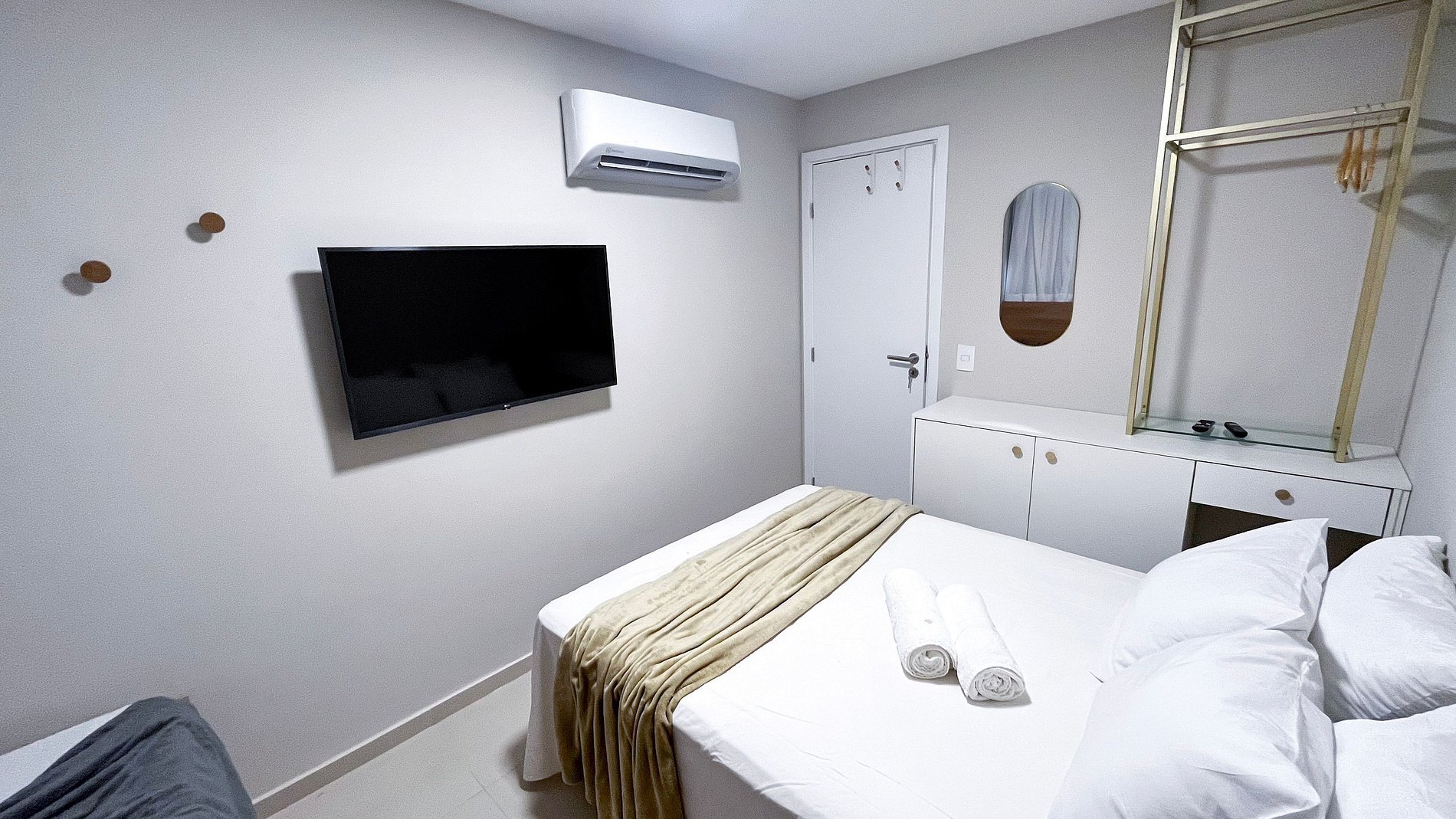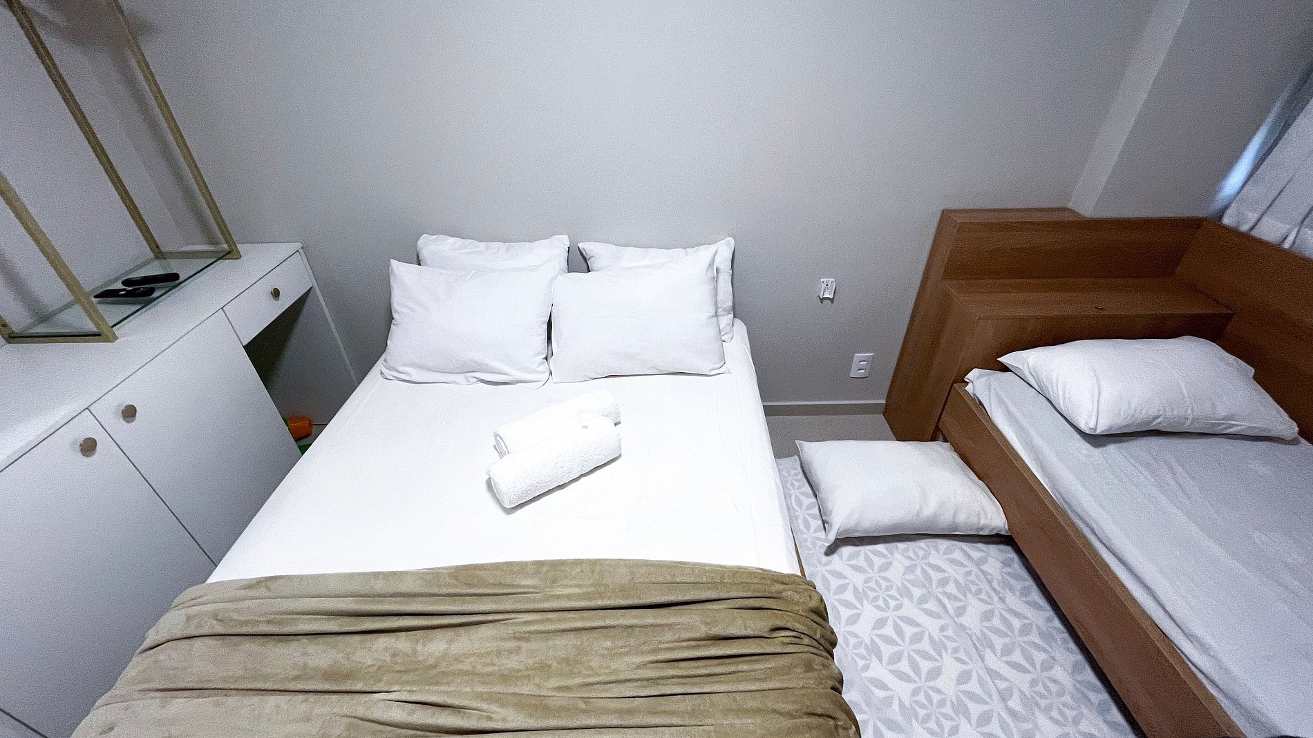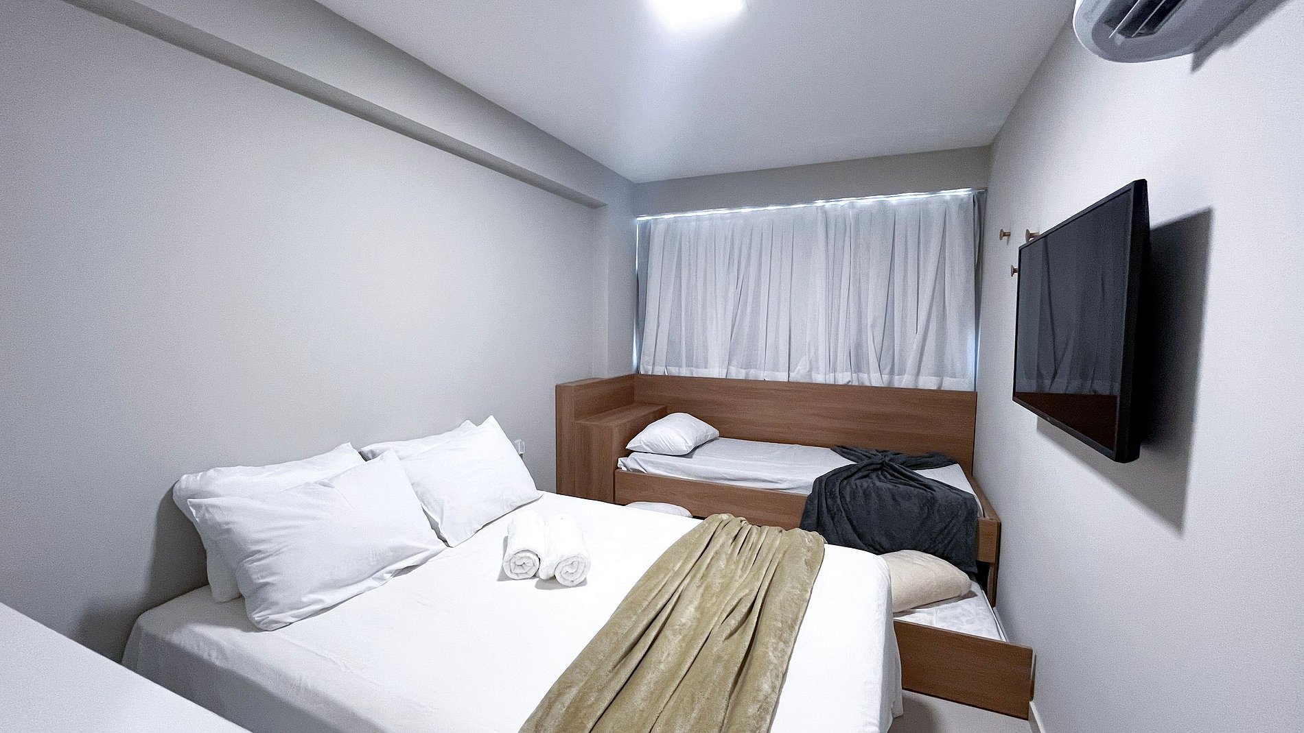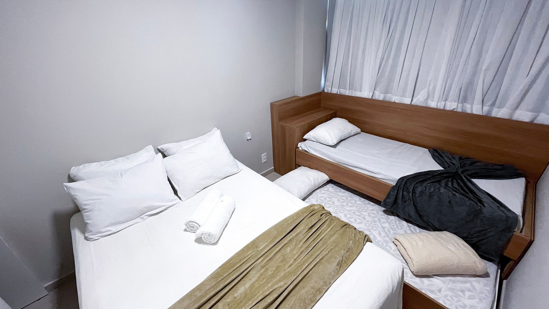Acomodação para 5 pessoas. Unidade climatizada com Wi-Fi. Configuração de camas: 01 cama de casal, 01 sofá-cama de casal e 01 cama de solteiro com 01 cama auxiliar. Disponíveis ferro de passar e TV.