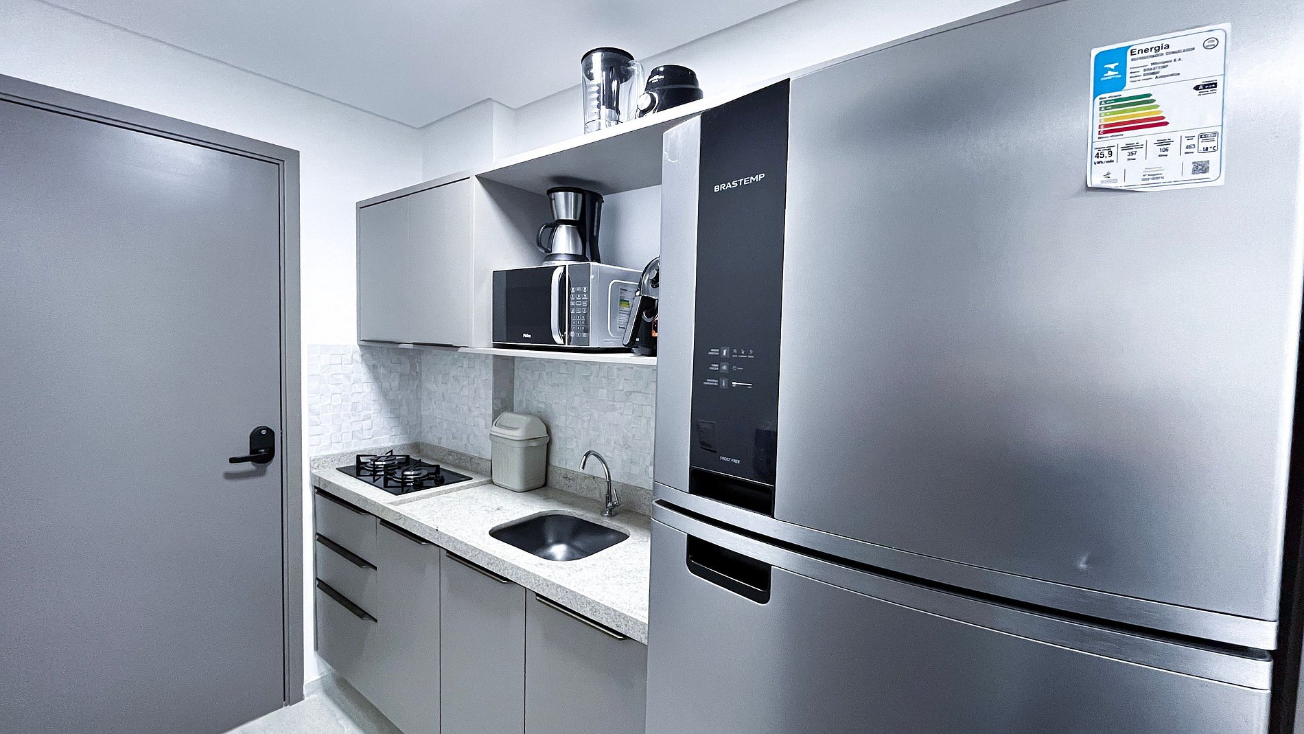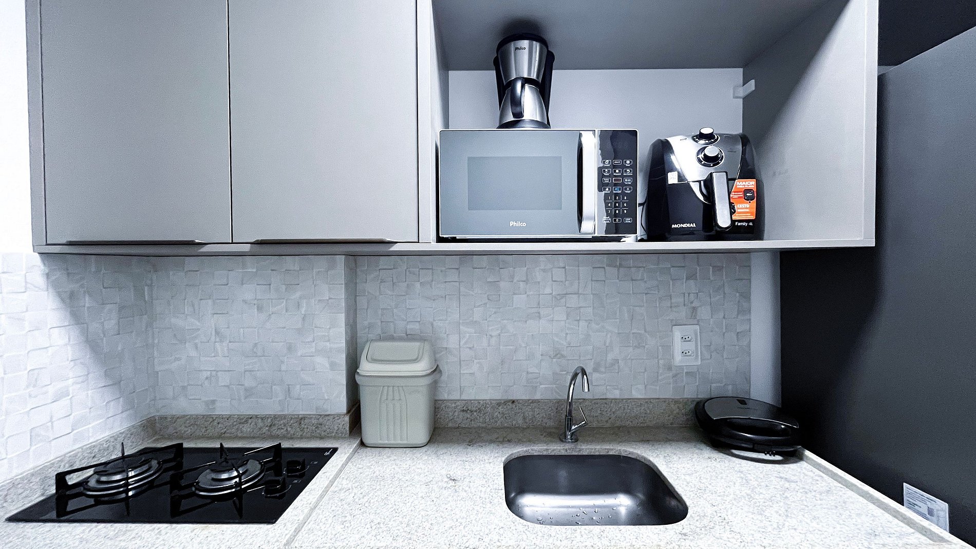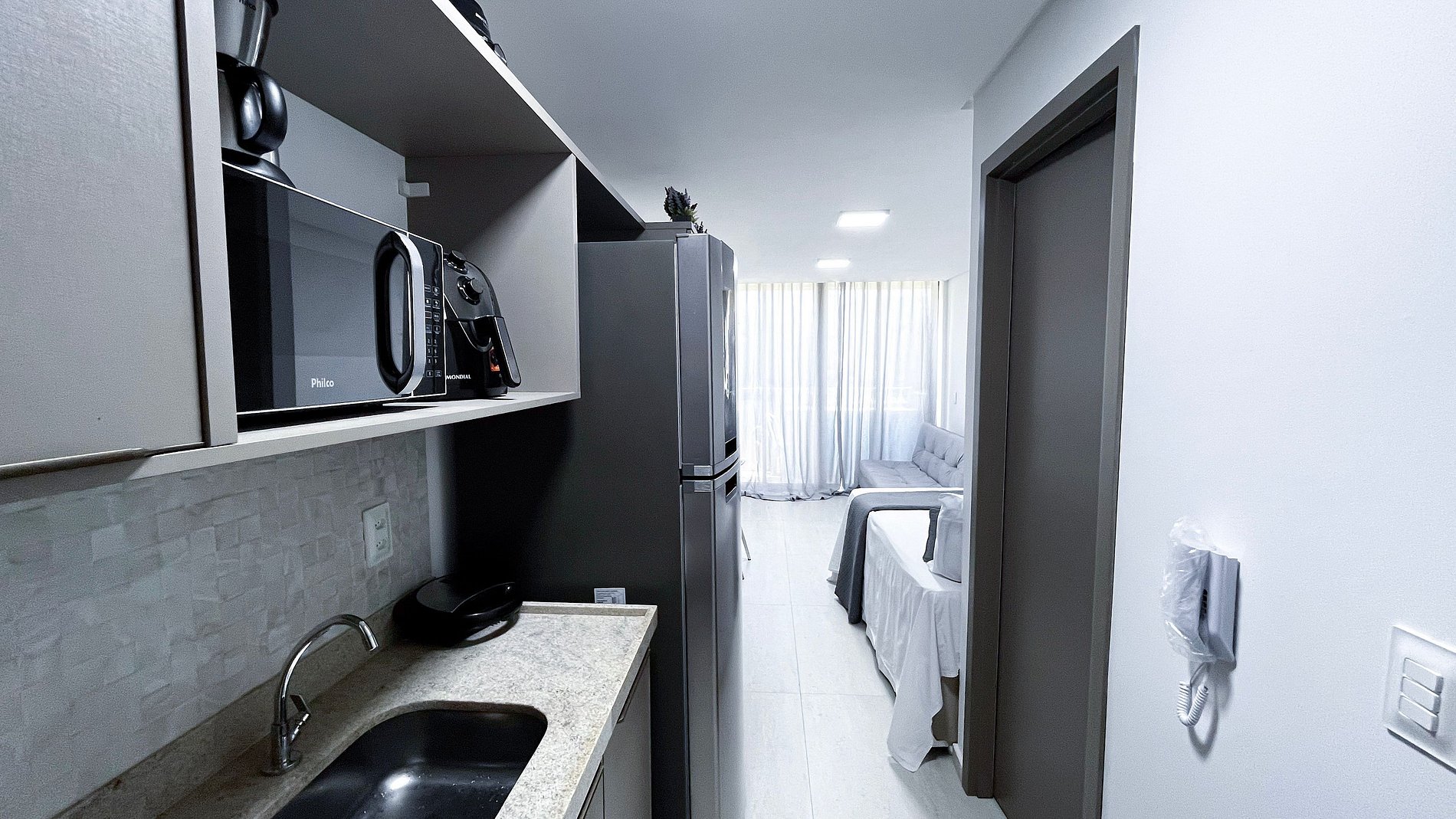 Studio totalmente climatizado, planejado para oferecer conforto e praticidade durante toda a estadia. O ambiente conta com móveis sob medida, TV e ar-condicionado, proporcionando um espaço agradável para descanso e lazer. Dispõe de 01 banheiro privativo e cozinha completa, equipada com louças, copos, panelas, talheres, cooktop, micro-ondas, cafeteira, liquidificador, airfryer, sanduicheira, geladeira e diversos utensílios, garantindo comodidade no preparo das refeições.