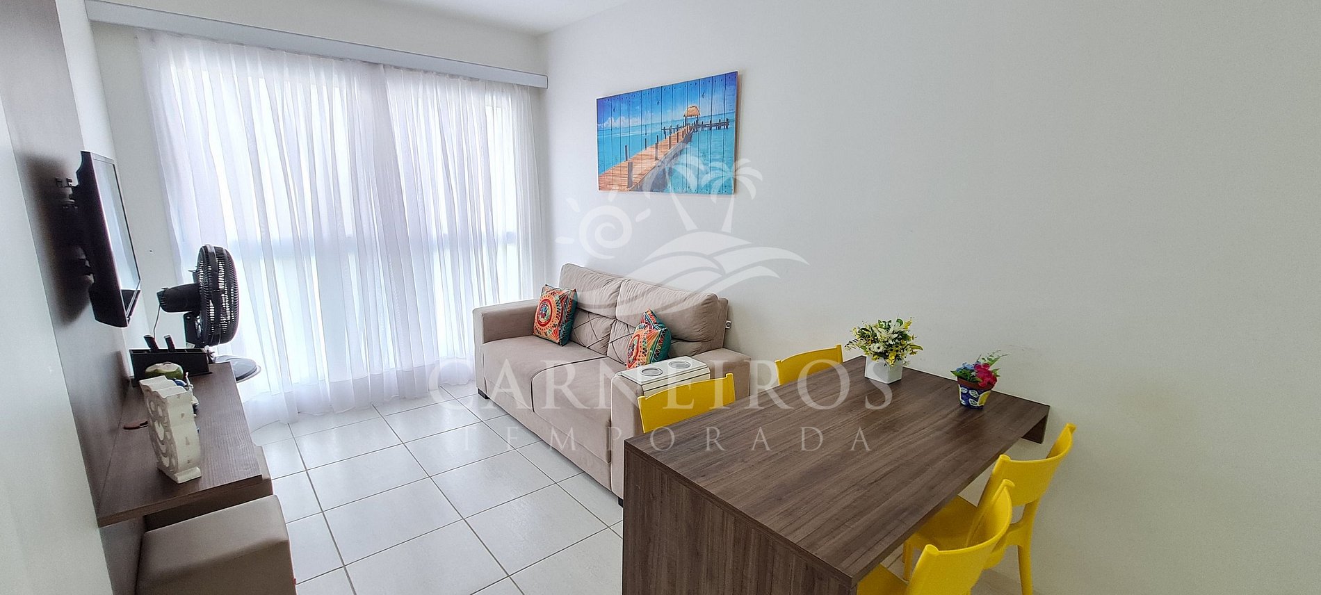 Na sala de estar a decoração minimalista e simples traz toda calmaria que a praia passa, tendo uma TV e sofá. A cozinha é completa e equipada com os principais itens como louça, copos, panelas, talheres, sanduicheira, liquidificador, micro-ondas, fogão 04 bocas, geladeira e diversos utensílios. Além disso, temos uma mesa de vidro com quatro cadeiras. Há também 1 banheiro completo com ducha quente que atende às necessidades diárias.