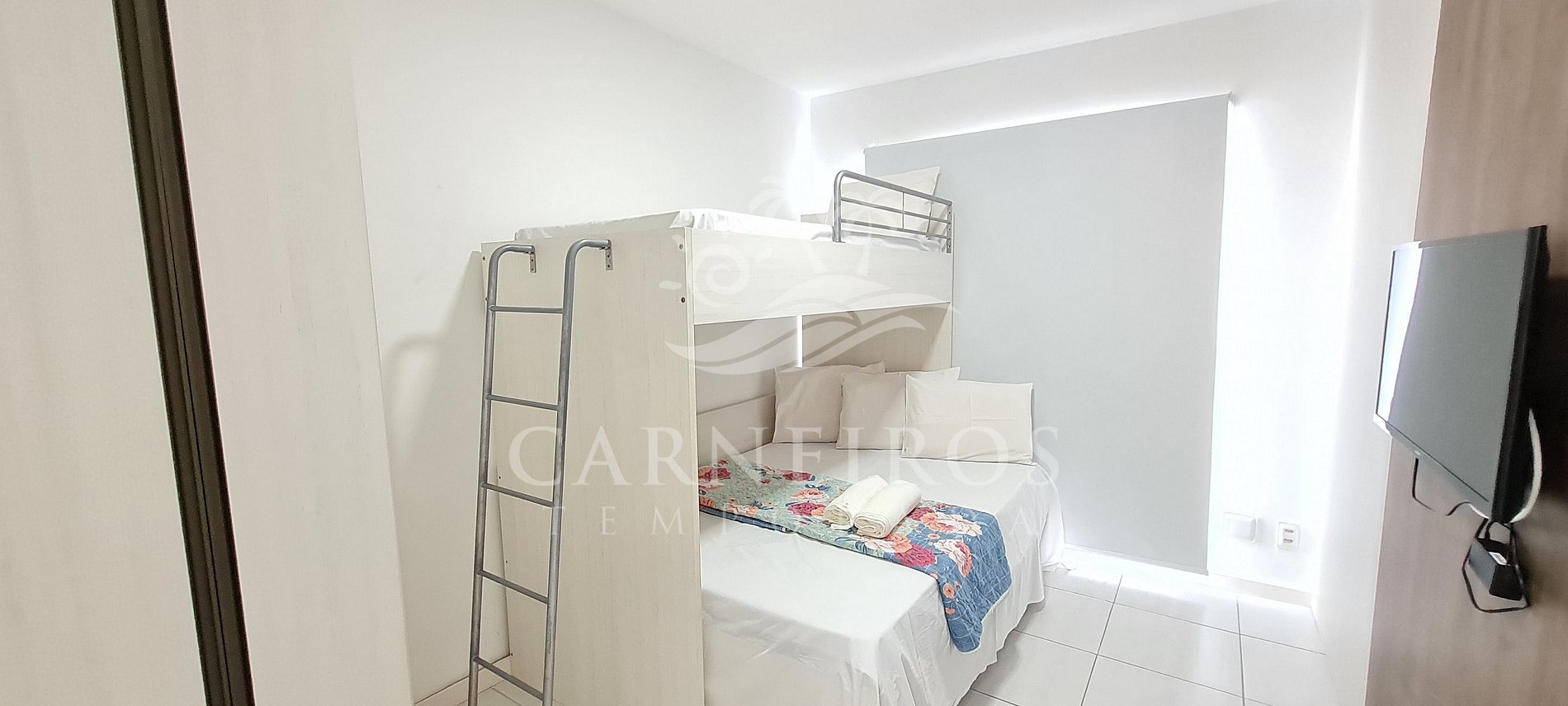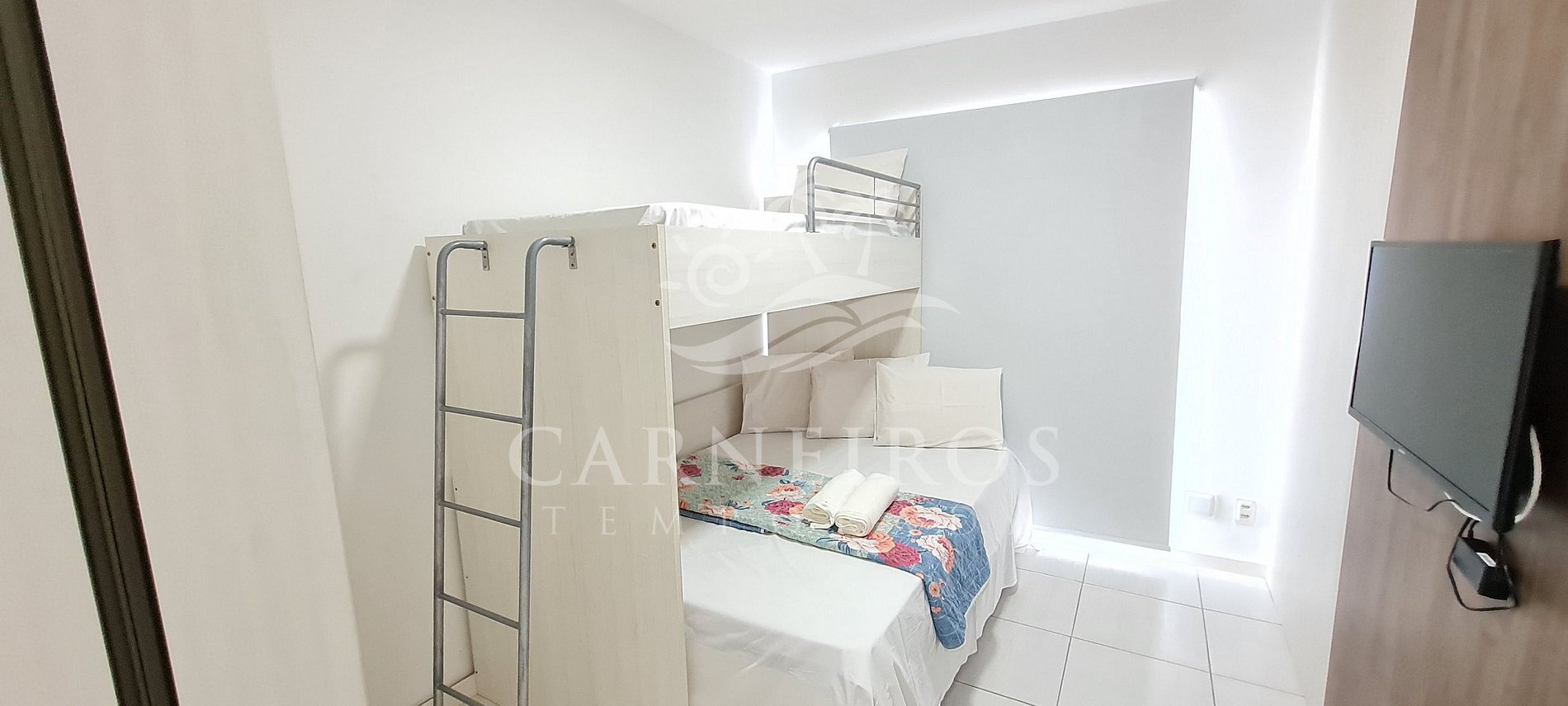 - Quarto 01: cama de casal com uma beliche de solteiro e bicama, armário para roupas e ar-condicionado split.