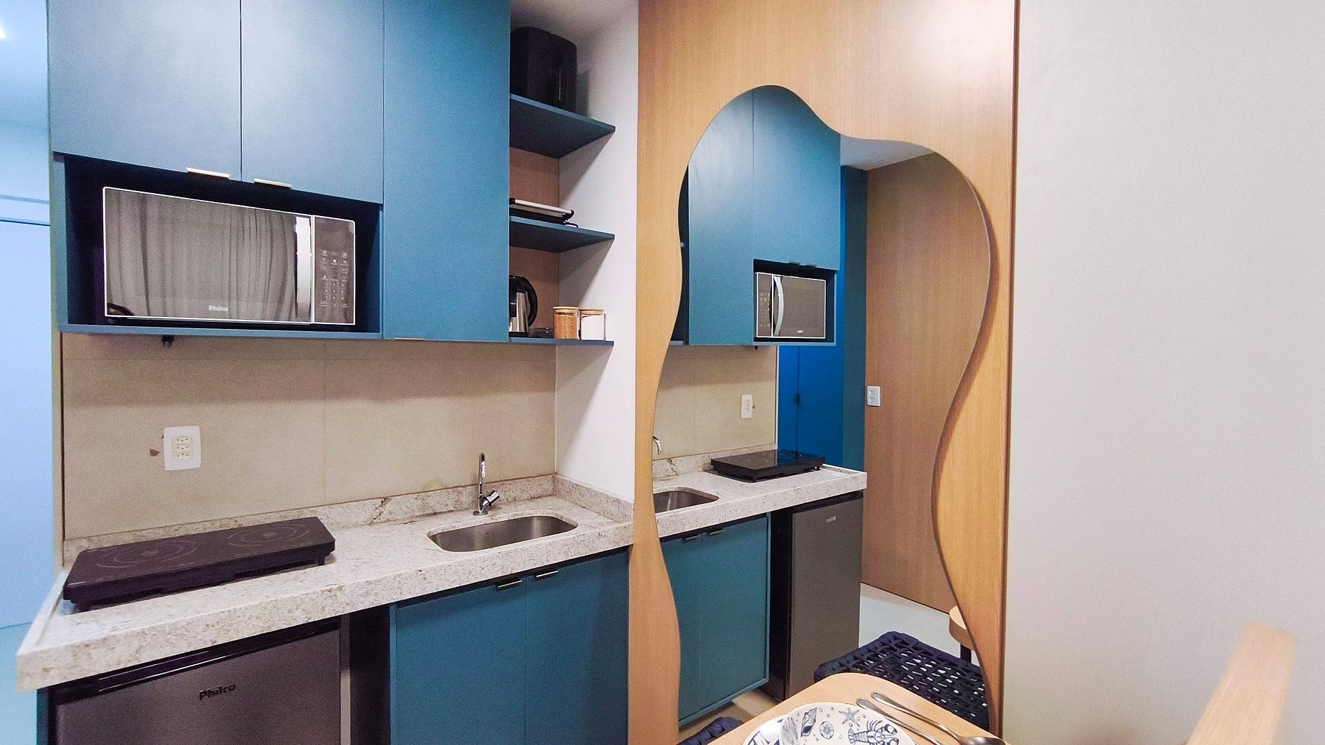 Com ambiente integrado e decoração moderna e aconchegante, o espaço foi pensado para oferecer conforto e praticidade. Conta com ar-condicionado, TV, Wi-Fi e armários, garantindo uma estadia funcional e agradável. A cozinha é completa e bem equipada, com frigobar, fogão, micro-ondas, sanduicheira, airfryer e utensílios diversos, permitindo preparar refeições com facilidade durante a estadia. O estúdio dispõe ainda de uma bancada interna com dois bancos e, na varanda, duas cadeiras, criando ambientes perfeitos tanto para refeições quanto para momentos de descanso.