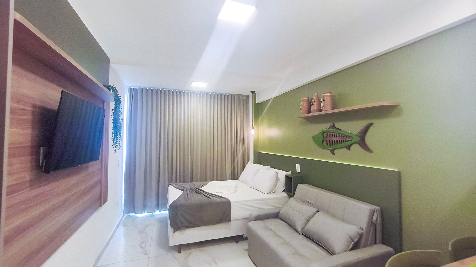 Acomoda 04 pessoas: 01 cama de casal + 01 sofá cama, TV e ar-condicionado.