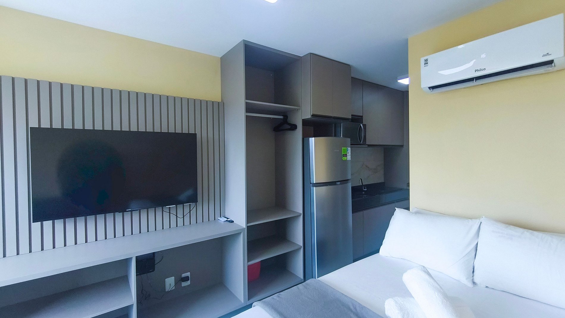 Conta com uma suíte confortável, equipada com cama de casal, sofá-cama, mesa com cadeiras, ar-condicionado e TV. A cozinha é compacta e funcional, dispondo dos principais itens para sua estadia: louças, copos, panelas, talheres, geladeira, micro-ondas, airfryer e cooktop. O flat possui 1 banheiro completo.
