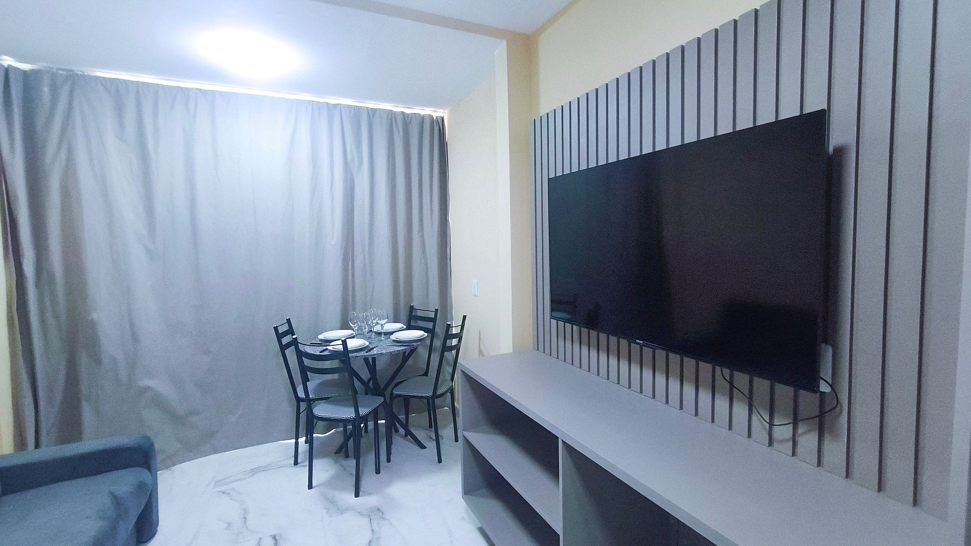 Acomoda até 4 pessoas, com 1 cama de casal e 1 sofá-cama, além de TV e ar-condicionado para maior conforto.