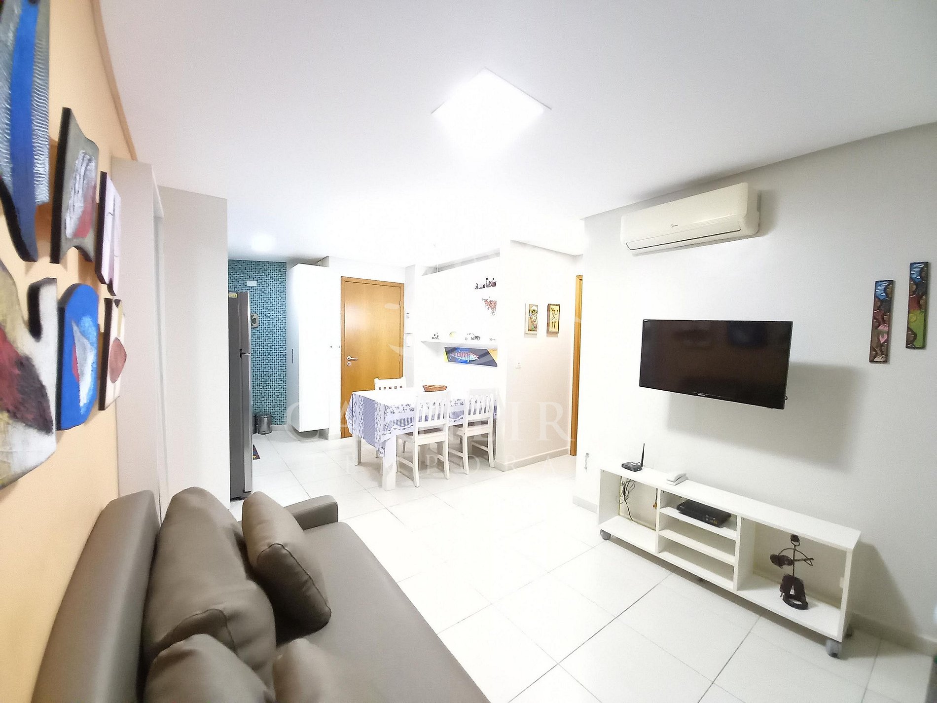 A sala de estar com decoração aconchegante conta com uma TV, sofá-cama de casal e ar-condicionado split. A cozinha é completa e possui itens como louça, copos, panelas, talheres, sanduicheira, micro-ondas, fogão, geladeira e diversos utensílios. Além disso, contém área para refeições com mesa de vidro e 04 cadeiras. O flat possui 01 banheiro completo.