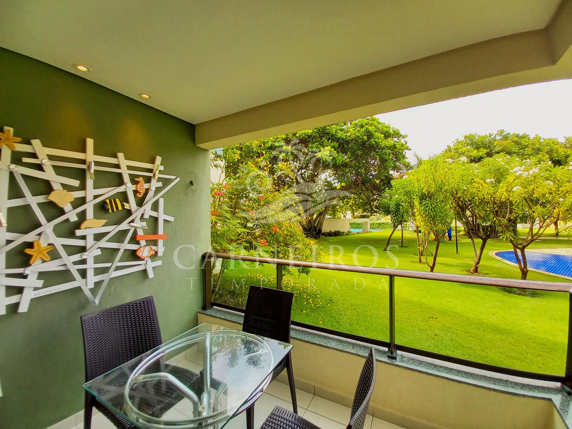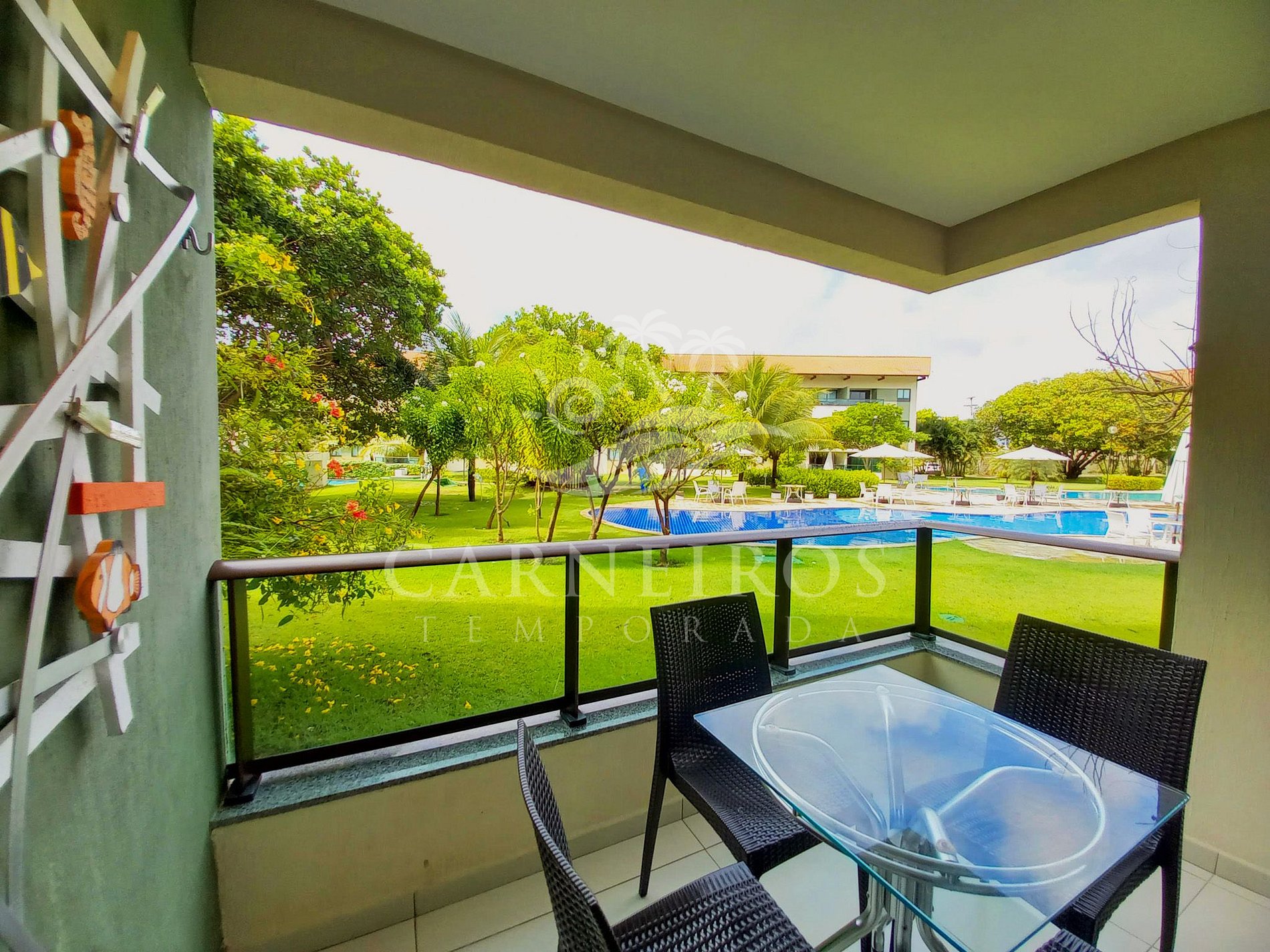 ✹ O flat se encontra no térreo do prédio com vista para piscina e possui uma linda varanda com quatro cadeiras e mesa ✹