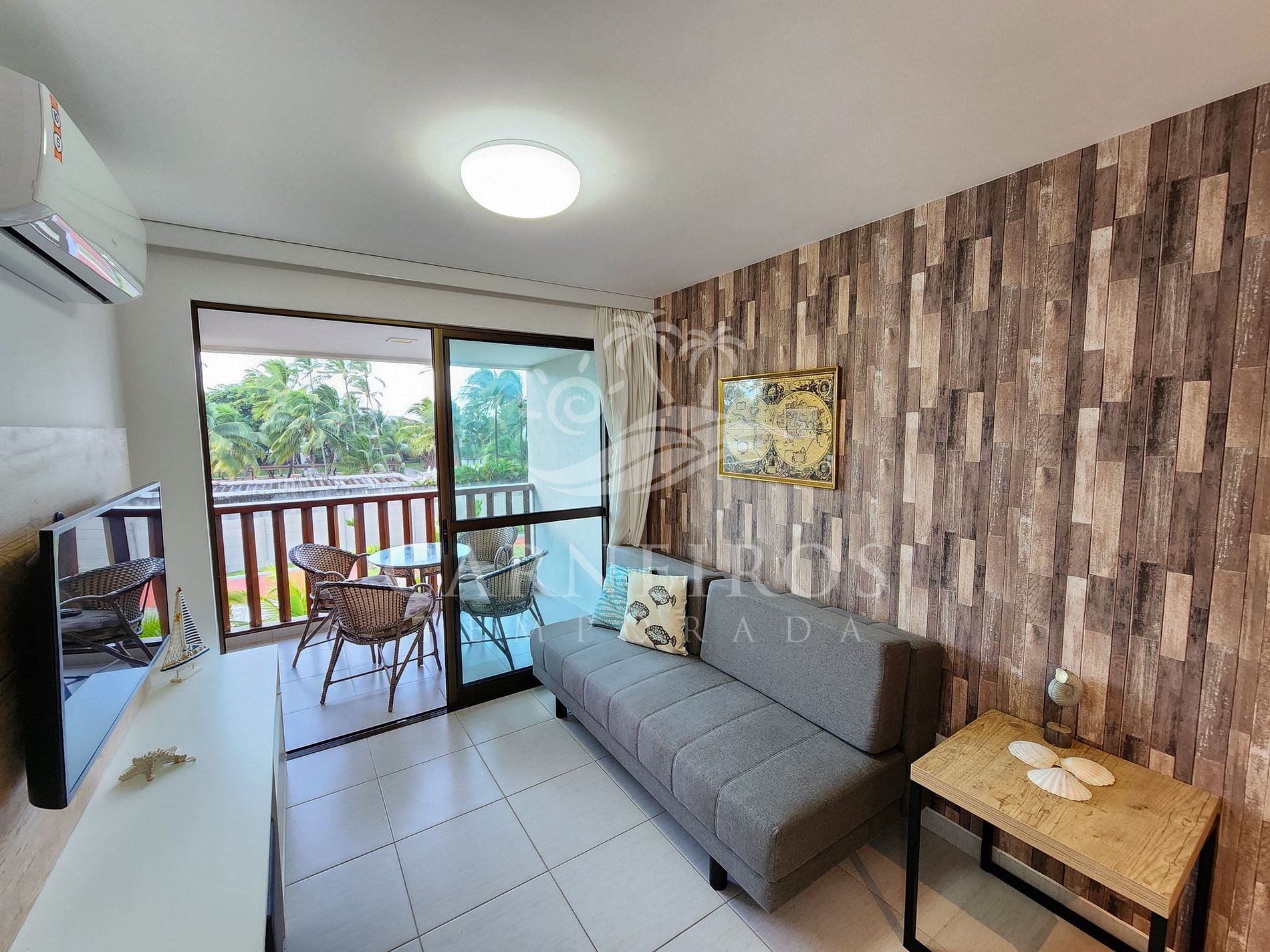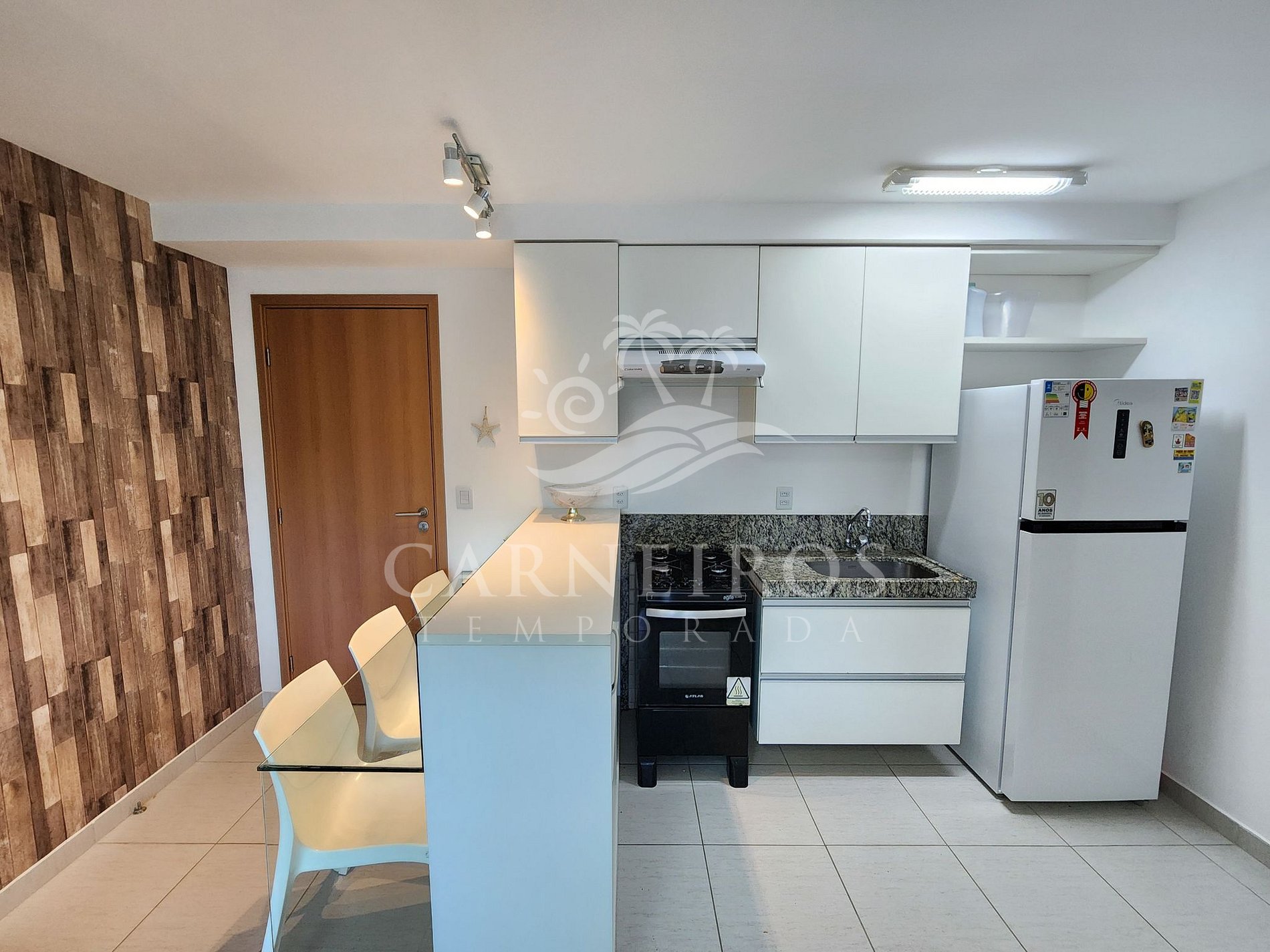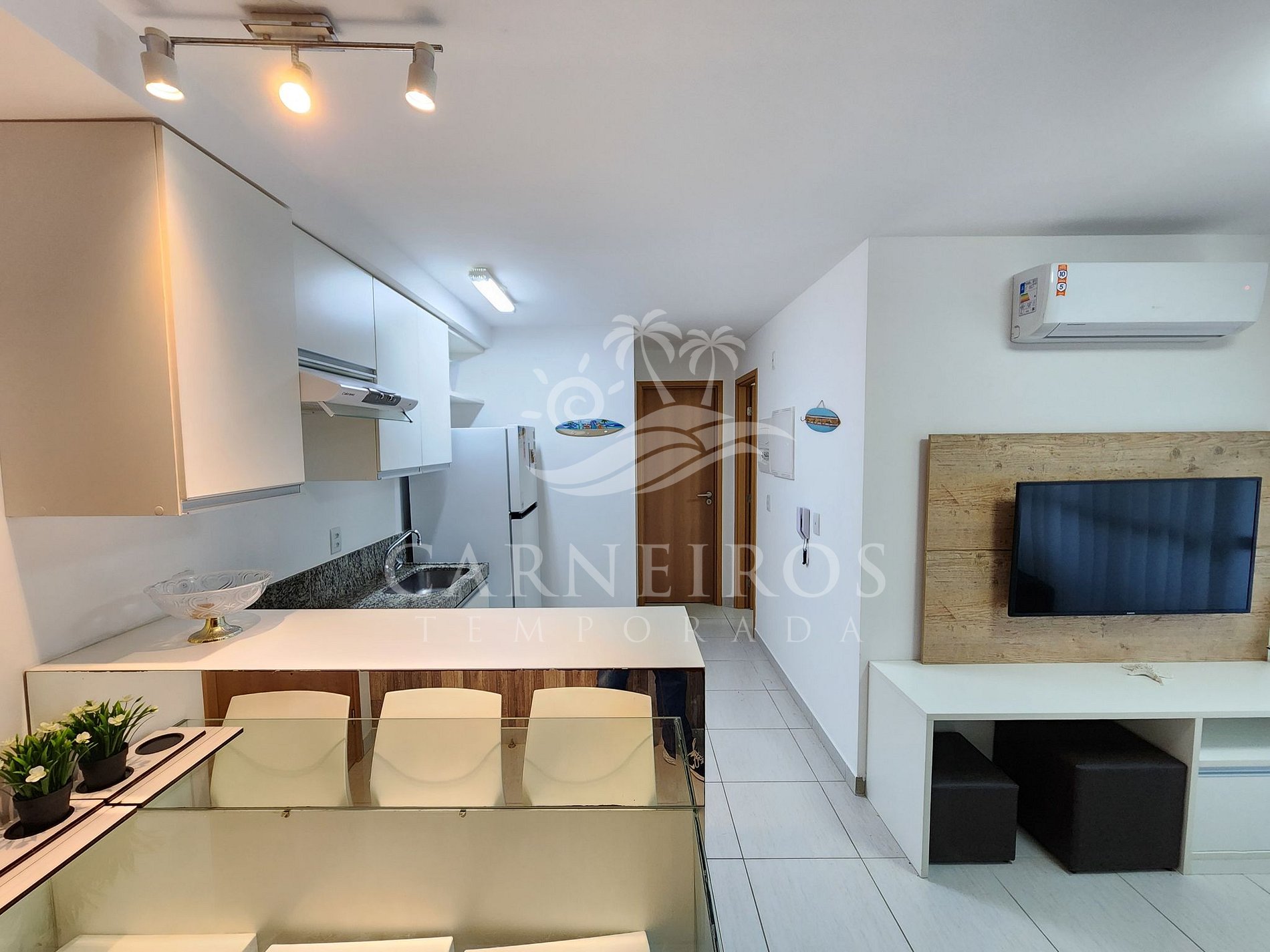 A sala tem uma agradável decoração com TV, sofá-cama de casal e mesa de jantar com 3 cadeiras. A cozinha é completa e equipada com os principais utensílios como geladeira, micro-ondas, fogão, forno, liquidificador, sanduicheira, torradeira, cafeteira, airfryer, churrasqueira elétrica, cervejeira e outros. Possui também 1 banheiro social com box, armário e chuveiro quente, além do banheiro da suíte.