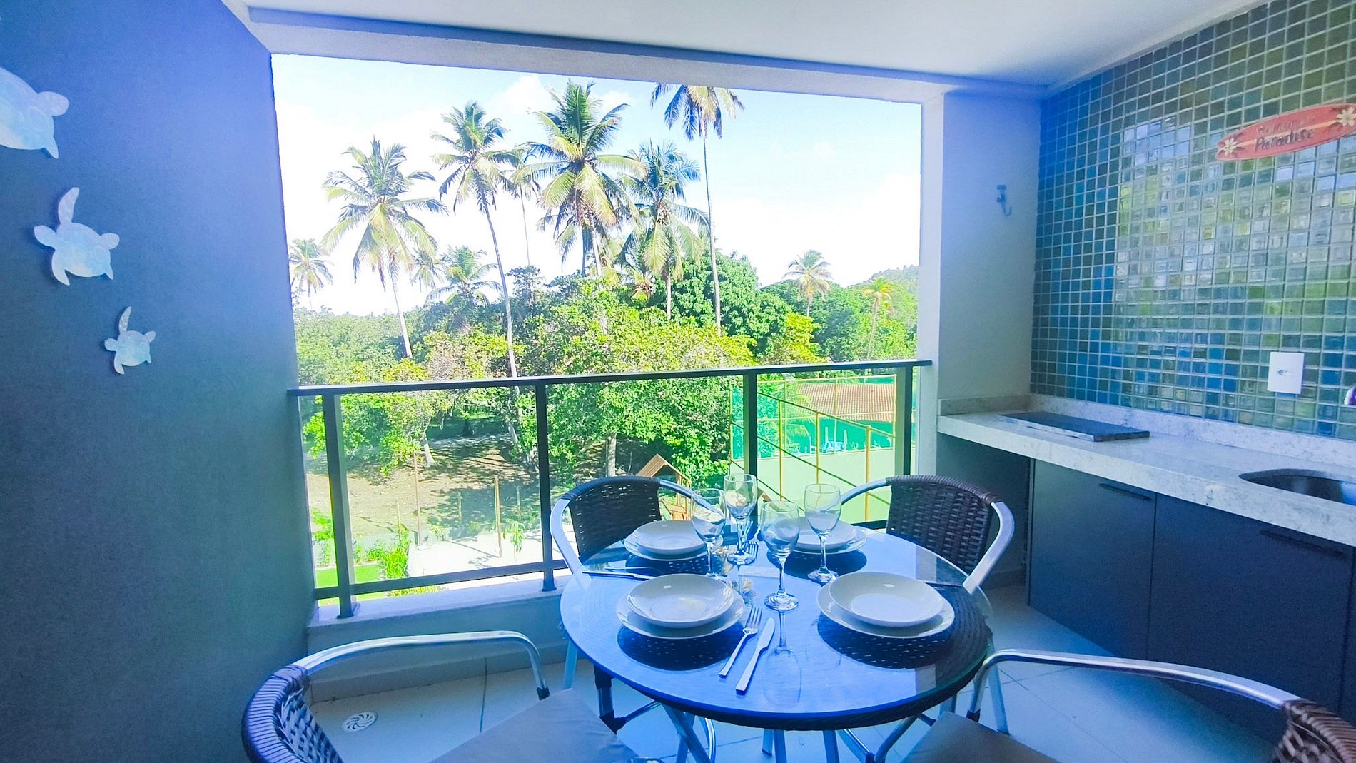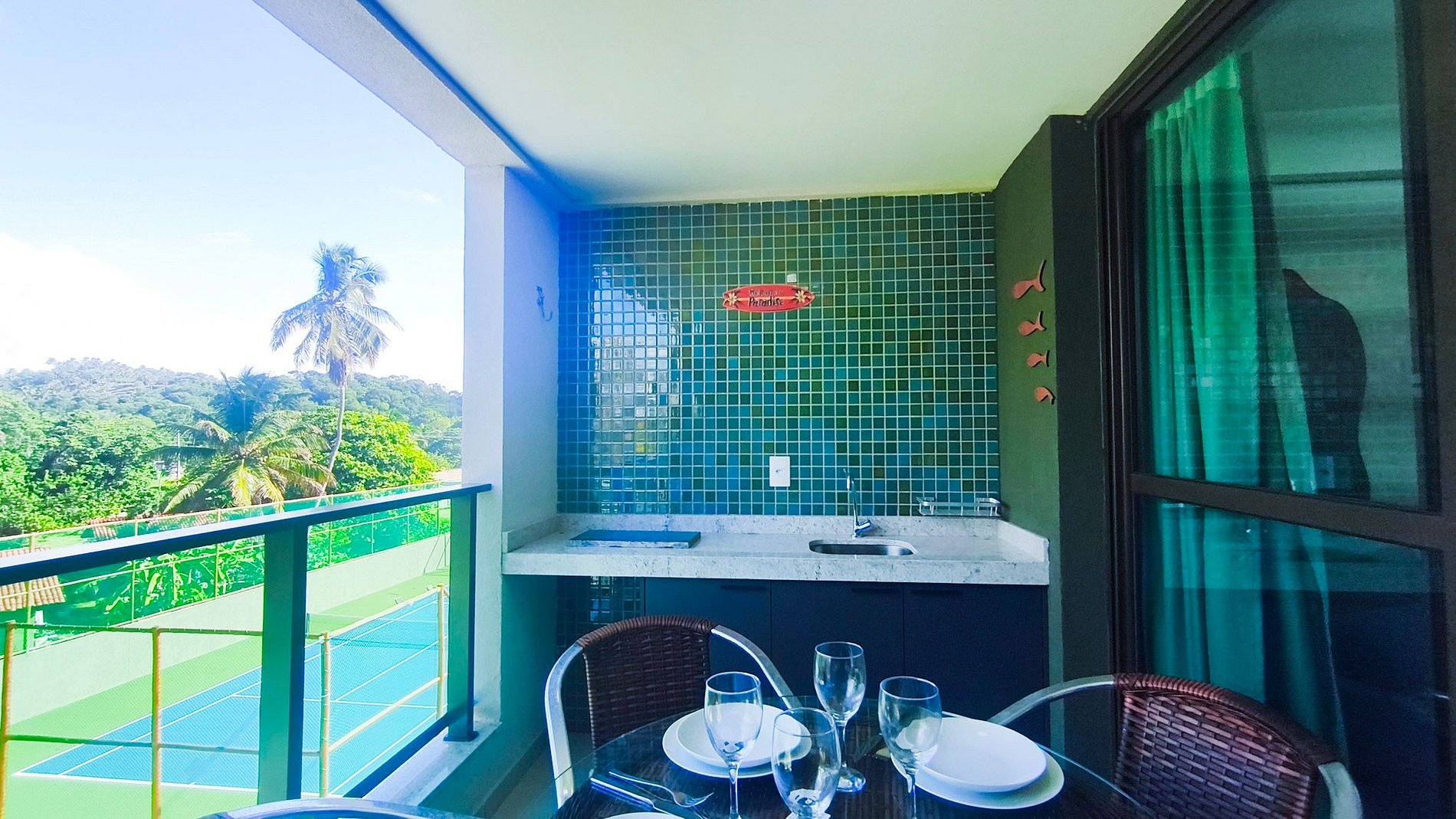 Varanda - Unidade no 3º andar com vista para a piscina e playground, equipada com mesa, cadeiras e cervejeira.