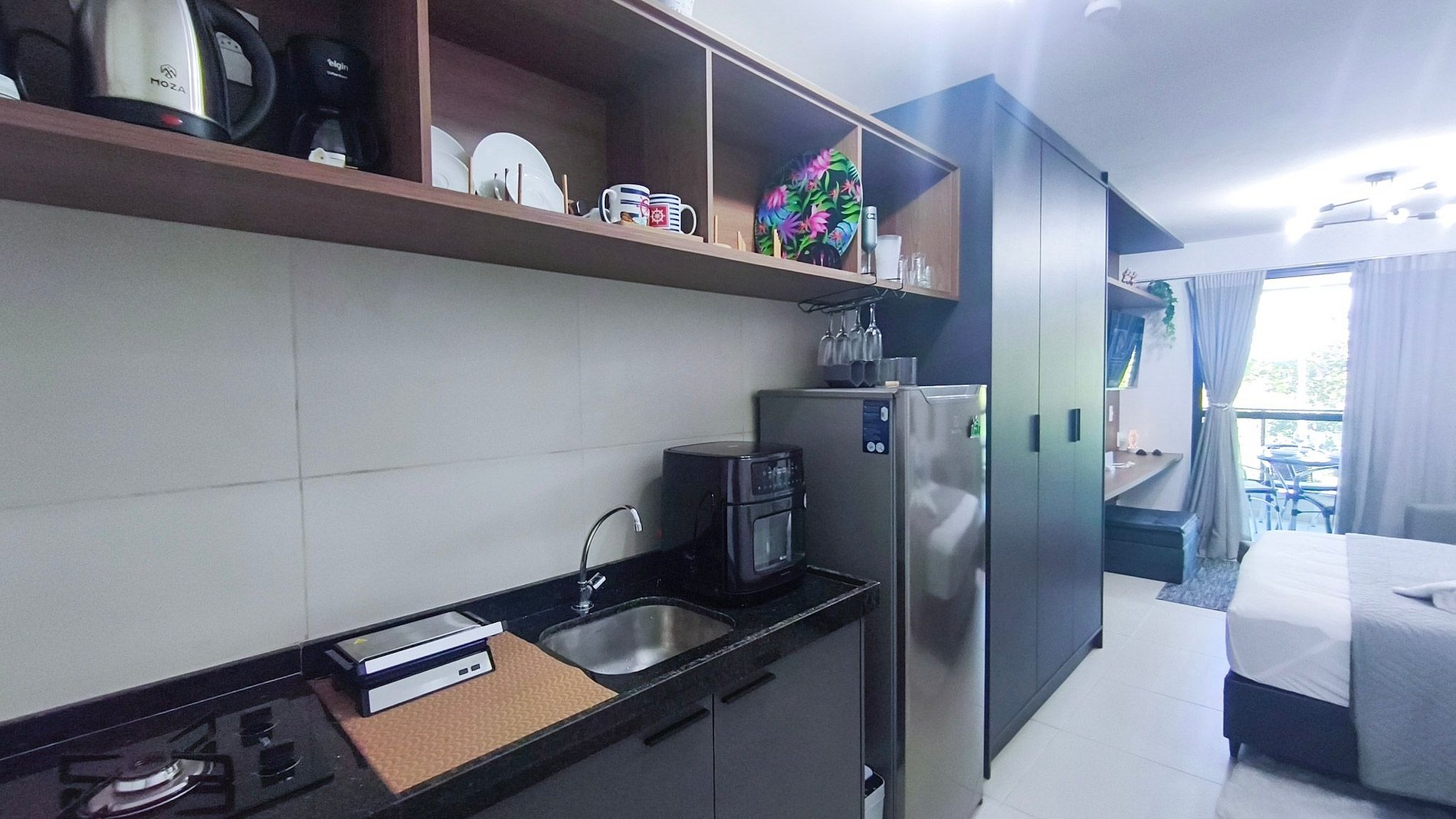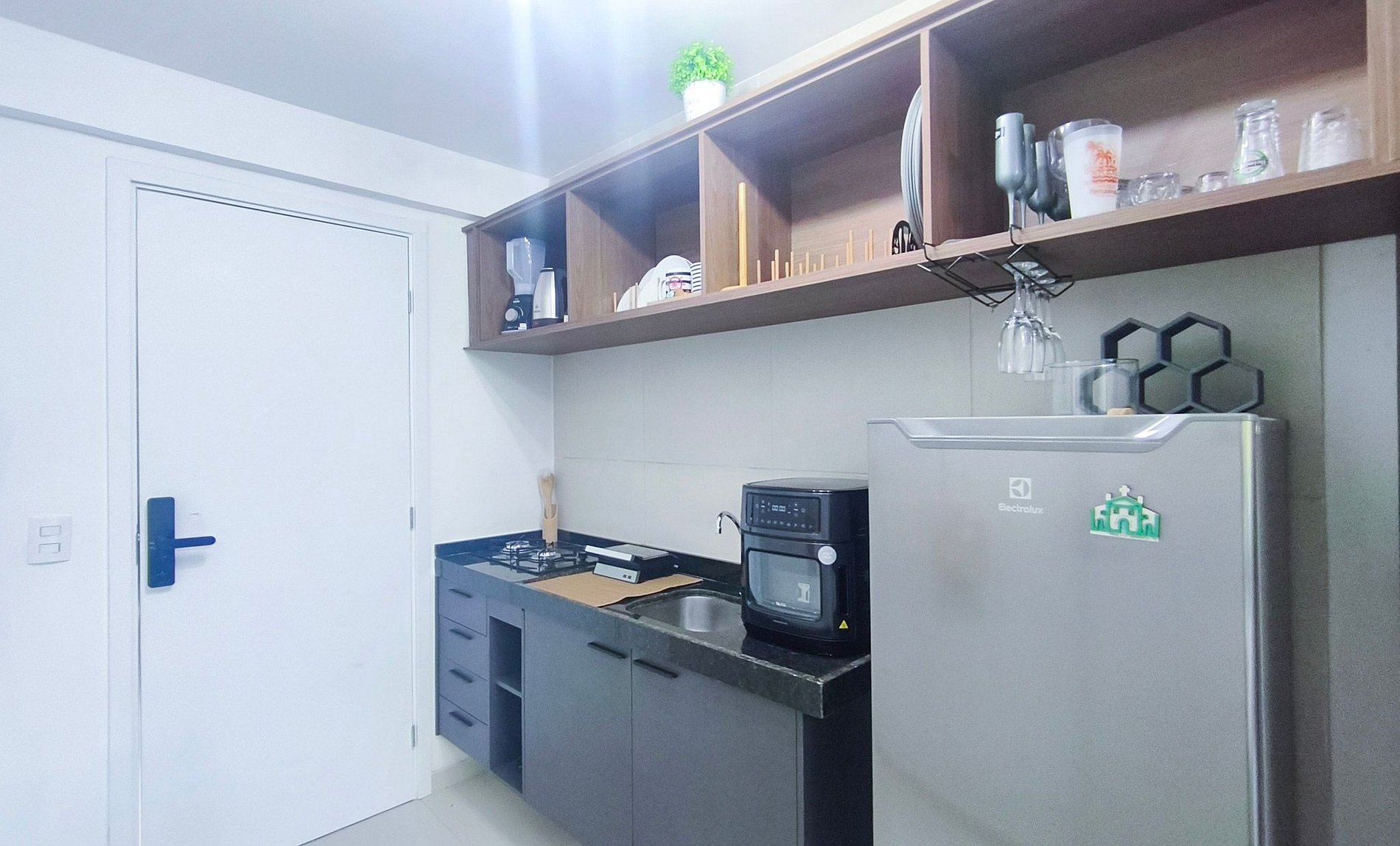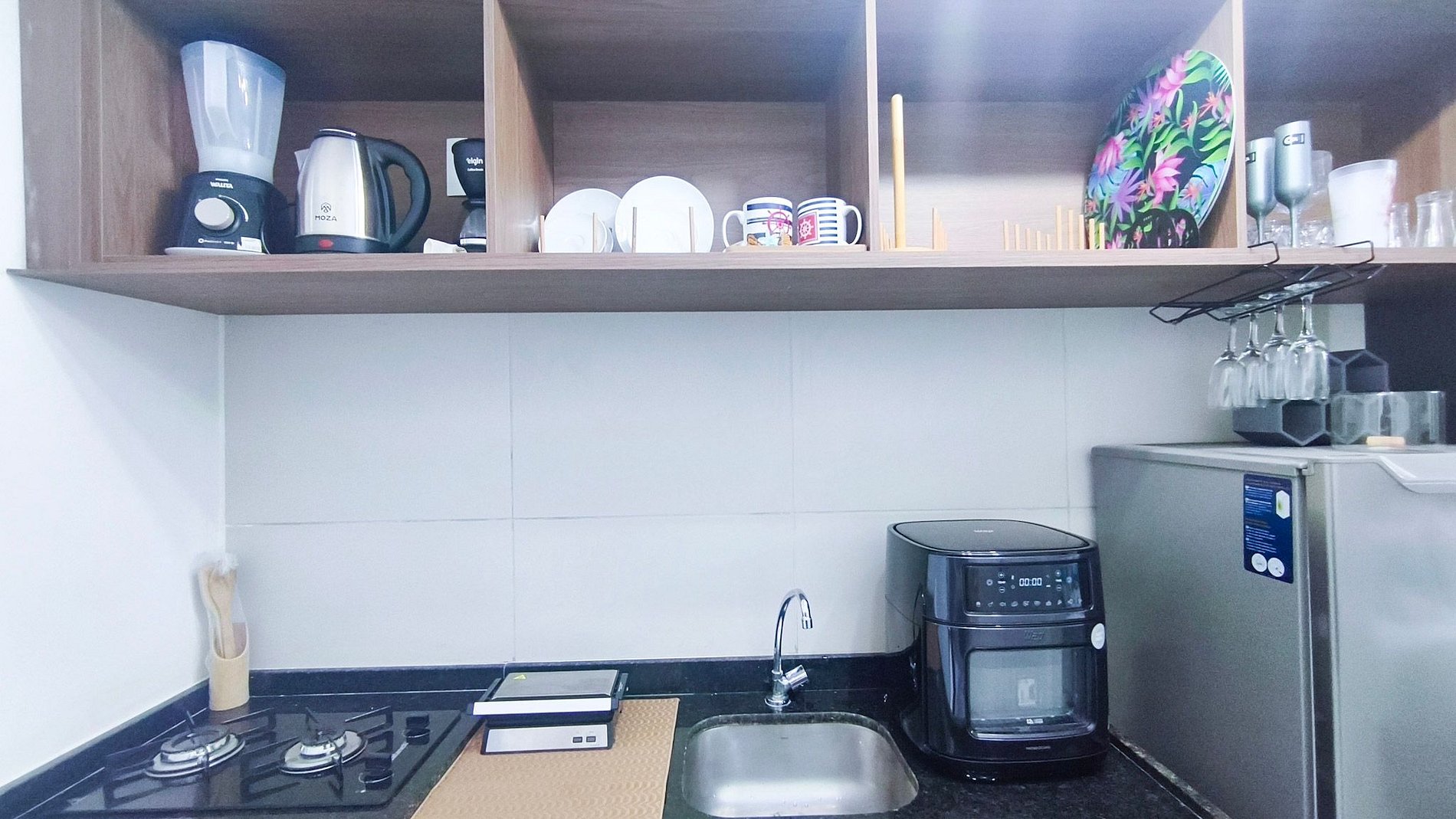 Cozinha - Equipada com cooktop, geladeira, airfryer, cafeteira, sanduicheira, liquidificador, louças, panelas e diversos utensílios.