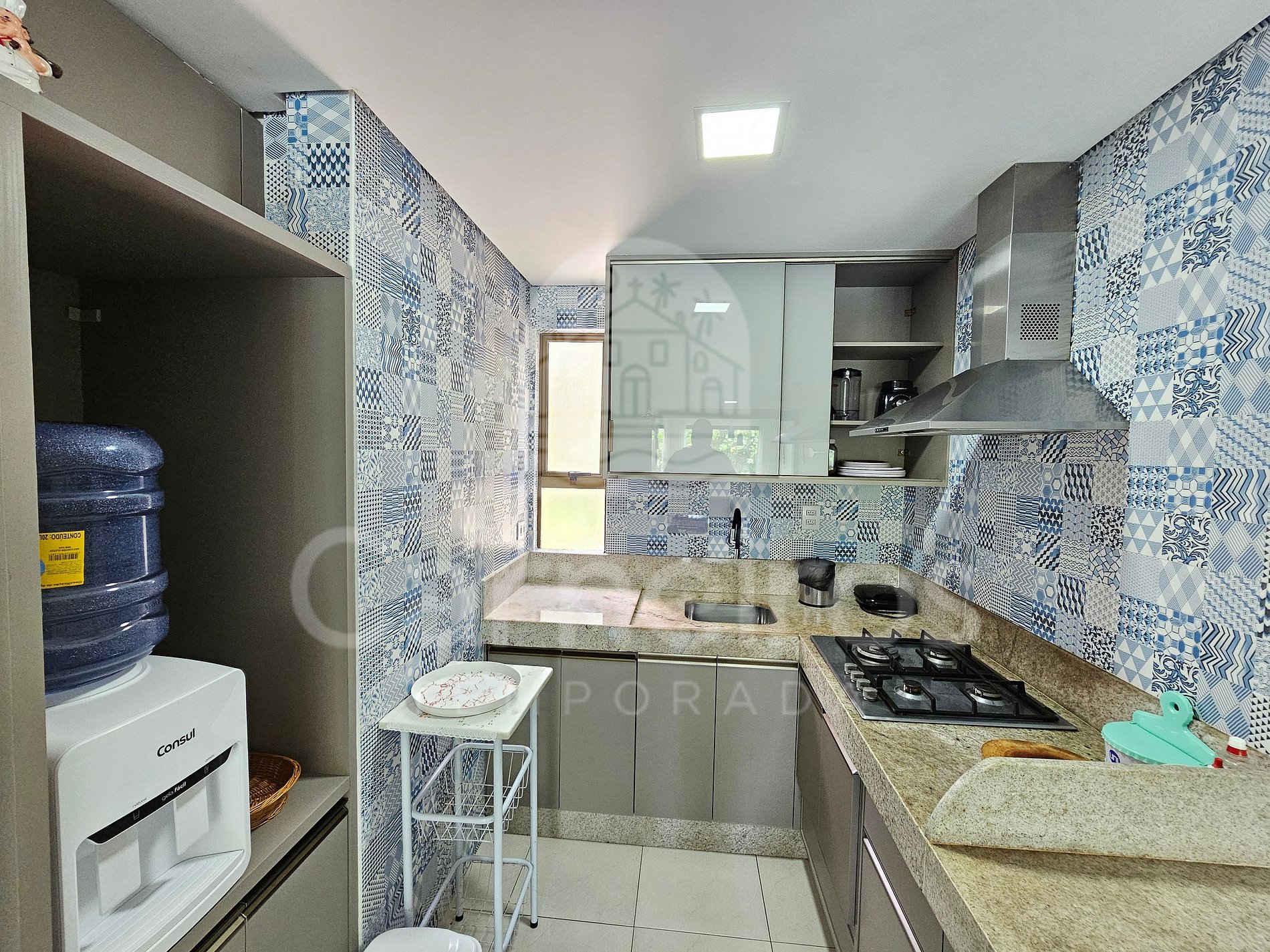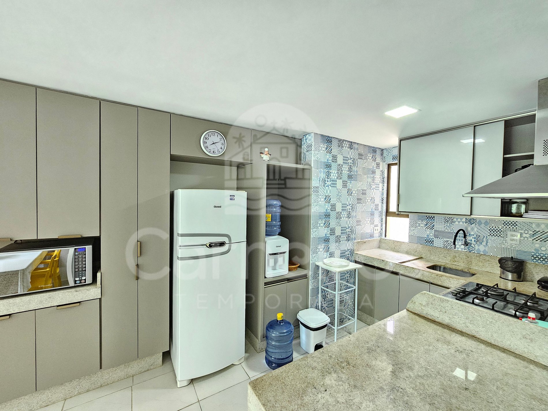 • Cozinha equipada (louça, copos, panelas, talheres, sanduicheira, micro-ondas, fogão 4 bocas, geladeira, liquidificador e utensílios);